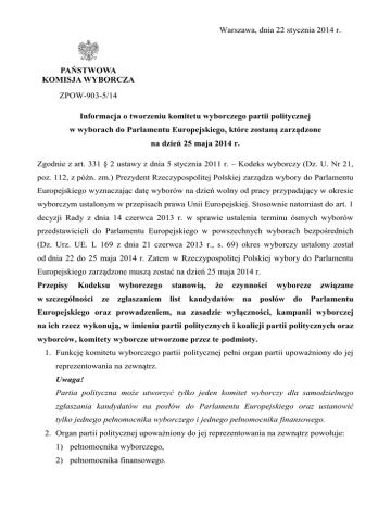 Warszawa, dnia 22 stycznia 2014 r. PAŃSTWOWA KOMISJA WYBORCZA ZPOW-903-5/14 Informacja o tworzeniu komitetu wyborczego partii politycznej w wyborach do Parlamentu Europejskiego, które zostaną zarządzone na dzień 25 maja 2014 r. Zgodnie z art. 331 § 2 ustawy z dnia 5 stycznia 2011 r. – Kodeks wyborczy (Dz. U. Nr 21, poz. 112, z późn. zm.) Prezydent Rzeczypospolitej Polskiej zarządza wybory do Parlamentu Europejskiego wyznaczając datę wyborów na dzień wolny od pracy przypadający w okresie wyborczym ustalonym w przepisach prawa Unii Europejskiej. Stosownie natomiast do art. 1 decyzji Rady z dnia 14 czerwca 2013 r. w sprawie ustalenia terminu ósmych wyborów przedstawicieli do Parlamentu Europejskiego w powszechnych wyborach bezpośrednich (Dz. Urz. UE. L 169 z dnia 21 czerwca 2013 r., s. 69) okres wyborczy ustalony został od dnia 22 do 25 maja 2014 r. Zatem w Rzeczypospolitej Polskiej wybory do Parlamentu Europejskiego zarządzone muszą zostać na dzień 25 maja 2014 r. Przepisy Kodeksu wyborczego stanowią, że czynności wyborcze związane w szczególności ze zgłaszaniem list kandydatów na posłów do Parlamentu Europejskiego oraz prowadzeniem, na zasadzie wyłączności, kampanii wyborczej na ich rzecz wykonują, w imieniu partii politycznych i koalicji partii politycznych oraz wyborców, komitety wyborcze utworzone przez te podmioty. 1. Funkcję komitetu wyborczego partii politycznej pełni organ partii upoważniony do jej reprezentowania na zewnątrz. Uwaga! Partia polityczna może utworzyć tylko jeden komitet wyborczy dla samodzielnego zgłaszania kandydatów na posłów do Parlamentu Europejskiego oraz ustanowić tylko jednego pełnomocnika wyborczego i jednego pełnomocnika finansowego. 2. Organ partii politycznej upoważniony do jej reprezentowania na zewnątrz powołuje: 1) pełnomocnika wyborczego, 2) pełnomocnika finansowego. -2Uwaga! Zgodnie z art. 96 Kodeksu wyborczego można być pełnomocnikiem wyborczym tylko jednego komitetu wyborczego. Zgodnie z art. 127 § 2 i 3 Kodeksu wyborczego pełnomocnik finansowy komitetu wyborczego nie może być kandydatem na posła do Parlamentu Europejskiego, pełnomocnikiem wyborczym komitetu wyborczego, pełnomocnikiem finansowym innego komitetu wyborczego oraz funkcjonariuszem publicznym w rozumieniu art. 115 § 13 Kodeksu Karnego. Zgodnie z tym przepisem funkcjonariuszem publicznym jest: 1) Prezydent Rzeczypospolitej Polskiej; 2) poseł, senator, radny; 3) poseł do Parlamentu Europejskiego; 4) sędzia, ławnik, prokurator, funkcjonariusz finansowego organu postępowania przygotowawczego lub organu nadrzędnego nad finansowym organem postępowania przygotowawczego, notariusz, komornik, kurator sądowy, syndyk, nadzorca sądowy i zarządca, osoba orzekająca w organach dyscyplinarnych działających na podstawie ustawy; 5) osoba będąca pracownikiem administracji rządowej, innego organu państwowego lub samorządu terytorialnego, chyba że pełni wyłącznie czynności usługowe, a także inna osoba w zakresie, w którym uprawniona jest do wydawania decyzji administracyjnych; 6) osoba będąca pracownikiem organu kontroli państwowej lub organu kontroli samorządu terytorialnego, chyba że pełni wyłącznie czynności usługowe; 7) osoba zajmująca kierownicze stanowisko w innej instytucji państwowej; 8) funkcjonariusz organu powołanego do ochrony bezpieczeństwa publicznego albo funkcjonariusz Służby Więziennej; 9) osoba pełniąca czynną służbę wojskową; 10) pracownik międzynarodowego trybunału karnego, chyba że pełni wyłącznie czynności usługowe. 3. Nazwa komitetu wyborczego partii politycznej musi zawierać wyrazy „Komitet Wyborczy” oraz nazwę partii politycznej lub skrót nazwy tej partii, wynikające z wpisu do ewidencji partii politycznych (art. 92 § 1 Kodeksu wyborczego). -34. W przypadku, gdy komitet wyborczy postanowi używać skrótu nazwy komitetu wyborczego, skrót ten musi umożliwiać jego identyfikację przez nawiązanie do pełnej nazwy komitetu. W szczególności skrót nazwy komitetu wyborczego może zawierać wyrazy „Komitet Wyborczy” i skrót nazwy partii politycznej tworzącej komitet lub litery „KW” i nazwę lub skrót nazwy tej partii politycznej. Skrót nazwy może składać się z nie więcej niż 45 znaków drukarskich wliczając spacje. Uwaga! Należy pamiętać, że jeżeli nazwa komitetu wyborczego wraz z wyrazami „Komitet Wyborczy”, przekracza 45 znaków drukarskich wliczając spacje, to podanie skrótu nazwy jest obowiązkowe. Stosownie bowiem do art. 212 § 4 w związku z art. 338 Kodeksu wyborczego oznaczenie listy kandydatów na posłów do Parlamentu Europejskiego na urzędowych obwieszczeniach oraz na karcie do głosowania może składać się z nie więcej niż 45 znaków drukarskich wliczając spacje. 5. Organ partii politycznej upoważniony do jej reprezentowania na zewnątrz zawiadamia Państwową Komisję Wyborczą o utworzeniu komitetu wyborczego oraz zamiarze samodzielnego zgłaszania kandydatów. Zawiadomienie to musi być dokonane w terminie do 50. dnia przed dniem wyborów (art. 204 § 2 Kodeksu wyborczego w związku z art. 338). W związku z tym, że 50. dzień przed dniem wyborów wypada w sobotę, to zgodnie z art. 9 § 2 Kodeksu wyborczego zawiadomienie musi zostać złożone najpóźniej w dniu 7 kwietnia 2014 r. do godz. 16.15. Zawiadomienia można składać w siedzibie Państwowej Komisji Wyborczej w Warszawie przy ul. Wiejskiej 10, od dnia ogłoszenia w Dzienniku Ustaw postanowienia Prezydenta Rzeczypospolitej Polskiej o zarządzeniu wyborów. Zawiadomienie w formie pisemnej wraz z załącznikami może być złożone przez osobę upoważnioną przez organ partii politycznej lub w inny sposób doręczone Państwowej Komisji Wyborczej (np. pocztą). W razie wysłania pocztą o dotrzymaniu terminu złożenia zawiadomienia rozstrzyga data wpływu przesyłki do Państwowej Komisji Wyborczej (art. 9 § 1 Kodeksu wyborczego). 6. Za