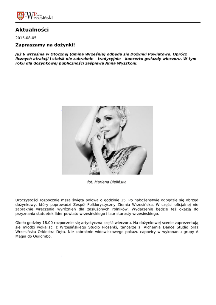 Aktualności 2015-08-05 Zapraszamy na dożynki! Już 6 września w Otocznej (gmina Września) odbędą się Dożynki Powiatowe. Oprócz licznych atrakcji i stoisk nie zabraknie – tradycyjnie – koncertu gwiazdy wieczoru. W tym roku dla dożynkowej publiczności zaśpiewa Anna Wyszkoni. fot. Marlena Bielińska Uroczystości rozpocznie msza święta polowa o godzinie 15. Po nabożeństwie odbędzie się obrzęd dożynkowy, który poprowadzi Zespół Folklorystyczny Ziemia Wrzesińska. W części oficjalnej nie zabraknie wręczenia wyróżnień dla zasłużonych rolników. Wydarzenie będzie też okazją do przyznania statuetek lider powiatu wrzesińskiego i laur starosty wrzesińskiego. Około godziny 18.00 rozpocznie się artystyczna część wieczoru. Na dożynkowej scenie zaprezentują się młodzi wokaliści z Wrzesińskiego Studio Piosenki, tancerze z Alchemia Dance Studio oraz Wrzesińska Orkiestra Dęta. Nie zabraknie widowiskowego pokazu capoeiry w wykonaniu grupy A Magia do Quilombo. Na gości, którzy odwiedzą tego dnia Otoczną, czekać będą liczne stoiska, m.in. z rękodziełem, oraz degustacje, a także ciesząca się co roku dużą popularnością loteria fantowa z cennymi nagrodami. Dla dzieci przewidziano dmuchańce, zabawy i inne. Koncert Wyszkoni zaplanowany jest na godzinę 20.00. Artystka zaśpiewa swoje największe przeboje w stylistyce pop-rockowej, m.in. Wiem, że jesteś tam, Czy ten pan i pani, Biegnij przed siebie. Tegoroczne dożynki powiatowe zakończą się około północy zabawą taneczną. (agda) Dożynki, czyli obrzęd dziękczynny za ukończenie żniw i zebrane plony, są obchodzone od zamierzchłych czasów. Aby kontynuować tę bogatą i cenną tradycję, warto wziąć udział w święcie plonów organizowanym przez Starostwo Powiatowe, w tym roku we współpracy z Urzędem Miasta i Gminy Września. Odbędzie się ono 6 września w Otocznej, a oto tegoroczni starostowie dożynek powiatowych. Starościna tegorocznych dożynek powiatowych, Sylwia Kiernikowska, ma 38 lat i razem z mężem prowadzi gospodarstwo rolne w Szamarzewie. Gospodarują wspólnie na 70 ha, z których zdecydowana większość jest położona na terenie gminy Kołaczkowo. Specjalizują się w uprawie zboża i kukurydzy, ale prowadzą również hodowlę bydła mięsnego. Sylwia Kiernikowska w Szamarzewie mieszka dopiero od 13 lat, ale pochodzi ze wsi – wychowała się w Gutowie Małym. – Tam też mieliśmy podobne gospodarstwo, ale bez hodowli. Lubię wieś i nie wyobrażam sobie życia w dużym mieście. Po każdej wizycie np. w Poznaniu z chęcią wracam do siebie – opowiada starościna. Sylwia Kiernikowska ma wykształcenie rolnicze, ale ukończyła również studium położnicze i przez 10 lat pracowała we wrzesińskim szpitalu na oddziale neonatologicznym. Ma też świetny kontakt ze zwierzętami. Krok w krok chodzi za nią po podwórku znaleziona w lesie suczka – mieszaniec w typie sznaucera, która broni swojej pani i nikomu obcemu nie pozwala się do siebie zbliżyć. Obecnie poza gospodarstwem państwo Kiernikowscy prowadzą również działalność gospodarczą. Oferują usługi rolnicze i transportowe, zajmują się też skupem i sprzedażą zbóż. – Osobiście nie mam wiele wspólnego z codzienną pracą na farmie. Zajmuję się za to załatwianiem formalności związanych z prowadzeniem gospodarstwa i firmy. Z tym że w obecnych czasach papierkowej roboty jest prawie drugie tyle, co w polu i w obejściu. Podkreśla jednak, że lubi to robić. – Dobrze jest być na swoim, pracować na siebie i nie mieć szefa nad sobą – dodaje starościna. Najtrudniejsza w jej pracy jest dobra organizacja. – Wszystkiego można się nauczyć, ale potrzeba na to czasu. A tego Sylwia Kiernikowska nie ma zbyt wiele, ale, jak sama mówi, jeśli takowy się znajdzie, starają się z mężem nie zaniedbywać kontaktów ze znajomymi i z rodziną. Na wakacje raczej nie wyjeżdżają. – W gospodarstwie, w którym jest hodowla, a do tego działa firma, zawsze jest coś do zrobienia – tłumaczy starościna, ale nie żałuje. – Ważne, by interesować się tym, co się robi i lubić to. A kto chce pracować, odnosi sukces – podsumowuje. W związku z rezygnacją Krzysztofa Egierta zmienił się starosta dożynek, którym został Ireneusz Kasprowicz. Ma 50 lat i wspólnie z rodziną prowadzi w Otocznej 46-hektarowe gospodarstwo. Specjalizuje się głównie w produkcji roślinnej – uprawia kukurydzę, rzepak i pszenicę. Ma też niewielką hodowlę trzody chlewnej, którą jednak stopniowo likwiduje. – Hodowla świń stała się w ostatnich latach mało opłacalna, a podejrzewam, że, ze względu na tegoroczną suszę, w przyszłym roku na zyski również nie ma co liczyć – tłumaczy starosta. Z tegorocznych żniw jest jednak zadowolony. – Pogoda w czasie zbiorów była idealna, plon w zbożach ozimych też był dość dobry. Z powodu braku opadów najbardziej ucierpiały zboża jare – podsumowuje. Ireneusz Kasprowicz ma wykształcenie rolnicze – ukończył technikum na poznańskim Golęcinie, a następnie studium na Akademii Rolniczej w Poznaniu. Jego dwaj nastoletni synowie podzielają zainteresowania ojca i chętnie pomagają mu w pracach polowych. – Poza tym jednak, jak większość rówieśników, większość wolnego czasu spędzają przed komputerem – śmieje się starosta dożynek. Rolnictwo nie jest również jedyną pasją Ireneusza Kasprowicza. Interesuje go historia, a szczególnie genealogia. Badając dzieje swoich przodków, dotarł do danych aż z 1790 roku. – Najwięcej informacji udało mi się zebrać o rodzinie mojej babci – opowiada z dumą starosta. Jego rodzina jest mocno zakorzeniona w okolicy, a ziemię, na której on gospodaruje, kupił w XIX wieku jego pradziadek pochodzący z Szemborowa. – Jestem z Otocznej, wychowałem się tu i chodziłem do tej samej szkoły, do której teraz chodzą moi synowie. Zresztą nasze gospodarstw