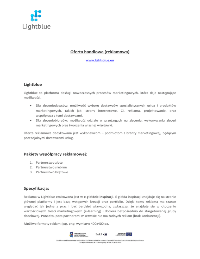 Oferta handlowa (reklamowa) www.light-blue.eu Lightblue Lightblue to platforma obsługi nowoczesnych procesów marketingowych, która daje następujące możliwości. Dla zleceniodawców: możliwość wyboru dostawców specjalistycznych usług i produktów marketingowych, takich jak: strony internetowe, CI, reklama, projektowanie, oraz współpraca z tymi dostawcami. Dla zleceniobiorców: możliwość udziału w przetargach na zlecenia, wykonywania zleceń marketingowych oraz tworzenia własnej wizytówki. Oferta reklamowa dedykowana jest wykonawcom – podmiotom z branży marketingowej, będącym potencjalnymi dostawcami usług. Pakiety współpracy reklamowej: 1. Partnerstwo złote 2. Partnerstwo srebrne 3. Partnerstwo brązowe Specyfikacja: Reklama w Lightblue emitowana jest w e-giełdzie inspiracji. E giełda inspiracji znajduje się na stronie głównej platformy i jest bazą wstępnych kreacji oraz portfolio. Dzięki temu reklama ma szanse wyglądać jak jedna z prac i być bardziej wiarygodna, zwłaszcza, że znajduje się w otoczeniu wartościowych treści marketingowych (e-learning) i dociera bezpośrednio do stargetowanej grupy docelowej. Ponadto, poza partnerami w serwisie nie ma żadnych reklam (brak konkurencji). Możliwe formaty reklam: jpg, png; wymiary: 400x400 px. Niniejsza oferta kierowana jest głównie do firm z branży szeroko rozumianego marketingu, m.in.: Agencji reklamowych, Agencji interaktywnych, Agencji IT, Agencji PR. Oferta cenowa Rodzaj pakietu Pakiet złoty Pakiet srebrny Pakiet brązowy Typ reklamy Prawdopodobieństwo wyświetlenia się reklam po przeładowaniu strony: 60% Plus: status renomowanego dostawcy (Zleceniodawcy otrzymują sugestie, aby korzystać z Twoich usług) Prawdopodobieństwo wyświetlenia się reklam po przeładowaniu strony: 30% Prawdopodobieństwo wyświetlenia się reklam po przeładowaniu strony: 10% Cena 1500 zł 500 zł 250 zł