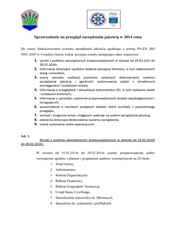 Sprawozdanie na przegląd zarządzania jakością w 2014 roku Do oceny funkcjonowania systemu zarządzania jakością zgodnego z normą PN-EN ISO 9001:2009 w Urzędzie Gminy Łukta przyjęte zostały następujące dane wejściowe: 1. wyniki z auditów wewnętrznych przeprowadzonych w okresie od 19.02.214r do 2. 3. 4. 5. 6. 28.02.2014r, informacja dotycząca wyników badania percepcji klientów, w tym załatwionych skarg i wniosków, ocena sposobu realizacji procesów opisanych dokumentami systemu zarządzania jakością i zgodności wykonywania zadań z określonymi wymaganiami i przepisami prawa, informacja o przeglądach i aktualizacji dokumentów SZJ, w tym wykazów zadań i przepisów prawnych, informacja o sposobie i poziomie przeprowadzonych działań zapobiegawczych i korygujących, sprawozdanie o wynikach podjętych działań, które wynikały z poprzedniego przeglądu, wnioski i prognoza zmian, mogących wpłynąć na system zarządzania jakością, 7. 8. zalecenia dotyczące doskonalenia systemu zarządzania, 9. ocena wykonania celów operacyjnych. Ad. 1. Wyniki z auditów wewnętrznych przeprowadzonych w okresie od 19.02.2014r do 28.02.2014r. W okresie od 19.02.2014r do 28.02.2014r zostały przeprowadzone audity wewnętrzne zgodnie z planem i programem auditów wewnętrznych na 2014rok: 1. W ójt Gminy, 2. Administrator, 3. Referat Organizacyjny. 4. Referat Finansowy, 5. Referat Gospodarki Terenowej, 6. Urząd Stanu Cywilnego, 7. Samodzielne stanowisko ds. Obronnych, 8. Specjalista ds. uzależnień i profilaktyki. Audit na stanowisku Pełnomocnika ds. SZJ odbędzie się bezpośrednio po przeglądzie zarządzania tj. w dniu 31.03.2014 r. Auditorzy wewnętrzni nie wykazali w dokumentacji z przeprowadzonych auditów wewnętrznych tj.: w listach pytań auditowych i treściach spostrzeżeń niezgodności. Ujawniono 5 niezgodności w wyniku innych źródeł, tj: 1. Decyzją znak: WIOŚ-I.KO.7062.2.2.2014.msz z dnia 14.01.2014 r. WarmińskoMazurski Inspektor Ochrony Środowiska w Olsztynie nałożył karę pieniężną w wysokości 300 złotych na Gminę Łukta za nieterminowe przekazanie rocznego sprawozdania z realizacji zadań z zakresu gospodarowania odpadami komunalnymi za 2012 r. do Marszałka Województwa i Wojewódzkiego Inspektora Ochrony Środowiska. Stosownie do art. 9q ust. 1 i 2 ustawy z dnia 13 września 1996 r. o utrzymaniu czystości i porządku w gminach (t.j. Dz.U. z 2013 r., poz. 1399 ze zm.) Gmina zobowiązana była złożyć w/o roczne sprawozdanie do dnia 31 marca 2013 r. Sprawozdanie zostało przesłane 3 dni po ustawowym terminie. Zgodnie z brzmieniem art. 9z ust.1 w/w ustawy orzeczono o nałożeniu kary pieniężnej w wysokości 100 zł za każdy dzień opóźnienia. 2. Rozstrzygnięciem Nadzorczym z dnia 17 marca 2014 r. znak: PN .4131.74.2014 Wojewoda Warmińsko-Mazurski stwierdził nieważność § 24 pkt 4 i § 5 pkt 8 uchwały N r XXXVII/193/2014 Rady Gminy Łukta z dnia 7 lutego 2014 r. w sprawie uchwalenia zmiany miejscowego planu zagospodarowania przestrzennego fragmentów terenu wsi Łukta. Tożsamo Rozstrzygnięciem Nadzorczym z dnia 17 marca 2014 r. znak: PN.4131.75.2014 Wojewoda Warmińsko-Mazurski stwierdził nieważność § 5 pkt 7 i § 8 uchwały N r XXXVII/194/2014 Rady Gminy Łukta z dnia 7 lutego 2014 r. w sprawie uchwalenia miejscowego planu zagospodarowania przestrzennego terenu wsi Kotkowo. W ocenie organu nadzoru w w/o uchwałach Rady Gminy powtórzono regulacje ustawowe wcześniej przez ustawodawcę unormowane i stanowiące przepis powszechnie obowiązujący. Stosownie do treści § 137 załącznika do rozporządzenia Prezesa Rady Ministrów z dnia 20 czerwca 2002 r. w sprawie „Zasad techniki prawodawczej” (Dz.U. z 2002 r. N r 100, poz. 908) , w uchwale nie powtarza się przepisów ustaw, ratyfikowanych umów międzynarodowych i rozporządzeń. 2 3. Postanowieniem znak: Rep. 577/GN/13 z dnia 22 kwietnia 2013 r. oraz Postanowieniem znak: Rep. 578/GN/13 z dnia 22 kwietnia 2013 r. Samorządowe Kolegium Odwoławcze w Elblągu uznało złożone dwa zażalenia na niezałatwienie sprawy w terminie za uzasadnione i wyznaczyło dodatkowy termin załatwienia spraw. Działający z upoważnienia W ójta Kierownik Referatu Gospodarki Terenowej nie zakończył sprawy z wniosku o zmianę za zgodą stron decyzji: nr GT.7430/1/09 z dnia 9.03.2009 r. i nr GT.6831.09.2011 z dnia 22.06.2011 r. zatwierdzających podział nieruchomości - działek nr 257/18 i nr 257/19 w trybie art. 155 ustawy z dnia 14 marca 1960 r. - Kodeks postępowania administracyjnego (tj. D. U. z 2013 r., poz. 267). W związku z powyższym, zgodnie z procedurą systemową nadzoru nad produktem niezgodnym (Ps-03) i procedurą systemową działań korygujących i zapobiegawczych (Ps-04) zostały wdrożone 2 (dwa) działania korygujące, 2 (dwa) działania korekcyjne i 1 (jedno) działanie zapobiegawcze. Ad. 2. Informacja dotycząca wyników badania percepcji klientów, w tym załatwionych skarg i wniosków. Sposób organizacji przyjmowania i załatwiania skarg, wniosków w Urzędzie Gminy Łukta odbywa się stosownie do zasad określonych w przepisach działu VIII ustawy z dnia 14 czerwca 1960 r. - Kodeks postępowania administracyjnego (Dz. U. z 2013 r. poz. 267 j.t..) oraz na podstawie rozporządzenia Rady Ministrów z dnia 8 stycznia 2002 r. w sprawie organizacji przyjmowania i rozpatrywania skarg i wniosków (Dz. U. N r 5 poz. 46 ze zm.). Od dnia 30.05.2012r. obowiązuje również Procedura operacyjna rozpatrywania skarg w Urzędzie Gminy Łukta (Po/XI/OR-03). Każda skarga jest rejestrowana w rejestrze skarg i wniosków, który znajduje się na stanowisku Sekretarza Gminy. W okresie od ostatniego przeglądu systemu zarządzania w dniu 29.03.2013 r. do dnia sporządzenia niniejszego sprawozdania, do Urzędu nie wpłynęła żadna skarga dotycząca postępowania pracowników Urzędu. 3 Za obszar badania poziomu zadowolenia klienta odpowiada Inspektor ds. Ogólnoorganizacyjnych w