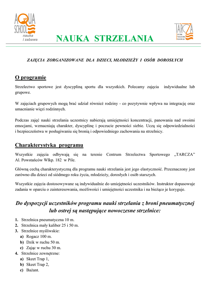 NAUKA STRZELANIA ZAJĘCIA ZORGANIZOWANE DLA DZIECI, MŁODZIEŻY I OSÓB DOROSŁYCH O programie Strzelectwo sportowe jest dyscypliną sportu dla wszystkich. Polecamy zajęcia grupowe. indywidualne lub W zajęciach grupowych mogą brać udział również rodziny - co pozytywnie wpływa na integrację oraz umacnianie więzi rodzinnych. Podczas zajęć nauki strzelania uczestnicy nabierają umiejętności koncentracji, panowania nad swoimi emocjami, wzmacniają charakter, dyscyplinę i poczucie pewności siebie. Uczą się odpowiedzialności i bezpieczeństwa w posługiwaniu się bronią i odpowiedniego zachowania na strzelnicy. Charakterystyka programu Wszystkie zajęcia odbywają się Al. Powstańców Wlkp. 182 w Pile. na terenie Centrum Strzelectwa Sportowego „TARCZA” Główną cechą charakterystyczną dla programu nauki strzelania jest jego elastyczność. Przeznaczony jest zarówno dla dzieci od siódmego roku życia, młodzieży, dorosłych i osób starszych. Wszystkie zajęcia dostosowywane są indywidualnie do umiejętności uczestników. Instruktor dopasowuje zadania w oparciu o zainteresowania, możliwości i umiejętności uczestnika i na bieżąco je koryguje. Do dyspozycji uczestników programu nauki strzelania z broni pneumatycznej lub ostrej są następujące nowoczesne strzelnice: 1. Strzelnica pneumatyczna 10 m. 2. Strzelnica mały kaliber 25 i 50 m. 3. Strzelnice myśliwskie: a) Rogacz 100 m. b) Dzik w ruchu 50 m. c) Zając w ruchu 30 m. 4. Strzelnice zewnętrzne: a) Skeet Trap 1, b) Skeet Trap 2, c) Bażant. Zajęcia nauki strzelania odbywają się z następującej broni: 1. 2. 3. 4. Karabinka lub pistoletu pneumatycznego – indywidualnie lub grupowo, Karabinka lub pistoletu sportowego (broń ostra kal.5,6mm - 22 LR) – indywidualnie lub grupowo, Pistoletu centralnego zapłonu (broń ostra kal. 9 mm) – indywidualnie lub grupowo, Strzelba (strzelania do rzutków) – indywidualnie lub grupowo. Zajęcia prowadzą uprawnieni i z dużym doświadczeniem instruktorzy strzelania. Mają doskonały kontakt z dziećmi, młodzieżą jak i osobami dorosłymi. Podczas zajęć panuje miła atmosfera. Proponujemy zajęcia dla dzieci, młodzieży i osób dorosłych w następujących cyklach: Nauka strzelania, sezon wiosna – jesień: 1. Strzelanie z karabinka lub pistoletu sportowego – zajęcia indywidualne i grupowe odbywają się w budynku klubowym - strzelnica mały kaliber 25 i 50 m. Uczestnicy takich zajęć umawiają terminy lekcji indywidualnie z instruktorem. 2. Strzelanie z pistoletu centralnego zapłonu – zajęcia indywidualne i grupowe odbywają się w budynku klubowym - strzelnica przeznaczona do strzelań z kal. 9 mm. Uczestnicy takich zajęć umawiają terminy lekcji indywidualnie z instruktorem. 3. Strzelania do rzutków – zajęcia indywidualne i grupowe odbywają się na terenach zewnętrznych strzelnice do strzelań Skeet, Trap, Bażant. Uczestnicy takich zajęć umawiają terminy lekcji indywidualnie z instruktorem. 4. Strzelanie z karabinka lub pistoletu pneumatycznego: - zajęcia grupowe odbywają się jeden lub dwa razy w tygodniu wg ustalonego z grupą harmonogramu (grupa min. 10 osób); - zajęcia indywidualne - uczestnik takich zajęć umawia terminy lekcji indywidualnie z instruktorem. Zajęcia odbywają się w budynku strzelnicy pneumatycznej. Dokumenty do pobrania: - karta zgłoszenia – osoby niepełnoletniej -oświadczenie – osoba niepełnoletnia -oświadczenie – osoba pełnoletnia - regulamin zajęć, Wakacyjna nauka strzelania od lipca do sierpnia: 1. Strzelanie z karabinka lub pistoletu sportowego – zajęcia indywidualne odbywają się w miesiącach lipiec i sierpień w promocyjnym systemie karnetowym tzn. 5,10 lub 15 lekcji w części budynku klubowego - strzelnica mały kaliber 25 i 50 m. Uczestnik takich zajęć umawia terminy lekcji indywidualnie z instruktorem. 2. Strzelanie z pistoletu centralnego zapłonu – zajęcia indywidualne odbywają się w miesiącach lipiec i sierpień w promocyjnym systemie karnetowym tzn. 5,10 lub 15 lekcji w budynku klubowym na strzelnicy przeznaczonej do strzelań z kal. 9 mm. Uczestnik takich zajęć umawia terminy lekcji indywidualnie z instruktorem. 3. Strzelania do rzutków – zajęcia indywidualne odbywają się w miesiącach lipiec i sierpień w promocyjnym systemie karnetowym tzn. 5,10 lub 15 lekcji na strzelnicach zewnętrznych do strzelań Skeet, Trap, Bażant. Uczestnik takich zajęć umawia terminy lekcji indywidualnie z instruktorem. 4. Strzelanie z karabinka lub pistoletu pneumatycznego: - zajęcia grupowe odbywają się w cyklach 1-miesięcznych lipiec i sierpień, dwa razy w tygodniu (grupa min. 10 osób); - zajęcia indywidualne - uczestnik takich zajęć umawia terminy lekcji indywidualnie z instruktorem. Zajęcia odbywają się w budynku strzelnicy pneumatycznej. Dokumenty do pobrania: - karta zgłoszenia – osoby niepełnoletniej -oświadczenie – osoba niepełnoletnia -oświadczenie – osoba pełnoletnia - regulamin zajęć, Feryjna nauka strzelania w czasie 2 tygodni ferii zimowych województwa wielkopolskiego: 1. Strzelanie z karabinka lub pistoletu pneumatycznego - zajęcia grupowe odbywają się w cyklu 2-tygodniowym - 5 razy w tygodniu Pn – Pt (gr. min.10 os.); - zajęcia indywidualne – uczestnik takich zajęć umawia terminy lekcji indywidualnie z instruktorem. Zajęcia odbywają się w budynku strzelnicy pneumatycznej. Dokumenty do pobrania: - karta zgłoszenia – osoby niepełnoletniej -oświadczenie – osoba niepełnoletnia -oświadczenie – osoba pełnoletnia - regulamin zajęć, ZAPRASZAMY