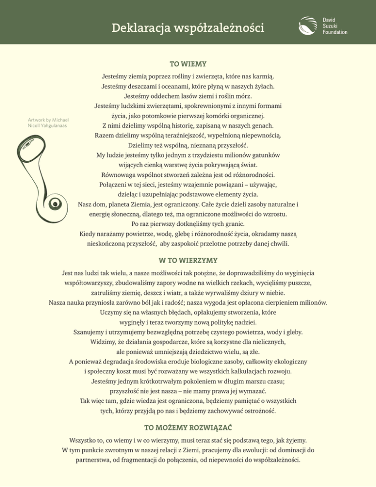 Deklaracja współzależności To wiemy Jesteśmy ziemią poprzez rośliny i zwierzęta, które nas karmią. Jesteśmy deszczami i oceanami, które płyną w naszych żyłach. Jesteśmy oddechem lasów ziemi i roślin mórz. Jesteśmy ludzkimi zwierzętami, spokrewnionymi z innymi formami Artwork by Michael Nicoll Yahgulanaas życia, jako potomkowie pierwszej komórki organicznej. Z nimi dzielimy wspólną historię, zapisaną w naszych genach. Razem dzielimy wspólną teraźniejszość, wypełnioną niepewnością. Dzielimy też wspólną, nieznaną przyszłość. My ludzie jesteśmy tylko jednym z trzydziestu milionów gatunków wijących cienką warstwę życia pokrywającą świat. Równowaga wspólnot stworzeń zależna jest od różnorodności. Połączeni w tej sieci, jesteśmy wzajemnie powiązani – używając, dzieląc i uzupełniając podstawowe elementy życia. Nasz dom, planeta Ziemia, jest ograniczony. Całe życie dzieli zasoby naturalne i energię słoneczną, dlatego też, ma ograniczone możliwości do wzrostu. Po raz pierwszy dotknęliśmy tych granic. Kiedy narażamy powietrze, wodę, glebę i różnorodność życia, okradamy naszą nieskończoną przyszłość, aby zaspokoić przelotne potrzeby danej chwili. w To wierzymy Jest nas ludzi tak wielu, a nasze możliwości tak potężne, że doprowadziliśmy do wyginięcia współtowarzyszy, zbudowaliśmy zapory wodne na wielkich rzekach, wycięliśmy puszcze, zatruliśmy ziemię, deszcz i wiatr, a także wyrwaliśmy dziury w niebie. Nasza nauka przyniosła zarówno ból jak i radość; nasza wygoda jest opłacona cierpieniem milionów. Uczymy się na własnych błędach, opłakujemy stworzenia, które wyginęły i teraz tworzymy nową politykę nadziei. Szanujemy i utrzymujemy bezwzględną potrzebę czystego powietrza, wody i gleby. Widzimy, że działania gospodarcze, które są korzystne dla nielicznych, ale ponieważ umniejszają dziedzictwo wielu, są złe. A ponieważ degradacja środowiska eroduje biologiczne zasoby, całkowity ekologiczny i społeczny koszt musi być rozważany we wszystkich kalkulacjach rozwoju. Jesteśmy jednym krótkotrwałym pokoleniem w długim marszu czasu; przyszłość nie jest nasza – nie mamy prawa jej wymazać. Tak więc tam, gdzie wiedza jest ograniczona, będziemy pamiętać o wszystkich tych, którzy przyjdą po nas i będziemy zachowywać ostrożność. To możemy rozwiązać Wszystko to, co wiemy i w co wierzymy, musi teraz stać się podstawą tego, jak żyjemy. W tym punkcie zwrotnym w naszej relacji z Ziemi, pracujemy dla ewolucji: od dominacji do partnerstwa, od fragmentacji do połączenia, od niepewności do współzależności.