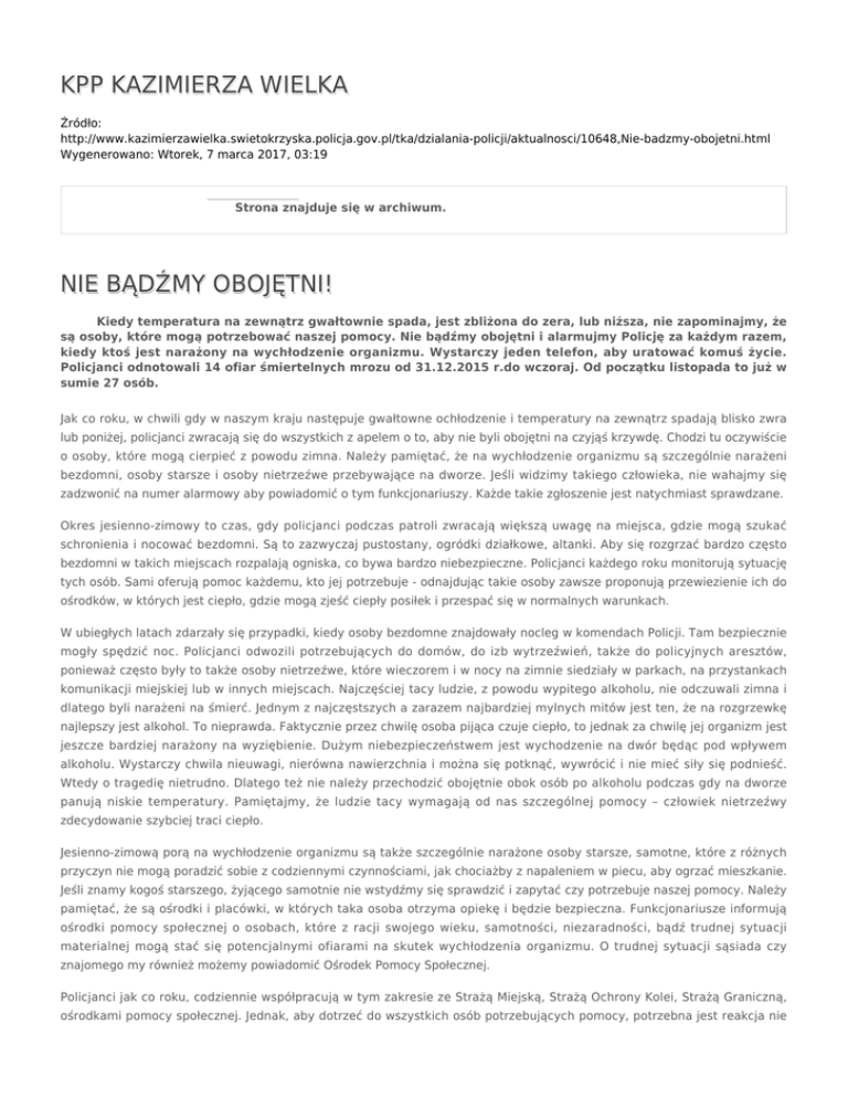 KPP KAZIMIERZA WIELKA Źródło: http://www.kazimierzawielka.swietokrzyska.policja.gov.pl/tka/dzialania-policji/aktualnosci/10648,Nie-badzmy-obojetni.html Wygenerowano: Wtorek, 7 marca 2017, 03:19 Strona znajduje się w archiwum. NIE BĄDŹMY OBOJĘTNI! Kiedy temperatura na zewnątrz gwałtownie spada, jest zbliżona do zera, lub niższa, nie zapominajmy, że są osoby, które mogą potrzebować naszej pomocy. Nie bądźmy obojętni i alarmujmy Policję za każdym razem, kiedy ktoś jest narażony na wychłodzenie organizmu. Wystarczy jeden telefon, aby uratować komuś życie. Policjanci odnotowali 14 ofiar śmiertelnych mrozu od 31.12.2015 r.do wczoraj. Od początku listopada to już w sumie 27 osób. Jak co roku, w chwili gdy w naszym kraju następuje gwałtowne ochłodzenie i temperatury na zewnątrz spadają blisko zwra lub poniżej, policjanci zwracają się do wszystkich z apelem o to, aby nie byli obojętni na czyjąś krzywdę. Chodzi tu oczywiście o osoby, które mogą cierpieć z powodu zimna. Należy pamiętać, że na wychłodzenie organizmu są szczególnie narażeni bezdomni, osoby starsze i osoby nietrzeźwe przebywające na dworze. Jeśli widzimy takiego człowieka, nie wahajmy się zadzwonić na numer alarmowy aby powiadomić o tym funkcjonariuszy. Każde takie zgłoszenie jest natychmiast sprawdzane. Okres jesienno-zimowy to czas, gdy policjanci podczas patroli zwracają większą uwagę na miejsca, gdzie mogą szukać schronienia i nocować bezdomni. Są to zazwyczaj pustostany, ogródki działkowe, altanki. Aby się rozgrzać bardzo często bezdomni w takich miejscach rozpalają ogniska, co bywa bardzo niebezpieczne. Policjanci każdego roku monitorują sytuację tych osób. Sami oferują pomoc każdemu, kto jej potrzebuje - odnajdując takie osoby zawsze proponują przewiezienie ich do ośrodków, w których jest ciepło, gdzie mogą zjeść ciepły posiłek i przespać się w normalnych warunkach. W ubiegłych latach zdarzały się przypadki, kiedy osoby bezdomne znajdowały nocleg w komendach Policji. Tam bezpiecznie mogły spędzić noc. Policjanci odwozili potrzebujących do domów, do izb wytrzeźwień, także do policyjnych aresztów, ponieważ często były to także osoby nietrzeźwe, które wieczorem i w nocy na zimnie siedziały w parkach, na przystankach komunikacji miejskiej lub w innych miejscach. Najczęściej tacy ludzie, z powodu wypitego alkoholu, nie odczuwali zimna i dlatego byli narażeni na śmierć. Jednym z najczęstszych a zarazem najbardziej mylnych mitów jest ten, że na rozgrzewkę najlepszy jest alkohol. To nieprawda. Faktycznie przez chwilę osoba pijąca czuje ciepło, to jednak za chwilę jej organizm jest jeszcze bardziej narażony na wyziębienie. Dużym niebezpieczeństwem jest wychodzenie na dwór będąc pod wpływem alkoholu. Wystarczy chwila nieuwagi, nierówna nawierzchnia i można się potknąć, wywrócić i nie mieć siły się podnieść. Wtedy o tragedię nietrudno. Dlatego też nie należy przechodzić obojętnie obok osób po alkoholu podczas gdy na dworze panują niskie temperatury. Pamiętajmy, że ludzie tacy wymagają od nas szczególnej pomocy – człowiek nietrzeźwy zdecydowanie szybciej traci ciepło. Jesienno-zimową porą na wychłodzenie organizmu są także szczególnie narażone osoby starsze, samotne, które z różnych przyczyn nie mogą poradzić sobie z codziennymi czynnościami, jak chociażby z napaleniem w piecu, aby ogrzać mieszkanie. Jeśli znamy kogoś starszego, żyjącego samotnie nie wstydźmy się sprawdzić i zapytać czy potrzebuje naszej pomocy. Należy pamiętać, że są ośrodki i placówki, w których taka osoba otrzyma opiekę i będzie bezpieczna. Funkcjonariusze informują ośrodki pomocy społecznej o osobach, które z racji swojego wieku, samotności, niezaradności, bądź trudnej sytuacji materialnej mogą stać się potencjalnymi ofiarami na skutek wychłodzenia organizmu. O trudnej sytuacji sąsiada czy znajomego my również możemy powiadomić Ośrodek Pomocy Społecznej. Policjanci jak co roku, codziennie współpracują w tym zakresie ze Strażą Miejską, Strażą Ochrony Kolei, Strażą Graniczną, ośrodkami pomocy społecznej. Jednak, aby dotrzeć do wszystkich osób potrzebujących pomocy, potrzebna jest reakcja nie tylko służb, ale każdego człowieka. Dlatego funkcjonariusze podkreślają, jak ważne jest zaangażowanie i informowanie ośrodków pomocy społecznej o osobach bezradnych, samotnych i bezdomnych potrzebujących pomocy. Pamiętajmy, że obowiązkiem każdego z nas jest reagowanie na cudzą krzywdę. Nie bądźmy obojętni wobec tych, którzy zwłaszcza teraz mogą potrzebować naszej pomocy. Wystarczy tylko jeden telefon pod numer 112 lub 997 lub 986, by uchronić kogoś od wychłodzenia i uratować czyjeś życie. Źródło: KGP Ocena: 0/5 (0) Tweetnij