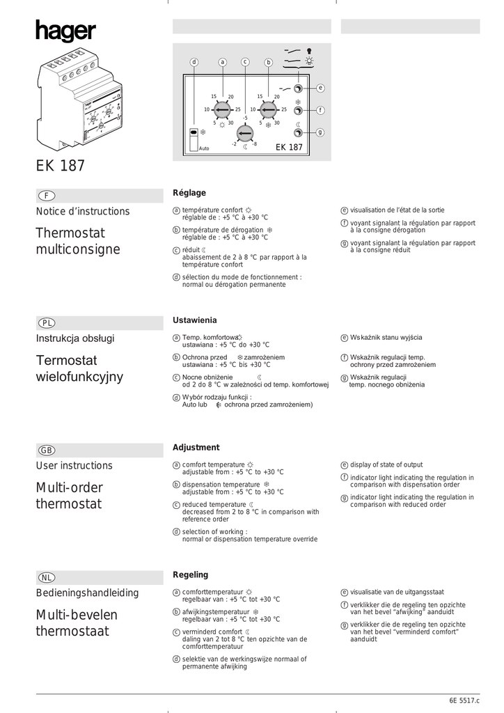 c a d b e 15 EK 15 10 20 10 20 20 187 15 15 20 25 25 10 25 30 10 25 f 30 -5 5 -5 30 5 5 5 30 -8 g -2 Auto -2 -8 Auto EK 187 EK 187 F Réglage Notice d’instructions a température confort Thermostat multiconsigne b température de dérogation réglable de : +5 °C à +30 °C réglable de : +5 °C à +30 °C c réduit e visualisation de l’état de la sortie f voyant signalant la régulation par rapport à la consigne dérogation g voyant signalant la régulation par rapport à la consigne réduit abaissement de 2 à 8 °C par rapport à la température confort d sélection du mode de fonctionnement : normal ou dérogation permanente PL Ustawienia Instrukcja obsługi a Temp. komfortowa e Ws kaźnik stanu wyjścia Termostat wielofunkcyjny b Ochrona przed f Wskaźnik regulacji temp. c Nocne obniżenie g Wskaźnik regulacji ustawiana : +5 °C do +30 °C zamrożeniem ustawiana : +5 °C bis +30 °C od 2 do 8 °C w zależności od temp. komfortowej ochrony przed zamrożeniem temp. nocnego obniżenia d W ybór rodzaju funkcji : Auto lub GB ( ochrona przed zamrożeniem) Adjustment User instructions a comfort temperature Multi-order thermostat b dispensation temperature adjustable from : +5 °C to +30 °C adjustable from : +5 °C to +30 °C c reduced temperature e display of state of output f indicator light indicating the regulation in comparison with dispensation order g indicator light indicating the regulation in comparison with reduced order decreased from 2 to 8 °C in comparison with reference order d selection of working : normal or dispensation temperature override NL Regeling Bedieningshandleiding a comforttemperatuur Multi-bevelen thermostaat b afwijkingstemperatuur regelbaar van : +5 °C tot +30 °C regelbaar van : +5 °C tot +30 °C c verminderd comfort daling van 2 tot 8 °C ten opzichte van de comforttemperatuur e visualisatie van de uitgangsstaat f verklikker die de regeling ten opzichte van het bevel “afwijking” aanduidt g verklikker die de regeling ten opzichte van het bevel “verminderd comfort” aanduidt d selektie van de werkingswijze normaal of permanente afwijking 6E 5517.c Ph N 230 V M 1 3 5 7 9 2 4 6 8 10 h EK 082 EK 083 Raccordements électriques h les consignes de température sont sélectionnées par ordre extérieur Deux contacts libre de potentiel sélectionnent - l’un la température de dérogation, - l’autre l’abaissement. Quand les deux contacts sont ouverts : la température “confort” est sélectionnée. En cas de fermeture des deux contacts, c’est la température de dérogation qui est prioritaire. Habituellement la température de dérogation est utilisée comme consigne hors-gel. Spécifications techniques Le EK 187 peut être utilisé avec : - la sonde fixe EK 081 - la sonde réglable EK 082 - la sonde universelle EK 083. Sécurité coupure sonde : en cas de coupure de sonde, le thermostat est mis en service 1 min. toutes les 4 min. zewnętrznymi rozkazami dwa styki bezpotencjałowe sterują: - temp.ochrony przed zamrożeniem, - temp. nocnego obniżenia Kiedy obydwa styki są rozwarte wybrana jest temperatura komfortowa. Kiedy oba styki są zwarte pierwszeństwo ma ochrona przed zamrożeniem Ochrona przed zamrozeniem stosowana jest w czasie weekendu / urlopu. external order Two volt free contacts select either the dispen sation temperature or the temperature decrease. When both contacts are open : “comfort” temperature is selected. If both contacts are closed dispensation temperature has priority. The dispensation temperature si usually used as anti-frost. EK 187 można stosować z : - czujnikiem ze stałą nastawą EK 081 - czujnikiem z regulowaną nastawą EK 082 - czujnikiem uniwersalnym EK 083. Zabezpieczenie uszkodzenia czujnika : przy uszkodzeniu czujnika urządzenie załącza ogrzewanie na 1 min w ciągu 4 min. geselekteerd door buitenorder Het eerste potentieelvrije kontakt selekteerd de temperatuursafwijking en het tweede de daling. In geval de twee kontakten open zijn is de temperatuur “comfort” geselekteerd, wanneer de twee kontakten gesloten zijn heeft de afwijkingstemperatuur voorgang. Gewoonlijk wordt de afwijkingstemperatuur als vorstbescherming gebruikt. Napięcie : 230V +10-15% 50/60 Hz Strata mocy : 1,5 VA Wyjście : 1 styk przełączny : m 2 A - 250 V M AC1 S tatyczna histereza dla 3 zakresów temperatur : 5 0,2 °C Te mp. otoczenia : -10 °C... +50 °C Temp. składowania : -20 °C... +70 °C Podłączenie elastyczne : 1 mm2 do 6 mm2 drut : 1,5 mm2 do 10 mm2 max. odległość czujnika : 50 m Technical specifications The EK 187 probe can be used with : - the fixed probe EK 081 - the adjustable probe EK 082 - the universal probe EK 083. Safety feature for probe failure : in probe fails, output ON 1 min every 4. Supply : 230V +10-15% 50/60 Hz consumption : 1,5 VA output : 1 chang. contact : m 2 A - 250 V M AC1 Static differential for the 3 temperature orders : 5 0,2 °C working T° : -10 °C... +50 °C storage T° : -20 °C... +70 °C Connection flexible : 1 M ...6 M rigid : 1,5 M ...10 M probe max. distance 50 m Elektrische aansluitingen h de temperatuursbevelen worden T° fonctionnement : -10 °C... +50 °C T° stockage : -20 °C... +70 °C Dane techniczne Electrical connection h the temperature orders are selected by Différentiel statique pour les 3 consignes de température : 5 0,2 °C Raccordement souple : 1 M ...6 M rigide : 1,5 M ...10 M sonde : distance maxi. 50 m Podłączenie h nastawy temperatur są wybierane Alimentation : 230V +10-15% 50/60 Hz consommation : 1,5 VA sortie : 1 contact inverseur : m 2 A - 250 V M AC1 Technische specificaties De EK 187 mag gebruikt worden met : - de vaste voeler EK 081 - de regelbare voeler EK 082 - de universele probe EK 083. Veiligheid in geval van niet-werking van de voeler : in geval van niet-werking van de voeler, wordt de thermostaat in dienst gesteld gedurende 1 minuut alle 4 minuten. électro S.A. - 132, bld d’Europe - BP3 - 67 215 Obernai cedex - Tél. 03.88.49.