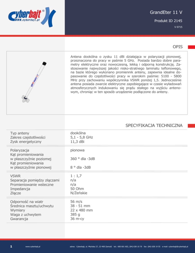 GrandEter 11 V Produkt ID 2145 V 0715 OPIS Antena dookólna o zysku 11 dBi działająca w polaryzacji pionowej, przeznaczona do pracy w paśmie 5 GHz. Posiada bardzo dobre parametry elektryczne oraz nowoczesną, lekką i odporną konstrukcję. Zastosowanie najwyższej jakości nisko-stratnego laminatu teflonowego, na bazie którego wykonano promiennik anteny, zapewnia idealne dopasowanie do częstotliwości pracy w szerokim paśmie: 5100 - 5800 MHz przy zachowaniu współczynnika VSWR poniżej 1,5. Jednocześnie antena posiada zwarcie elektryczne zapobiegające w czasie wyładowań atmosferycznych indukowaniu się prądu stałego na wyjściu antenowym, chroniąc w ten sposób urządzenie podłączone do anteny. SPECYFIKACJA TECHNICZNA Typ anteny Zakres częstotliwości Zysk energetyczny dookólna 5,1 - 5,8 GHz 11,3 dBi Polaryzacja Kąt promieniowania w płaszczyźnie poziomej Kąt promieniowania w płaszczyźnie pionowej pionowa VSWR Separacja pomiędzy złączami Promieniowanie wsteczne Impedancja Złącze 1 : 1,7 n/a n/a 50 Ohm N/Żeńskie Odporność na wiatr Średnica masztu/uchwytu Wymiary Waga z uchwytem Gwarancja 56 m/s 38 - 51 mm 22 x 480 mm 385 g 36 m-cy 1 adres: Cyberbajt, ul. Młyńska 27, 22-400 Zamość tel.: 600 601 602, (84) 638 10 70 fax: (84) 638 19 55 e-mail: [email protected] www.cyberbajt.pl 360 ° dla -3dB 8 ° dla -3dB GrandEter 11 V Produkt ID 2145 V 0715 KĄT PROMIENIOWANIA W PŁASZCZYŹNIE -I- poziomej VSWR (VSWR) Ref Level : 0 dB Ref Offset : 0,0 dB Start: 5,1 -I- Detector : Sample Trigger Mode : Free Run Trace : Clear / Write RBW : 1 kHz VBW : 3 MHz SWT : 1 s Stop: 5,8 pionowej RYSUNEK TECHNICZNY 2 www.cyberbajt.pl adres: Cyberbajt, ul. Młyńska 27, 22-400 Zamość tel.: 600 601 602, (84) 638 10 70 fax: (84) 638 19 55 e-mail: [email protected]