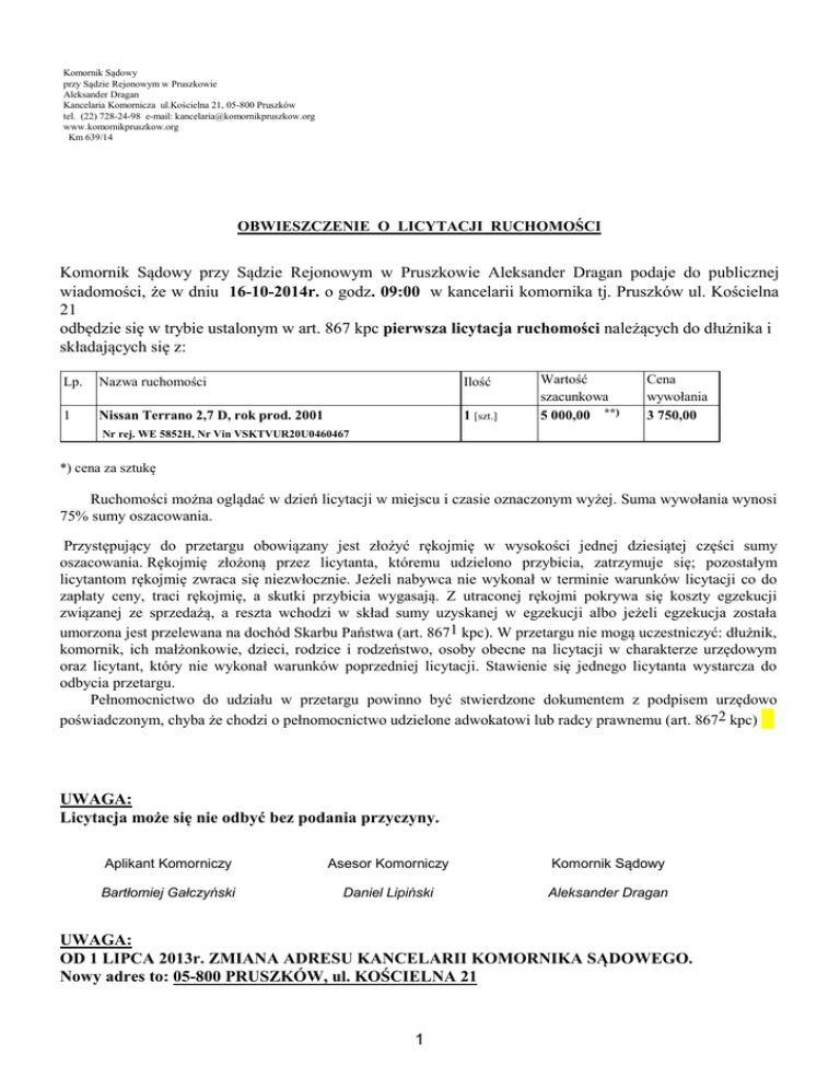 Komornik Sądowy przy Sądzie Rejonowym w Pruszkowie Aleksander Dragan Kancelaria Komornicza ul.Kościelna 21, 05-800 Pruszków tel. (22) 728-24-98 e-mail: [email protected] www.komornikpruszkow.org Km 639/14 OBWIESZCZENIE O LICYTACJI RUCHOMOŚCI Komornik Sądowy przy Sądzie Rejonowym w Pruszkowie Aleksander Dragan podaje do publicznej wiadomości, że w dniu 16-10-2014r. o godz. 09:00 w kancelarii komornika tj. Pruszków ul. Kościelna 21 odbędzie się w trybie ustalonym w art. 867 kpc pierwsza licytacja ruchomości należących do dłużnika i składających się z: Lp. Nazwa ruchomości Ilość 1 Nissan Terrano 2,7 D, rok prod. 2001 1 [szt.] Wartość szacunkowa 5 000,00 **) Cena wywołania 3 750,00 .Nr rej. WE 5852H, Nr Vin VSKTVUR20U0460467 *) cena za sztukę Ruchomości można oglądać w dzień licytacji w miejscu i czasie oznaczonym wyżej. Suma wywołania wynosi 75% sumy oszacowania. Przystępujący do przetargu obowiązany jest złożyć rękojmię w wysokości jednej dziesiątej części sumy oszacowania. Rękojmię złożoną przez licytanta, któremu udzielono przybicia, zatrzymuje się; pozostałym licytantom rękojmię zwraca się niezwłocznie. Jeżeli nabywca nie wykonał w terminie warunków licytacji co do zapłaty ceny, traci rękojmię, a skutki przybicia wygasają. Z utraconej rękojmi pokrywa się koszty egzekucji związanej ze sprzedażą, a reszta wchodzi w skład sumy uzyskanej w egzekucji albo jeżeli egzekucja została umorzona jest przelewana na dochód Skarbu Państwa (art. 8671 kpc). W przetargu nie mogą uczestniczyć: dłużnik, komornik, ich małżonkowie, dzieci, rodzice i rodzeństwo, osoby obecne na licytacji w charakterze urzędowym oraz licytant, który nie wykonał warunków poprzedniej licytacji. Stawienie się jednego licytanta wystarcza do odbycia przetargu. Pełnomocnictwo do udziału w przetargu powinno być stwierdzone dokumentem z podpisem urzędowo poświadczonym, chyba że chodzi o pełnomocnictwo udzielone adwokatowi lub radcy prawnemu (art. 8672 kpc) UWAGA: Licytacja może się nie odbyć bez podania przyczyny. Aplikant Komorniczy Asesor Komorniczy Komornik Sądowy Bartłomiej Gałczyński Daniel Lipiński Aleksander Dragan UWAGA: OD 1 LIPCA 2013r. ZMIANA ADRESU KANCELARII KOMORNIKA SĄDOWEGO. Nowy adres to: 05-800 PRUSZKÓW, ul. KOŚCIELNA 21 1