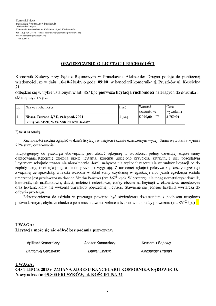 1 Komornik Sądowy przy Sądzie Rejonowym w Pruszkowie