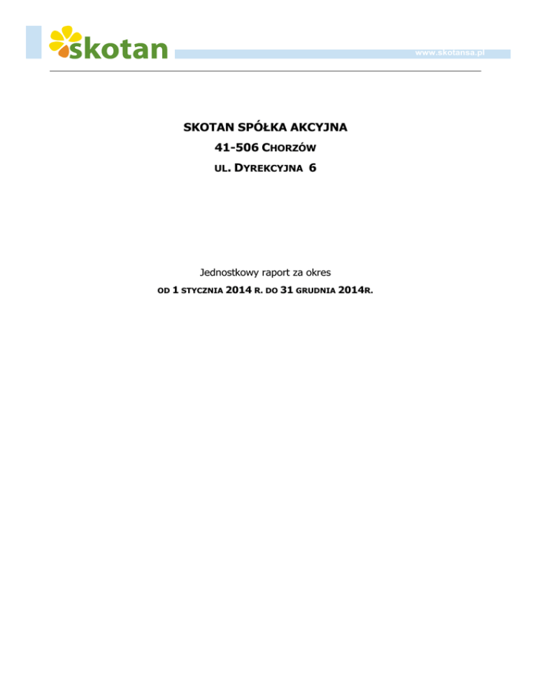 www.skotansa.pl SKOTAN SPÓŁKA AKCYJNA 41-506 CHORZÓW UL. DYREKCYJNA 6 Jednostkowy raport za okres OD 1 STYCZNIA 2014 R. DO 31 GRUDNIA 2014R. SPIS TREŚCI JEDNOSTKOWY RAPORT ZA ROK 2014 ZAWIERA: A. WSTĘP B. LIST DO AKCJONARIUSZY C. WYBRANE DANE FINANSOWE D. SPRAWOZDANIE ZARZĄDU Z DZIAŁALNOŚCI "SKOTAN" S.A. W ROKU 2014 E. OŚWIADCZENIE O STOSOWANIU ZASAD ŁADU KORPORACYJNEGO W 2014 ROKU JEDNOSTKOWE SPRAWOZDANIE FINANSOWE F. WPROWADZENIE DO SPRAWOZDANIA FINANSOWEGO G. DODATKOWE INFORMACJE I OBJAŚNIENIA DO SPRAWOZDANIA FINANSOWEGO H. JEDNOSTKOWY BILANS I. JEDNOSTKOWY RACHUNEK ZYSKÓW I STRAT J. JEDNOSTKOWE ZESTAWIENIE ZMIAN W KAPITALE WŁASNYM K. JEDNOSTKOWY RACHUNEK PRZEPŁYWÓW PIENIĘŻNYCH L. INFORMACJA DODATKOWA ORAZ DODATKOWE NOTY OBJAŚNIAJĄCE OŚWIADCZENIA ZARZĄDU M. OŚWIADCZENIE ZARZĄDU W SPRAWIE PODMIOTU UPRAWNIONEGO DO BADANIA SPRAWOZDANIA FINANSOWEGO N. OSWIADCZENIE ZARZĄDU W SPRAWIE RZETELNOŚCI SPORZĄDZANIA SPRAWOZDANIA FINANSOWEGO O. OŚWIADCZENIE ZARZĄDU DLA BIEGŁYCH REWIDENTÓW. 1 A. WSTĘP. SKOTAN S.A. (zwany dalej Spółką, Emitentem lub SKOTAN) jest spółką giełdową z wieloletnią tradycją. Spółka powstała w wyniku przekształcenia przedsiębiorstwa państwowego Zakłady Garbarskie Skotan w Skoczowie, a jej założycielem był Skarb Państwa. Od momentu zmiany strategii w 2009 roku SKOTAN prowadzi działalność badawczo – rozwojową w obszarze biotechnologii, dodatków żywieniowych, żywności funkcjonalnej i innowacyjnych procesów technologicznych. Podstawowym projektem biotechnologicznym spółki łączącym docelowo powyższe obszary pozostaje rozwój technologii i spektrum produktowego związanego ze szczepem drożdży Yarrowia Lipolytica, który docelowo Spółka zamierza uplasować w ramach swoich produktów w sektorze paszowym oraz suplementacji diety ludzkiej. W obszarze innowacyjnych procesów technologicznym najważniejszym projektem spółki na chwilę obecną pozostaje zaawansowany technologicznie i procesowo projekt wytwarzania energii elektrycznej z gazów odpadowych i wodorowych. 2 B. LIST DO AKCJONARIUSZY Szanowni Państwo, Zarząd SKOTAN S.A. przedstawia niniejszym jednostkowy raport roczny Spółki za rok obrotowy 2014. Rok 2014 był okresem kontynuowania realizacji strategii średniookresowej Skotan S.A., skoncentrowanej na rozwoju innowacyjnych projektów badawczo – rozwojowych, na które Spółka otrzymała dofinansowanie. Spółka kontynuowała także prace w zakresie dalszej restrukturyzacji aktywów niezwiązanych z działalnością naukowo-badawczą oraz poszukiwania nowych projektów z zakresu nowoczesnych technologii. Podobnie jak w latach poprzednich, wypracowany wynik działalności Spółki stanowi wypadkową znacznych nakładów na działalność badawczo – rozwojową, zmian wartości posiadanych aktywów finansowych i wyniku na rozpoczętej działalności operacyjnej i nie odzwierciedla potencjalnej skali działalności Spółki w długim okresie ani nie wyznacza długoterminowych trendów. Zaznaczyć należy jednak skalę planowanych na lata 2014 – 2015 nakładów inwestycyjnych związanych z realizowanymi projektami i uzależnienie kształtowania wyniku operacyjnego działalności od efektów podjętych działań w zakresie budowania rynku na nowe i innowacyjne produkty Spółki. Trwające budowanie tego rynku oraz długoterminowa kontraktacja pozwolić powinny na wdrożenia i zyskowną eksploatację wdrożeń produktowych lub technologicznych wypracowanych na poziomie poszczególnych projektów. Skala realizacji projektów badawczo – rozwojowych Spółki oraz plany dotyczące nowych projektów pozwoliły Zarządowi na skierowanie w 2013 roku pod obrady Walnego Zgromadzenia wniosku o podwyższenie kapitału zakładowego Spółki. Niepowodzenie przedmiotowej emisji wywołało konieczność rewizji długoterminowych planów rozwoju Spółki oraz zmniejszenia aktywności w zakresie działalności akwizycyjnej w obszarze pozyskiwania finansowania nowych projektów. W chwili obecnej Zarząd biorąc pod uwagę ryzyka dotyczące działalności Spółki, przedstawione w raporcie rocznym, kumulację wydatków zwianych z zakończeniem i rozliczeniem cyklów badawczych i możliwe ograniczenia w dostępie do płynnych środków finansowych prowadzi działania zmierzające do pozyskania inwestorów branżowych dla przyszłych wdrożeń prowadzonych projektów badawczo–rozwojowych oraz rozważa ponowne wystąpienie do Walnego Zgromadzenia z wnioskiem o podwyższenie kapitału zakładowego. W ocenie Zarządu dokapitalizowanie Spółki jest na obecnym etapie kwestią konieczną. Żywiąc nadzieję, iż prowadzone działania w zakresie rozwoju prowadzonych projektów innowacyjnych jak i inne prace związane z poszukiwaniem źródeł ich finansowania pozwolą na długotrwały, rentowny i wielokierunkowy rozwój Spółki i Grupy Kapitałowej SKOTAN, Pozostaję z poważaniem, Marek Pawełczak Prezes Zarządu 3 C. WYBRANE DANE FINANSOWE WYBRANE DANE FINANSOWE [TYS.] PLN 2014 Przychody netto ze sprzedaży produktów, towarów i materiałów EUR 2013 2014 2013 628 1 728 150 410 Zysk (strata) z działalności operacyjnej -15 481 -3 986 -3 695 -947 Zysk (strata) brutto -19 956 -3 766 -4 764 -894 Zysk (strata) netto -19 718 434 -4 707 103 Przepływy pieniężne netto z działalności operacyjnej -19 992 14 238 -4 772 3 381 5 933 -28 129 1 416 -6 680 18 400 16 703 4 392 3 967 Przepływy pieniężne netto z działalności inwestycyjnej Przepływy pieniężne netto z działalności finansowej Przepływy pieniężne netto, razem 4 341 2 812 1 036 668 Aktywa, razem 53 576 99 227 12 570 23 926 Zobowiązania i rezerwy na zobowiązania 12 628 26 436 52 370 6 202 Zobowiązania długoterminowe 13 65 3 16 Zobowiązania krótkoterminowe 6 073 14 013 1 425 3 379 Kapitał własny 27 139 46 857 6 367 11 298 Kapitał zakładowy 65 880 65 880 15 456 15 885 54 000 000 54 000 000 54 000 000 54 000 000 Zysk (strata) na jedną akcję zwykłą (w
