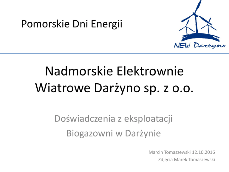 Pomorskie Dni Energii Nadmorskie Elektrownie Wiatrowe Darżyno sp. z o.o. Doświadczenia z eksploatacji Biogazowni w Darżynie Marcin Tomaszewski 12.10.2016 Zdjęcia Marek Tomaszewski Elektrownie Wiatrowe - geneza • Fascynacja elektrowniami wiatrowymi • Liczne zaspy śnieżne na DK 6 w tym rejonie • Przyjazna gmina i otwarte władze gminy • Wsparcie na każdym etapie inwestycyjnym Elektrownie Wiatrowe – Dane projektu • • • • • • • Uruchomienie w 2008r. 3 elektrownie Enercon E-82 3 x 2MW = 6MW Wysokość wieży 98m Średnica rotora 82m Roczna produkcja – 15.000MWh Czas pracy z mocą szczytową – 30% Elektrownia Biogazowa - geneza • Brak możliwości rozwoju elektrowni wiatrowych ze względu na brak przyłączy elektrycznych dla źródeł niestabilnych • Pozytywne doświadczenia inwestycyjne w Potęgowie Elektrownia Biogazowa - geneza • Dobre relacje z mieszkańcami – prowadzenie biogazowni to sztuka utrzymywania relacji z dostawcami i odbiorcami • Atrakcyjne warunki finansowania – Program Operacyjny Infrastruktura i Środowisko 16mln zł 45% Elektrownia Biogazowa – Dane projektu • • • • Uruchomienie w 2013r. Technologia od Weltec Biopower Kogeneratory MWM od CES sp. z o.o. Moc 2 x 1,2MW = 2,4MW (największa w Polsce) • Moc elektr. / Moc cieplna = 1:1 • Roczna produkcja – 18.500MWh • Czas pracy z mocą szczytową – 90% Elektrownia Biogazowa – Cechy szczególne CECHY SZCZEGÓLNE • Fermentacja mezofilowa 39°C (niższa temperatura, stabilniejsza, choć mniej wydajna) • Fermentacja jednostopniowa – homogenizacja, hydroliza i faza metanogenna w jednym zbiorniku (mniej zbiorników – niższe nakłady) Elektrownia Biogazowa – Cechy szczególne CECHY SZCZEGÓLNE • Zbiorniki ze stali nierdzewnej – wyższa trwałość, szybsza budowa • Biologiczne odsiarczanie biogazu – bardzo wydajne i tanie • Pełna automatyka karmienia • Zdalny nadzór Elektrownia Biogazowa – Zasada działania Elektrownia Biogazowa – Ekonomika PRZY PODEJMOWANIU DECYZJI O BUDOWIE • Przychód za 1MWh energii elektrycznej: 210zł/MWh • Przychód za 1MWh zielone certyfikaty: 240zł/MWh • RAZEM 450zł/MWh AKTUALNIE • Przychód za 1MWh energii elektrycznej: 169zł/MWh • Przychód za 1MWh zielone certyfikaty: 36zł/MWh • RAZEM 295zł/MWh Dlatego… Elektrownia Biogazowa – Substraty PROJEKTOWANE • Odpady ziemniaczane 35.000t/a • Kiszonka kukurydzy 20.000t/a • Gnojowica sporadycznie Elektrownia Biogazowa – Substraty AKTUALNE • Odpady różne - 120.000t/a • Kiszonka kukurydzy – 0t/a Elektrownia Biogazowa – Efekty • Roczna produkcja czystej energii elektrycznej 18.500MWh (1000 gospodarstw domowych) • Roczna produkcja ciepłej wody i ciepła użytkowego do 12.000MWh • Utylizacja odpadów organicznych • Tworzenie stabilnych miejsc pracy na terenach wiejskich – 9 osób Elektrownia Biogazowa – Efekty • Produkcja taniego, organicznego nawozu, który zapobiega degradacji terenów rolnych w wyniku intensywnego nawożenia nawozami sztucznymi • Pobudzenie lokalnych przedsiębiorstw świadczących usługi dla biogazowni • Możliwość rozwoju przemysłu opartego na taniej energii elektrycznej i cieplnej Elektrownia Biogazowa – Zagrożenia • Odnawialne Źródła Energii są mocno uzależnione od zmian prawa • Decyzja podejmowana na 15 lat spłaty kredytu • Zmiana przychodów -60% w ciągu 3 lat!!! • Przewidywany wzrost kosztów – planowane Prawo Wodne Elektrownia Biogazowa – Kierunki rozwoju CERTYFIKACJA POFERMENTU JAKO NAWÓZ – 2016r. • Nazwa: SUPERPLON • Idealne właściwości nawozowe • NPK w dostępnych dla roślin postaciach • Bezodorowe • Duża zawartość wody (piaszczyste okolice) • Badania na temat możliwych dróg dystrybucji • Własne laboratorium Elektrownia Biogazowa – Kierunki rozwoju PODŁĄCZENIE DO GMINNEJ SIECI CIEPŁOWNICZEJ 2017r. • Wielkie uznanie dla gminy, która wspiera swoich przedsiębiorców • Dodatkowe przychody ze sprzedaży ciepła • Mieszkańcy pracują dla biogazowni – dostawy, usługi • Mieszkańcy czerpią z biogazowni – ciepło, ciepła woda, nawozy Elektrownia Biogazowa – Kierunki rozwoju BUDOWA BEZODOROWEGO PUNKTU PRZYJĘCIA SUBSTRATU 2017r. • Likwidacja uciążliwości zapachowych • Likwidacja patogenów roślin • Stabilizacja, ujednolicenie, podgrzanie substratu przed podaniem • Możliwość rozszerzenia palety substratów Pomorskie Dni Energii Nadmorskie Elektrownie Wiatrowe Darżyno sp. z o.o. Dziękuję za uwagę! Marcin Tomaszewski 12.10.2016 Zdjęcia Marek Tomaszewski