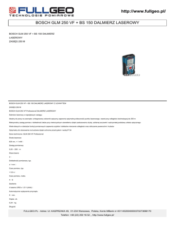 http://www.fullgeo.pl/ BOSCH GLM 250 VF + BS 150 DALMIERZ LASEROWY BOSCH GLM 250 VF + BS 150 DALMIERZ LASEROWY ZASIĘG 250 M BOSCH GLM 250 VF + BS 150 DALMIERZ LASEROWY Z UCHWYTEM ZASIĘG 250 M BOSCH GLM 250 VF Professional DALMIERZ LASEROWY Dalmierz laserowy o największym zasięgu Idealny do pracy na zewnątrz: zintegrowany celownik optyczny zapewnia optymalną widoczność punktu laserowego, nawet przy odległości dochodzącej do 250 m Maksymalny zasięg pomiaru i dokładność także przy niekorzystnym oświetleniu dzięki zastosowaniu dużej, szklanej soczewki i wytrzymałej podstawy układu optycznego Wiele łatwych w obsłudze funkcji pomiarowych zapewnia szybkie i dokładne mierzenie odległości oraz obliczanie powierzchni i kubatur Optymalny do stosowania na budowie dzięki ochronie przed pyłem i wodą IP 54 Dane techniczne: GLM 250 VF Professional Dioda laserowa 635 nm, < 1 mW Zasięg pomiarowy 0,05 – 250 m Klasa lasera 2 Dokładność pomiarowa, typ. ± 1 mm Czas pomiaru, typ. < 0,5 s Czas pomiaru, maks. 4 S Zasilanie 4 baterie LR03 x 1,5 V (AAA) Automatyczne wyłączanie przyrządu 5 min. Ciężar, ok. 0,24 kg Długość FULLGEO.PL - Adres: Ul. KASPRZAKA 49, 01-234 Warszawa, Polska, Konto MBank nr 45114020040000370273896170 Telefon: +48 (22) 250 16 52 ,, http://www.fullgeo.pl/ 120 mm http://www.fullgeo.pl/ Szerokość 66 mm Wysokość 37 mm Jednostki pomiarowe m/cm/mm Liczba zapisanych wyników 30 Czas pracy baterii, pojedyncze pomiary ok. 30.000 Czas pracy baterii, czas działania ok. 5 h Ochrona przed pyłem i wodą IP 54 Funkcje Wbudowany celownik Nr katalogowy 0 601 072 100 4 baterie 1,5 V AAA Pokrowiec Zaczep Certyfikat producenta FULLGEO.PL - Adres: Ul. KASPRZAKA 49, 01-234 Warszawa, Polska, Konto MBank nr 45114020040000370273896170 Telefon: +48 (22) 250 16 52 ,, http://www.fullgeo.pl/
