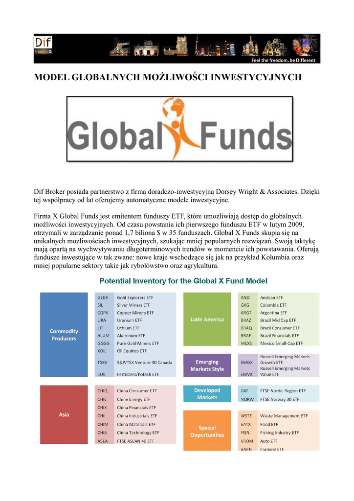 MODEL GLOBALNYCH MOŻLIWOŚCI INWESTYCYJNYCH Dif Broker posiada partnerstwo z firmą doradczo-inwestycyjną Dorsey Wright & Associates. Dzięki tej współpracy od lat oferujemy automatyczne modele inwestycyjne. Firma X Global Funds jest emitentem funduszy ETF, które umożliwiają dostęp do globalnych możliwości inwestycyjnych. Od czasu powstania ich pierwszego funduszu ETF w lutym 2009, otrzymali w zarządzanie ponad 1,7 biliona $ w 35 funduszach. Global X Funds skupia się na unikalnych możliwościach inwestycyjnych, szukając mniej popularnych rozwiązań. Swoją taktykę mają opartą na wychwytywaniu długoterminowych trendów w momencie ich powstawania. Oferują fundusze inwestujące w tak zwane: nowe kraje wschodzące się jak na przykład Kolumbia oraz mniej popularne sektory takie jak rybołówstwo oraz agrykultura. Przyczyną ogromnej popularności Global X Funds jest ich innowacyjność. Dzięki firmie Dorsey Wright mamy jeszcze jedną przewagę, już odpowiednio dobrane i zbilansowane fundusze dobieramy pod względem wzajemnej siły relatywnej. Czyli do naszego modelu inwestycyjnego trafiają tylko fundusze oferujące aktualnie potencjalną najwyższa stopę wzrostu. Proszę zwrócić uwagę, iż nie każdy fundusz zarabia tyle samo w danym czasie. Dlatego tak ważne jest inwestowanie w odpowiednie sektory rynkowe w odpowiednim czasie. Proszę spojrzeć na poniższe zestawienie. Zestawienie najlepszych i najgorszych funduszy w ostatnich latach: Zasady naszego inwestowania: Do naszych inwestycji wykorzystujemy analizę punktowo-symboliczną oraz badamy wzajemną siłę relatywną. Jest to bardzo zdyscyplinowane podejścia, oparte na silnych przesłankach. Uwalniamy się jednocześnie od emocjonalnego, ludzkiego czynnika, gdyż jest to profesjonalne, zdyscyplinowane, automatyczne podejście. Nasze doświadczenie pokazuje, iż trzymanie się poniższych zasad, daje nam zadowalające rezultaty: – obserwujemy i porównujemy 32 fundusze ETF, – środki pieniężne są cały czas zainwestowane, – w portfolio znajdują się 7 najlepszych fundusze ETF w równej wadze, – aby dany ETF trafił do portfolio, musi posiadać wyższy odczyt siły relatywnej nad innymi, – portfolio jest bilansowane raz w tygodniu. Jak badamy wzajemną siłę relatywną? Tworzymy tak zwane zestawienie MATRIX. Przyrównujemy każdy fundusz ETF z każdym. Z tego porównanie odczytujemy informacje który fundusz generuje sygnał kupna względem tego drugiego. Fundusz który generuje najwięcej sygnałów kupna znajduję się na samej górze naszej listy. W ten sposób uzyskujemy 7 najsilniejszych funduszy ETF i to właśnie one w każdym czasie tworzą skład Modelu Globalnych Możliwości Inwestycyjnych. Przykładowy MATRIX: Wyjaśnienie do wykresu znajdującego się poniżej: Liczby na dole wykresu to poszczególne lata Liczby na wykresie to poszczególne miesiące Kolumna O – kolumna spadkowa Kolumna X – kolumna wzrostowa Sygnał kupna generowany jest gdy kolumną X przewyższy poprzednią kolumnę X. Przykładowe generowanie sygnału kupna: W poniższym wykresie widzimy wzajemne porównanie dwóch funduszy z samej góry zestawienia MATRIX. Fundusz THD względem funduszu TUR. Testy historyczne oraz dotychczasowe wyniki: Jako, iż jest to bardzo zdyscyplinowane podejście inwestycyjne, pozwala na wykonanie testów historycznych. Poniżej wyniki globalnego funduszu w porównaniu do międzynarodowego indeksu ** Dotychczasowe wyniki nie mogą stanowić gwarancji przyszłych rezultatów. Jako indeksu dla naszych porównań używamy indeksy MSCIWORLD. Na wykresie powyżej widzimy historyczny zapis, przy założeniu, iż inwestor cały czas porzebywałby w funduszu. Jak widzimy nasz fundusz nie zawsze będzie wyprzedzał indeks MSCI, niemniej jednak w większej perspektywie czasowej, znacznie wyprzeda indeks MSCI. Wyniki takie Dodatkowe zabezpieczanie, dodatkowa przewaga Niezależnie od dobranej metodologii, nie zawsze można zarobić na rynku. W naszych modelach inwestycyjnych zarabiamy tylko na wzrostach. Ale mamy doskonałe narzędzie, które pozwala nam i naszych klientom wyjść z modelów w czasach korekt rynkowych i w czasie bessy. Znowu wykorzystujemy do tego wskaźnik pomiaru względnej siły. W tym przypadku porównujemy Model inwestycyjny z rynkiem pieniężnym, a dokładnie z rynkiem bonów pieniężnych. W ten sposób uzyskujemy jasną informację, czy bardziej opłaca się być w modelu, czy na rynku pieniężnym. Sygnnał wejścia w model, to moment, gdy wzrostowa kolumna X przekracza poprzednią kolumnę X. Sygnał wyjścia z modelu to moment, gdy spadkowa kolumna O, przekracza poprzednią kolumnę O. I tak mamy następująco: data działanie poziom ceny 20-09-07 rozpoczęcie inwestycji 125 213 16-01-08 wyjście z modelu 117 455 16-05-08 wejście w model 121 272 24-07-08 wyjście z modelu 103 350 05-01-09 wejście w model 60 004 16-06-11 wyjście z modelu 156 632 rezultat strata -6,20% strata -14.78 % zysk + 161,00% Poniżej wykres modelu Globalnych Możliwości Inwestycyjnych w porównaniu do rynku pieniężnego. Na wykresie zaznaczone są momenty wejścia i wyjścia z modelu. Zielony kwadrat to moment wejścia w model, czerwony kwadrat to moment wyjścia z modelu. Obecnie model znajduje się w sygnale sprzedaży. Nowych inwestorów zachęcamy już teraz do otwarcia rachunku inwestycyjnego, tak aby w momencie gdy fundusz wygeneruje sygnał kupna, można było rozpocząć inwestowanie w najbardziej gododnym momencie. Anna Dąbrowska Doradca Klienta/Analityk Rynku DIF BROKER S.A. [email protected] www.difbroker.com