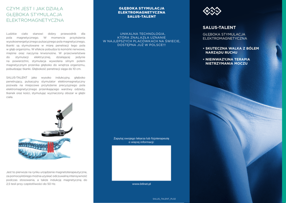 CZYM JEST I JAK DZIAŁA GŁĘBOKA STYMULACJA ELEKTROMAGNETYCZNA GŁĘBOKA STYMULACJA ELEKTROMAGNETYCZNA SALUS-TALENT SALUS-TALENT Ludzkie ciało stanowi dobry przewodnik dla pola magnetycznego. W momencie przyłożenia wysokoenergetycznego pulsacyjnego pola magnetycznego, tkanki są stymulowane w miarę penetracji tego pola w głąb organizmu. W efekcie pobudza to komórki nerwowe, mięśnie oraz naczynia krwionośne. W przeciwieństwie do stymulacji elektrycznej, działającej jedynie na powierzchni, stymulacja wywołana silnym polem magnetycznym przenika głęboko do wnętrza organizmu, pobudzając tkanki. Głębokość penetracji sięga do 10 cm. NUNIKALNA TECHNOLOGIA, KTÓRA ZNALAZŁA UZNANIE W NAJLEPSZYCH PLACÓWKACH NA ŚWIECIE, DOSTĘPNA JUŻ W POLSCE!!! • SKUTECZNA WALKA Z BÓLEM NARZĄDU RUCHU • NIEINWAZYJNA TERAPIA NIETRZYMANIA MOCZU SALUS-TALENT jako wysoko indukcyjny, głęboko penetrujący, pulsacyjny stymulator elektromagnetyczny pozwala na miejscowe przyłożenie precyzyjnego pola elektromagnetycznego przenikającego warstwy odzieży, tkanek oraz kości, stymulując wyznaczony obszar w głębi ciała. Zapytaj swojego lekarza lub fizjoterapeutę o więcej informacji: Jest to pierwsze na rynku urządzenie magnetoterapeutyczne, za pomocą którego można uzyskać odczuwalną intensywność podczas stosowania, a także indukcję magnetyczną do 2,5 tesli przy częstotliwości do 50 Hz. GŁĘBOKA STYMULACJA ELEKTROMAGNETYCZNA www.btlnet.pl SALUS_TALENT_PL02 SALUS-TALENT SALUS-TALENT URO GŁĘBOKA STYMULACJA ELEKTROMAGNETYCZNA W SCHORZENIACH NARZĄDU RUCHU GŁĘBOKA STYMULACJA ELEKTROMAGNETYCZNA W SCHORZENIACH UROGINEKOLOGICZNYCH NAJCZĘSTSZE WSKAZANIA WSKAZANIA • • • • • • • • • • • • schorzenia kręgosłupa zaburzenia układu nerwowego zaburzenia układu mięśniowo-szkieletowego rehabilitacja sportowa osłabienie/zanik mięśni ŚWIATOWA INNOWACJA POTWIERDZONA KLINICZNIE Leczenie głęboką stymulacją elektromagnetyczną z wykorzystaniem aparatu SALUS-TALENT u pacjentów ze schorzeniami narządu ruchu daje bardzo szybkie działanie przeciwbólowe. W krótszym czasie i przy mniejszej liczbie zabiegów uzyskano lepsze efekty końcowe leczenia niż przy zastosowaniu tradycyjnych metod leczenia fizykalnego. nietrzymanie moczu ostre/przewlekłe bóle uroginekologiczne dysfunkcje seksualne przewlekłe zapalenie gruczołu krokowego regeneracja poporodowa wzmocnienie mięśni dna miednicy rehabilitacja po prostatektomii ZWALCZANIE DOLEGLIWOŚCI Bóle barków Bóle odcinka szyjnego Bóle odcinka lędźwiowego Bóle stawu kolanowego ZALETY • • • • • • szybki powrót do sprawności fizycznej skuteczna i bezinwazyjna terapia bezbolesne zabiegi rewelacyjne efekty zabiegi na miejsca niedostępne dla innych terapii bezpieczny w użyciu Według oceny pacjentów zabiegi z zastosowaniem aparatu SALUS-TALENT są bardzo skuteczne. SALUS-TALENT SALUS-TALENT URO Nietrzymanie moczu