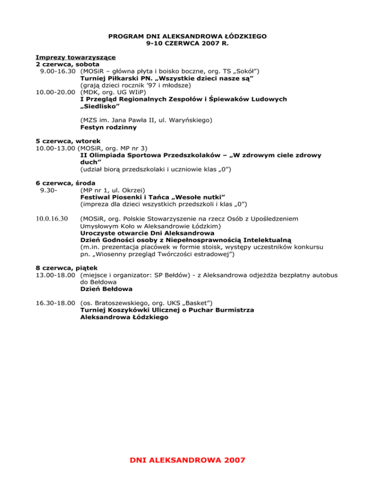 PROGRAM DNI ALEKSANDROWA ŁÓDZKIEGO 9-10 CZERWCA 2007 R. Imprezy towarzyszące 2 czerwca, sobota 9.00-16.30 (MOSiR – główna płyta i boisko boczne, org. TS „Sokół”) Turniej Piłkarski PN. „Wszystkie dzieci nasze są” (grają dzieci rocznik ’97 i młodsze) 10.00-20.00 (MDK, org. UG WIiP) I Przegląd Regionalnych Zespołów i Śpiewaków Ludowych „Siedlisko” (MZS im. Jana Pawła II, ul. Waryńskiego) Festyn rodzinny 5 czerwca, wtorek 10.00-13.00 (MOSiR, org. MP nr 3) II Olimpiada Sportowa Przedszkolaków – „W zdrowym ciele zdrowy duch” (udział biorą przedszkolaki i uczniowie klas „0”) 6 czerwca, środa 9.30(MP nr 1, ul. Okrzei) Festiwal Piosenki i Tańca „Wesołe nutki” (impreza dla dzieci wszystkich przedszkoli i klas „0”) 10.0.16.30 (MOSiR, org. Polskie Stowarzyszenie na rzecz Osób z Upośledzeniem Umysłowym Koło w Aleksandrowie Łódzkim) Uroczyste otwarcie Dni Aleksandrowa Dzień Godności osoby z Niepełnosprawnością Intelektualną (m.in. prezentacja placówek w formie stoisk, występy uczestników konkursu pn. „Wiosenny przegląd Twórczości estradowej”) 8 czerwca, piątek 13.00-18.00 (miejsce i organizator: SP Bełdów) - z Aleksandrowa odjeżdża bezpłatny autobus do Bełdowa Dzień Bełdowa 16.30-18.00 (os. Bratoszewskiego, org. UKS „Basket”) Turniej Koszykówki Ulicznej o Puchar Burmistrza Aleksandrowa Łódzkiego DNI ALEKSANDROWA 2007 9.06.2007 r. , sobota (MOSiR, scena główna) 15.00-16.00 Występy młodzieży i dzieci – wychowanków Młodzieżowego Domu Kultury w Aleksandrowie Łódzkim 16.15-17.15 Koncert Laureatów XV Przeglądu „Aleksandrowska Wiosna 2007” 17.30-18.30 Format 18.45-19.45 Samokhin Band 20.00-21.00 Nick Name 21.15-22.30 Dżem 22.30-23.30 DJ 23.30 Zakończenie wieczoru Towarzysząco w sobotę na obiekcie MOSiR: 15.00-17.00 Regionalne Centrum Krwiolecznictwa i Krwiodawstwa – akcja pobierania krwi 15.00-16.30 Zabawy lekkoatletyczne dla dzieci i rodziców – bieżnia i płyta główna boiska 16.00-19.00 Kącik medyczny SP ZOZ Aleksandrów Łódzki – nauka badania piersi, mierzenie ciśnienia krwi 17.00 Mecz o mistrzostwo IV ligi: „Sokół-Syguła” – WOY Opoczno 10.06.2007 r., niedziela (MOSiR, scena główna) 14.00-15.00 Występ chóru przedszkolnego (Miejskie Przedszkole nr 2) Występy laureatów II Gminnego Przeglądu Teatralnego Sześciolatków „Mali aktorzy na dużej scenie” 15.15-15.45 „Królewna Śnieżka” – przedstawienie w wykonaniu rodziców dzieci z Miejskiego Przedszkola nr 1 przy ul. Okrzei 16.0.16.30 „A nad nią szumiał gaj” – program muzyczny DH szczepu „Zarzewie” 16.30-17.00 Bogusław Hoba – śpiewa własne kompozycje 17.00-17.45 Monika Maślińska, Tomek Ogrodowczyk i zespół Anitroche 18.00-19.00 Caraoke dla wszystkich 19.15-20.15 Kabaret Afera 20.30-21.45 Adrianna Biedrzyńska – pieśni biesiadne 22.00 Zakończenie wieczoru Towarzysząco w niedzielę na obiekcie MOSiR: 14.00-16.00 Finał III Turnieju Piłki Nożnej Drużyn Amatorskich o Puchar Burmistrza Aleksandrowa Łódzkiego - boisko boczne 16.00-17.15 Towarzyski mecz piłki nożnej DNI ALEKSANDROWA 2007