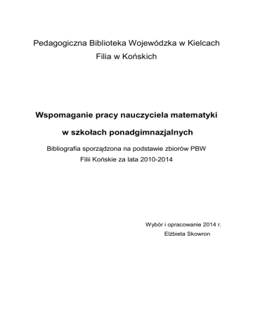 Pedagogiczna Biblioteka Wojewódzka w Kielcach Filia w Końskich Wspomaganie pracy nauczyciela matematyki w szkołach ponadgimnazjalnych Bibliografia sporządzona na podstawie zbiorów PBW Filii Końskie za lata 2010-2014 Wybór i opracowanie 2014 r. Elżbieta Skowron Wstęp Minister Edukacji Narodowej co roku, na podstawie przepisów ustawy o systemie oświaty (art. 35 ust. 2 pkt ustala podstawowe kierunki realizacji polityki oświatowej państwa. Zgodnie z zaleceniem MEN rok szkolny 2014/15 to wspomaganie pracy nauczyciela matematyki w szkołach ponadgimnazjalnych. Biblioteka sporządziła bibliografię pomocną dla nauczyciela. Została ona podzielona tematycznie na : 1. Wybrane zagadnienia z matematyki pomocne dla nauczyciela i ucznia - kółka - olimpiady - matura - matematyka za granicą 2. Wybrane serwisy informacyjne dla nauczycieli W ramach poszczególnych działów zastosowano podział na : - książki ; - czasopisma ; - serwisy internetowe Pozycje książkowe mają przyporządkowany numer i znajdują się w wypożyczalni, a czasopisma w czytelni. Zasięg bibliografii to lata 2010-2014. Mogą z niej korzystać nie tylko nauczyciele ale i studenci, uczniowie i wszystkich, których interesuje matematyka z zakresu szkoły ponadgimnazjalnej. Książki 1. Jak pracować z uczniem zdolnym? : poradnik nauczyciela matematyk i/ praca zbiorowa pod red. Małgorzaty Mikołajczyk. – Warszawa : Ośrodek Rozwoju Edukacji, 2012. – 213 s. : il. ; 24 cm Poradnik zawiera zagadnienia istotne dla nauczania metematyki na II, III i IV etapie edukacyjnym i jest skierowany do nauczycieli uczniów uzdolnionych matematycznie Sygn. 48139 Czytelnia 2. Projekt: Akademia kompetencji kluczowych - program rozwoju uczniów szkół ponadgimnazjalnych Polski Wschodniej : raport szkoleniowy / [oprac. Zakład Systemów Informacyjnych Instytutu Maszyn Matematycznych. - Warszawa : Instytut Maszyn Matematycznych, 2012. - 164 s. : il. ; 24 cm. Sygn. 48131 Wypożyczalnia Czasopima 3. Adamczyk, Mariusz : Twierdzenie o odcinkach w czworokącie / Mariusz Adamczyk //„Matematyka”. – 2011, nr 7, s. 38-42 4. Apt, Krzysztof : Indukcja dla początkujących / Krzysztof Apt //„Matematyka”. – 2012, nr 11, s. 40-46 5. Barycka, Bogna : Fizyczne kłopoty z matematyką : czyli licz jak ucho – logarytmuj / Bogna Barycka // „Matematyka. – 2014, nr 3, s. 442-45 6. Barycka, Bogna : Fizyczne klopoty z matematyką 2 : czyli licz rozpady – logarytmuj //„Matematyka. – 2014, nr 3, s. 58-60 7. Barycka, Bogna : Fizyczne kłopoty z matematyką 4 : znów optyka geometryczna – soczewki całkiem płaskie / Bogna Barycka // „Matematyka. – 2014, nr 6, s. 54 Zadania z rozwiązaniem. 8. Bednarek, Witold : Czy istnieją takie wzory / Witold Bednarek //„Matematyka. – 2013, nr 2, s. 4 50 9. Bednarek, Witold : Dwa w jednym / Witold Bednarek //„Matematyka”. – 2013, nr 4, s.50-51 10. Bednarek, Witold : Liczby jedynkowe w różnych systemach pozycyjnych / Witold Bednarek //„Matematyka”. – 2013, nr 5, s. 5-6 11. Bednarek, Witold : Liczby trójkątne a potęgi / Witold Bednarek //„Matematyka. – 2013, nr 2, s. 43-44 12. Bednarek, Witold : O pewnym podziale trójkąta / Witold Bednarek //„Matematyka. – 2014, nr 2, s. 58-60 13. Bednarek, Witold : O pewnym równaniu funkcyjnym / Witold Bednarek //„Matematyka”. – 2011, nr 4, s. 50-51 14. Bednarek, Witold : O wyrazach ciągu geometrycznego / Witold Bednarek //„Matematyka”. – 2012, nr 9, s. 55-56 15. Bednarek, Witold : Odcinki równoległe w wielokącie foremnym / Witold Bednarek //„Matematyka”. – 2013, nr 5, s. 7-8 16. Bednarek, Witold : Objętość kuli i stożka / Witold Bednarek //„Matematyka”. – 2013, nr 4, s.47-49 17. Bednarek, Witold : Parabola i hiperbola / Witold Bednarek //„Matematyka”. – 2011, nr 4, s. 46 18. Bednarek, Witold : Reszta z dzielenia wielomianu przez trójmian / Witold Bednarek //„Matematyka”. – 2011, nr 3, s. 45-47 19. Bednarek, Witold : Styczne prostopadłe / Witold Bednarek // „Matematyka”. – 2013, nr 6, s. 52-55 20. Bednarek, Witold : Ułamki okresowe : dlaczego jedne ułamki są okresowe a inne nie? / Witold Bednarek //„Matematyka”. – 2012, nr 6, s. 29-32 21. Bednarek, Witold : Wielomiany a liczby pierwsze / Witold Bednarek //„Matematyka. – 2013, nr 2, s. 51-53 22. Bolanowska, Monika : Gwiazdki – wielokąty gwiaździste / Monika Bolanowska //„Matematyka”. – 2011, nr 11, s. 30-34 23. Bolanowska, Monika : Wielkości proporcjonalne do kilku innych / Monika Bolanowska //„Matematyka”. – 2010, nr 10, s. 620-627 24. Bolanowska, Monika : Wykresy funkcji logarytmicznych – karta pracy / Monika Bolanowska //„Matematyka”. – 2011, nr 5, s. 35-40 25. Ferdek, Franciszek : Ciągłość funkcji / Franciszek Ferdek //„Matematyka”. – 2013, nr 11, s. 59-61 26. Ferdek, Franciszek : Punkty stałe / Franciszek Ferdek //„Matematyka”. – 2012, nr 11, s. 29-36 27. Herma, Agnieszka : Matematyka inspirowana fotografią / Agnieszka Herma //„Matematyka”. – 2012, nr 11, s. 26-28 28. Hoffmann, Agata : Finanse wrocławskich krasnoludków (2) / Agata Hoffmann //„Matematyka”. – 2012, nr 9, s. 34-39 29. Karkut, Janusz : Algrbraicznie czy geometrycznie? / Janusz Karkut //„Matematyka”. – 2011, nr 9, s. 42-43 30. Karkut, Janusz : Obwód 508 / Janusz Karkut //„Matematyka”. – 2011, nr 9, s. 44 31. Karkut, Janusz : Optymalizacja : rozwiązania z luką / Janusz Karkut //„Matematyka. – 2014, nr 1, s. 45-47 32. Kmiecik, Piotr : O liczbie trójkątów / Piotr Kmiecik //„Matematyka. – 2013, nr 6, s. 49-53 33. Kmiecik, Piotr : Zadanie o liczbie trójkątów / Piotr Kmiecik //„Matematyka”. – 2013, nr 6, s. 49-51 34. Kremzer, Michał : Metoda a sposób / Michał Kremzer //„Matematyka”. – 2010, nr 6, s. 370 35. Kremzer, Michał : Okresy podstawowe : proste pytania są najciekawsze / Michał Kremzer //„Matematyka”. – 2012, nr 5, s. 53-54 36. Kremzer, Mic