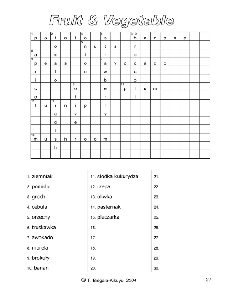 1 2 p 4 o t a t 6 o 9/10 s b a n a a d o u m n a 5 o n m i u t s r 8 a r 3 o 7 p e a r t i o s o a n w v c o c c b 13 12 o o 11 o e l r p l i 14 t u r n i a v d e p r y i 15 m u s h r o o m h 1. ziemniak 11. słodka kukurydza 21. 2. pomidor 12. rzepa 22. 3. groch 13. oliwka 23. 4. cebula 14. pasternak 24. 5. orzechy 15. pieczarka 25. 6. truskawka 16. 26. 7. awokado 17. 27. 8. morela 18. 28. 9. brokuły 19. 29. 10. banan 20. 30. © T. Biegala-Kikuyu 2004 27