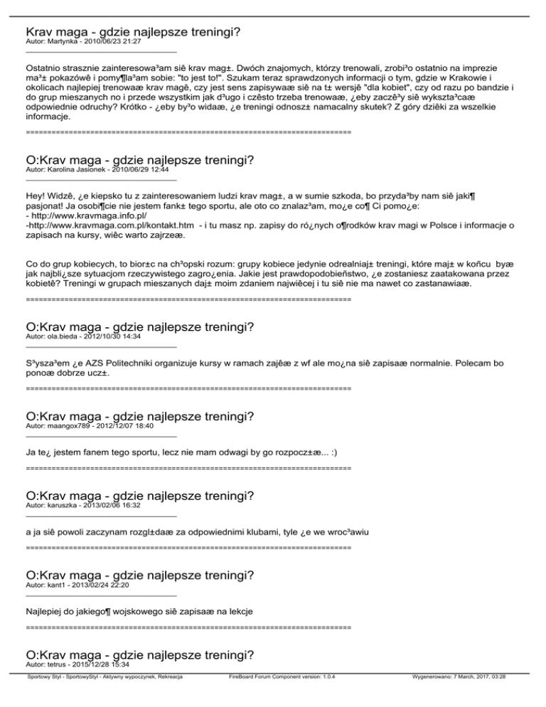Krav maga - gdzie najlepsze treningi? Autor: Martynka - 2010/06/23 21:27 _____________________________________ Ostatnio strasznie zainteresowa³am siê krav mag±. Dwóch znajomych, którzy trenowali, zrobi³o ostatnio na imprezie ma³± pokazówê i pomy¶la³am sobie: "to jest to!". Szukam teraz sprawdzonych informacji o tym, gdzie w Krakowie i okolicach najlepiej trenowaæ krav magê, czy jest sens zapisywaæ siê na t± wersjê "dla kobiet", czy od razu po bandzie i do grup mieszanych no i przede wszystkim jak d³ugo i czêsto trzeba trenowaæ, ¿eby zaczê³y siê wykszta³caæ odpowiednie odruchy? Krótko - ¿eby by³o widaæ, ¿e treningi odnosz± namacalny skutek? Z góry dziêki za wszelkie informacje. ============================================================================ O:Krav maga - gdzie najlepsze treningi? Autor: Karolina Jasionek - 2010/06/29 12:44 _____________________________________ Hey! Widzê, ¿e kiepsko tu z zainteresowaniem ludzi krav mag±, a w sumie szkoda, bo przyda³by nam siê jaki¶ pasjonat! Ja osobi¶cie nie jestem fank± tego sportu, ale oto co znalaz³am, mo¿e co¶ Ci pomo¿e: - http://www.kravmaga.info.pl/ -http://www.kravmaga.com.pl/kontakt.htm - i tu masz np. zapisy do ró¿nych o¶rodków krav magi w Polsce i informacje o zapisach na kursy, wiêc warto zajrzeæ. Co do grup kobiecych, to bior±c na ch³opski rozum: grupy kobiece jedynie odrealniaj± treningi, które maj± w koñcu byæ jak najbli¿sze sytuacjom rzeczywistego zagro¿enia. Jakie jest prawdopodobieñstwo, ¿e zostaniesz zaatakowana przez kobietê? Treningi w grupach mieszanych daj± moim zdaniem najwiêcej i tu siê nie ma nawet co zastanawiaæ. ============================================================================ O:Krav maga - gdzie najlepsze treningi? Autor: ola.bieda - 2012/10/30 14:34 _____________________________________ S³ysza³em ¿e AZS Politechniki organizuje kursy w ramach zajêæ z wf ale mo¿na siê zapisaæ normalnie. Polecam bo ponoæ dobrze ucz±. ============================================================================ O:Krav maga - gdzie najlepsze treningi? Autor: maangox789 - 2012/12/07 18:40 _____________________________________ Ja te¿ jestem fanem tego sportu, lecz nie mam odwagi by go rozpocz±æ... :) ============================================================================ O:Krav maga - gdzie najlepsze treningi? Autor: karuszka - 2013/02/06 16:32 _____________________________________ a ja siê powoli zaczynam rozgl±daæ za odpowiednimi klubami, tyle ¿e we wroc³awiu ============================================================================ O:Krav maga - gdzie najlepsze treningi? Autor: kant1 - 2013/02/24 22:20 _____________________________________ Najlepiej do jakiego¶ wojskowego siê zapisaæ na lekcje ============================================================================ O:Krav maga - gdzie najlepsze treningi? Autor: tetrus - 2015/12/28 15:34 Sportowy Styl - SportowyStyl - Aktywny wypoczynek, Rekreacja FireBoard Forum Component version: 1.0.4 Wygenerowano: 7 March, 2017, 03:28 _____________________________________ Nasza agencja detektywistyczna zafundowa³a swego czasu kurs podstawowy krav magi i paru osobom przyda³o siê to w pracy. Techniki stosowane w tym stylu s± naprawdê u¿yteczne przy samoobronie. ============================================================================ Sportowy Styl - SportowyStyl - Aktywny wypoczynek, Rekreacja FireBoard Forum Component version: 1.0.4 Wygenerowano: 7 March, 2017, 03:28