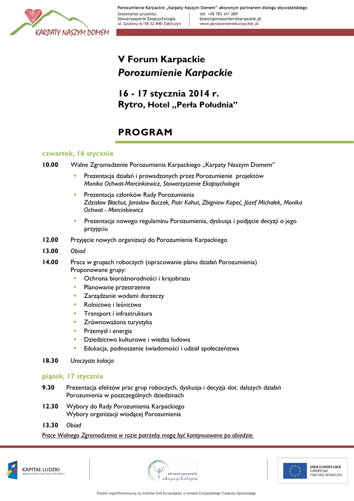 V Forum Karpackie Porozumienie Karpackie 16 - 17 stycznia 2014 r. Rytro, Hotel „Perła Południa” PROGRAM czwartek, 16 stycznia 10.00 Walne Zgromadzenie Porozumienia Karpackiego „Karpaty Naszym Domem” Prezentacja działań i prowadzonych przez Porozumienie projektów Monika Ochwat-Marcinkiewicz, Stowarzyszenie Ekopsychologia Prezentacja członków Rady Porozumienia Zdzisław Błachut, Jarosław Buczek, Piotr Kohut, Zbigniew Kopeć, Józef Michałek, Monika Ochwat - Marcinkiewicz Prezentacja nowego regulaminu Porozumienia, dyskusja i podjęcie decyzji o jego przyjęciu 12.00 Przyjęcie nowych organizacji do Porozumienia Karpackiego 13.00 Obiad 14.00 Praca w grupach roboczych (opracowanie planu działań Porozumienia) Proponowane grupy: Ochrona bioróżnorodności i krajobrazu Planowanie przestrzenne Zarządzanie wodami dorzeczy Rolnictwo i leśnictwo Transport i infrastruktura Zrównoważona turystyka Przemysł i energia Dziedzictwo kulturowe i wiedza ludowa Edukacja, podnoszenie świadomości i udział społeczeństwa 18.30 Uroczysta kolacja piątek, 17 stycznia 9.30 Prezentacja efektów prac grup roboczych, dyskusja i decyzja dot. dalszych działań Porozumienia w poszczególnych dziedzinach 12.30 Wybory do Rady Porozumienia Karpackiego Wybory organizacji wiodącej Porozumienia 13.30 Obiad Prace Walnego Zgromadzenia w razie potrzeby mogą być kontynuowane po obiedzie.