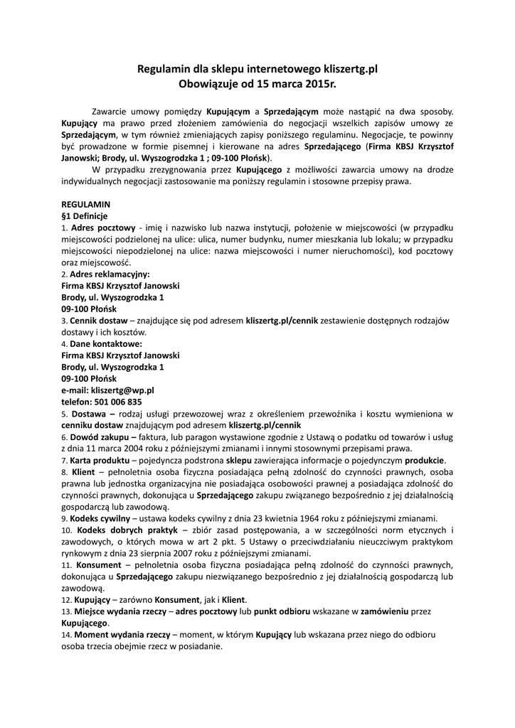 Regulamin dla sklepu internetowego kliszertg.pl Obowiązuje od 15 marca 2015r. Zawarcie umowy pomiędzy Kupującym a Sprzedającym może nastąpić na dwa sposoby. Kupujący ma prawo przed złożeniem zamówienia do negocjacji wszelkich zapisów umowy ze Sprzedającym, w tym również zmieniających zapisy poniższego regulaminu. Negocjacje, te powinny być prowadzone w formie pisemnej i kierowane na adres Sprzedającego (Firma KBSJ Krzysztof Janowski; Brody, ul. Wyszogrodzka 1 ; 09-100 Płońsk). W przypadku zrezygnowania przez Kupującego z możliwości zawarcia umowy na drodze indywidualnych negocjacji zastosowanie ma poniższy regulamin i stosowne przepisy prawa. REGULAMIN §1 Definicje 1. Adres pocztowy - imię i nazwisko lub nazwa instytucji, położenie w miejscowości (w przypadku miejscowości podzielonej na ulice: ulica, numer budynku, numer mieszkania lub lokalu; w przypadku miejscowości niepodzielonej na ulice: nazwa miejscowości i numer nieruchomości), kod pocztowy oraz miejscowość. 2. Adres reklamacyjny: Firma KBSJ Krzysztof Janowski Brody, ul. Wyszogrodzka 1 09-100 Płońsk 3. Cennik dostaw – znajdujące się pod adresem kliszertg.pl/cennik zestawienie dostępnych rodzajów dostawy i ich kosztów. 4. Dane kontaktowe: Firma KBSJ Krzysztof Janowski Brody, ul. Wyszogrodzka 1 09-100 Płońsk e-mail: [email protected] telefon: 501 006 835 5. Dostawa – rodzaj usługi przewozowej wraz z określeniem przewoźnika i kosztu wymieniona w cenniku dostaw znajdującym pod adresem kliszertg.pl/cennik 6. Dowód zakupu – faktura, lub paragon wystawione zgodnie z Ustawą o podatku od towarów i usług z dnia 11 marca 2004 roku z późniejszymi zmianami i innymi stosownymi przepisami prawa. 7. Karta produktu – pojedyncza podstrona sklepu zawierająca informacje o pojedynczym produkcie. 8. Klient – pełnoletnia osoba fizyczna posiadająca pełną zdolność do czynności prawnych, osoba prawna lub jednostka organizacyjna nie posiadająca osobowości prawnej a posiadająca zdolność do czynności prawnych, dokonująca u Sprzedającego zakupu związanego bezpośrednio z jej działalnością gospodarczą lub zawodową. 9. Kodeks cywilny – ustawa kodeks cywilny z dnia 23 kwietnia 1964 roku z późniejszymi zmianami. 10. Kodeks dobrych praktyk – zbiór zasad postępowania, a w szczególności norm etycznych i zawodowych, o których mowa w art 2 pkt. 5 Ustawy o przeciwdziałaniu nieuczciwym praktykom rynkowym z dnia 23 sierpnia 2007 roku z późniejszymi zmianami. 11. Konsument – pełnoletnia osoba fizyczna posiadająca pełną zdolność do czynności prawnych, dokonująca u Sprzedającego zakupu niezwiązanego bezpośrednio z jej działalnością gospodarczą lub zawodową. 12. Kupujący – zarówno Konsument, jak i Klient. 13. Miejsce wydania rzeczy – adres pocztowy lub punkt odbioru wskazane w zamówieniu przez Kupującego. 14. Moment wydania rzeczy – moment, w którym Kupujący lub wskazana przez niego do odbioru osoba trzecia obejmie rzecz w posiadanie. 15. Płatność – metoda dokonania zapłaty za przedmiot umowy i dostawę wymieniona pod adresem kliszertg.pl/sposobyplatnosci 16. Prawo konsumenckie – ustawa o prawach konsumenta z dnia 30 maja 2014 roku. 17. Produkt – minimalna i niepodzielna ilość rzeczy, która może być przedmiotem zamówienia, a która podana jest w sklepie Sprzedającego jako jednostka miary przy określeniu jego ceny (cena/jednostka). 18. Przedmiot umowy – produkty i dostawa będące przedmiotem umowy. 19. Przedmiot świadczenia – przedmiot umowy. 20. Punkt odbioru – miejsce wydania rzeczy nie będące adresem pocztowym, wymienione w zestawieniu udostępnionym przez Sprzedającego w sklepie. 21. Rzecz – rzecz ruchoma mogąca być lub będąca przedmiotem umowy. 22. Sklep – serwis internetowy dostępny pod adresem kliszertg.pl, za pośrednictwem którego Kupujący może złożyć zamówienie. 23. Sprzedający: Firma KBSJ Krzysztof Janowski Brody, ul. Wyszogrodzka 1 09-100 Płońsk NIP: 113-212-30-88, REGON: 130950471, zarejestrowany i widoczny w ewidencji CEIDG pod adresem: https://prod.ceidg.gov.pl/CEIDG/CEIDG.Public.UI/EntryChangeHistory.aspx?Id=a9aa9ce3-3b35-4929-97256633707bc993&archival KONTO BANKOWE: 91 1950 0001 2006 0203 4485 0002 24. System – zespół współpracujących ze sobą urządzeń informatycznych i oprogramowania, zapewniający przetwarzanie i przechowywanie, a także wysyłanie i odbieranie danych poprzez sieci telekomunikacyjne za pomocą właściwego dla danego rodzaju sieci urządzenia końcowego, potocznie określany Internetem. 25. Termin realizacji – podana na karcie produktu liczba godzin lub dni roboczych. 26. Umowa – umowa zawierana poza lokalem przedsiębiorcy lub na odległość w rozumieniu Ustawy o prawach konsumenta z dnia 30 maja 2014 roku w przypadku Konsumentów i umowa sprzedaży w rozumieniu art. 535 Ustawy kodeks cywilny z dnia 23 kwietnia 1964 roku w przypadku Kupujących. 27. Wada – zarówno wada fizyczna, jak i wada prawna. 28. Wada fizyczna – niezgodność rzeczy sprzedanej z umową, a w szczególności jeśli rzecz: a. nie ma ona właściwości, które rzecz tego rodzaju powinna mieć ze względu na cel w umowie oznaczony albo wynikający z okoliczności lub przeznaczenia; b. nie ma właściwości, o których istnieniu Sprzedający zapewnił Konsumenta, c. nie nadaje się do celu, o którym Konsument poinformował Sprzedającego przy zawarciu umowy, a Sprzedający nie zgłosił zastrzeżenia co do takiego jej przeznaczenia; d. została Konsumentowi wydana w stanie niezupełnym; e. w razie nieprawidłowego jej zamontowania i uruchomienia, jeżeli czynności te zostały wykonane przez Sprzedającego lub osobę trzecią, za którą Sprzedający ponosi odpowiedzialność, albo przez Konsumenta, który postąpił według instrukcji otrzymanej od Sprzedającego; f. nie ma ona właściwości, o której zapewniał producent lub jego przedstawiciel lub osoba, która wprowadza rze