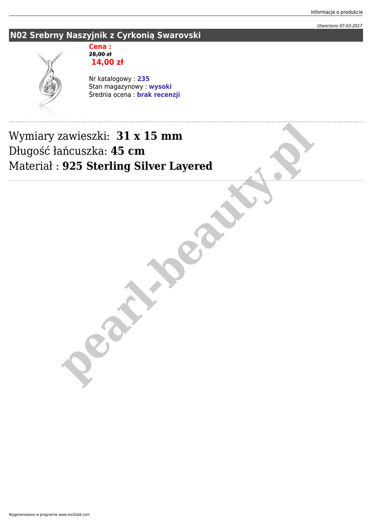 Informacje o produkcie Utworzono 07-03-2017 N02 Srebrny Naszyjnik z Cyrkonią Swarovski Cena : 28,00 zł 14,00 zł pe ar lbe au ty . Wymiary zawieszki: 31 x 15 mm Długość łańcuszka: 45 cm Materiał : 925 Sterling Silver Layered pl Nr katalogowy : 235 Stan magazynowy : wysoki Średnia ocena : brak recenzji Wygenerowano w programie www.oscGold.com