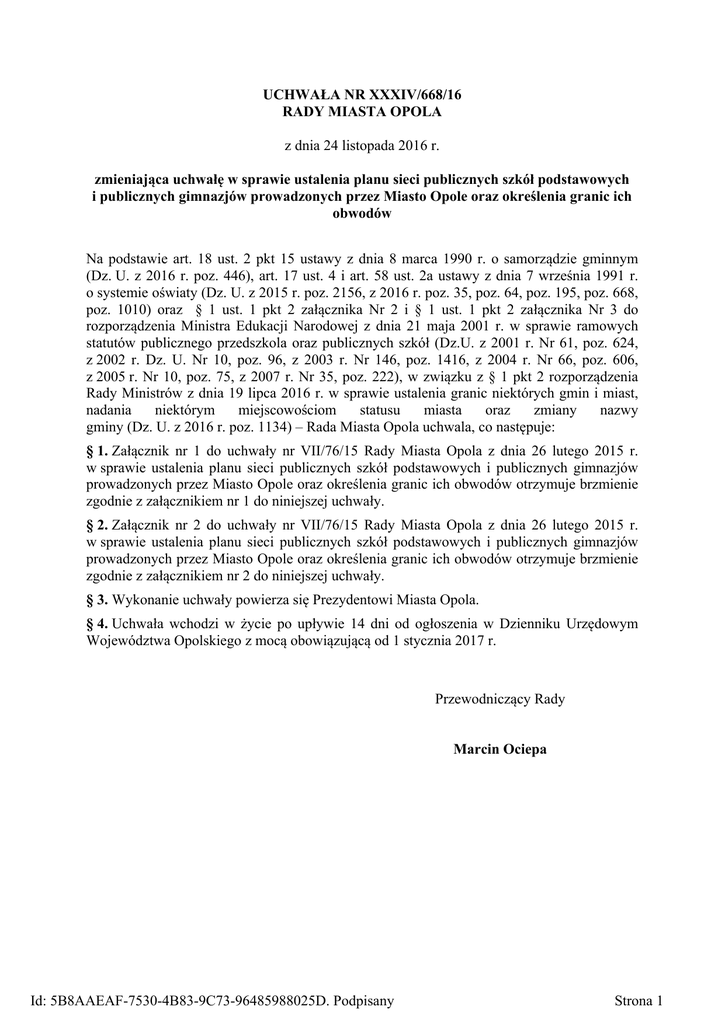 UCHWAŁA NR XXXIV/668/16 RADY MIASTA OPOLA z dnia 24 listopada 2016 r. zmieniająca uchwałę w sprawie ustalenia planu sieci publicznych szkół podstawowych i publicznych gimnazjów prowadzonych przez Miasto Opole oraz określenia granic ich obwodów Na podstawie art. 18 ust. 2 pkt 15 ustawy z dnia 8 marca 1990 r. o samorządzie gminnym (Dz. U. z 2016 r. poz. 446), art. 17 ust. 4 i art. 58 ust. 2a ustawy z dnia 7 września 1991 r. o systemie oświaty (Dz. U. z 2015 r. poz. 2156, z 2016 r. poz. 35, poz. 64, poz. 195, poz. 668, poz. 1010) oraz § 1 ust. 1 pkt 2 załącznika Nr 2 i § 1 ust. 1 pkt 2 załącznika Nr 3 do rozporządzenia Ministra Edukacji Narodowej z dnia 21 maja 2001 r. w sprawie ramowych statutów publicznego przedszkola oraz publicznych szkół (Dz.U. z 2001 r. Nr 61, poz. 624, z 2002 r. Dz. U. Nr 10, poz. 96, z 2003 r. Nr 146, poz. 1416, z 2004 r. Nr 66, poz. 606, z 2005 r. Nr 10, poz. 75, z 2007 r. Nr 35, poz. 222), w związku z § 1 pkt 2 rozporządzenia Rady Ministrów z dnia 19 lipca 2016 r. w sprawie ustalenia granic niektórych gmin i miast, nadania niektórym miejscowościom statusu miasta oraz zmiany nazwy gminy (Dz. U. z 2016 r. poz. 1134) – Rada Miasta Opola uchwala, co następuje: § 1. Załącznik nr 1 do uchwały nr VII/76/15 Rady Miasta Opola z dnia 26 lutego 2015 r. w sprawie ustalenia planu sieci publicznych szkół podstawowych i publicznych gimnazjów prowadzonych przez Miasto Opole oraz określenia granic ich obwodów otrzymuje brzmienie zgodnie z załącznikiem nr 1 do niniejszej uchwały. § 2. Załącznik nr 2 do uchwały nr VII/76/15 Rady Miasta Opola z dnia 26 lutego 2015 r. w sprawie ustalenia planu sieci publicznych szkół podstawowych i publicznych gimnazjów prowadzonych przez Miasto Opole oraz określenia granic ich obwodów otrzymuje brzmienie zgodnie z załącznikiem nr 2 do niniejszej uchwały. § 3. Wykonanie uchwały powierza się Prezydentowi Miasta Opola. § 4. Uchwała wchodzi w życie po upływie 14 dni od ogłoszenia w Dzienniku Urzędowym Województwa Opolskiego z mocą obowiązującą od 1 stycznia 2017 r. Przewodniczący Rady Marcin Ociepa Id: 5B8AAEAF-7530-4B83-9C73-96485988025D. Podpisany Strona 1 Załącznik nr 1 do uchwały nr XXXIV/668/16 Rady Miasta Opola z dnia 24 listopada 2016 r. Plan sieci publicznych szkół podstawowych prowadzonych przez Miasto Opole oraz granice ich obwodów Nazwa szkoły Nazwy ulic lub ich części należące do obwodu publicznej szkoły podstawowej 1. 2. Publiczna Szkoła Podstawowa nr 1 im. Obrońców Westerplatte w Opolu, ul. Władysława Reymonta 43 1 Maja - numery parzyste od nr. 2 do nr. 8 i numery nieparzyste od nr. 1 do nr. 47, 11 Listopada, Adama Asnyka, Armii Krajowej, Norberta Barlickiego, Browarna, Dekabrystów, Stanisława Dubois, Fabryczna, Franciszkańska, Graniczna, Klasztorna, Jana Kochanowskiego, Jana Kropidły, Kamienna, Konduktorska, Konsularna, Wojciecha Korfantego, Tadeusza Kościuszki, Kowalska, Krakowska, Księcia Jana Dobrego, Księdza Hugona Kołłątaja, Księdza Konstantego Damrota, Mały Rynek, Minorytów, Wolfganga Amadeusza Mozarta, Mieczysława Niedziałkowskiego, Cypriana Kamila Norwida, Odrowążów, Ostrówek, Ozimska – numery parzyste i numery nieparzyste od nr. 1 do nr. 44, Pasieczna, Piastowska, Piwna, Plac Ignacego Daszyńskiego, Plac Wolności, Podgórna, Leona Powolnego, Powstańców Śląskich, Władysława Reymonta, Marii Rodziewiczówny, Stefanii Sempołowskiej, Skromna, Spacerowa, Andrzeja Struga, Strzelców Bytomskich, Św. Jacka, Targowa, Torowa, Józefa Walecki, Wapienna, Zwierzyniecka, Żwirki i Wigury Publiczna Szkoła Podstawowa nr 2 im. Polskich Olimpijczyków w Opolu, ul. Katowicka 35 1 Maja - numery parzyste od nr. 10A do nr. 114 i numery nieparzyste od nr. 49 do nr. 149, Cementowa, Romana Dmowskiego, Wojciecha Drzymały, Jakuba Kani, Jana Kasprowicza, Katowicka, Kolejowa, Józefa Ignacego Kraszewskiego, Juliusza Ligonia, Karola Miarki, Adama Mickiewicza, Elizy Orzeszkowej, Ozimska – numery parzyste od nr. 46 do nr. 68 i numery nieparzyste od nr. 47 do nr. 95, Plac Adama Mickiewicza, Plebiscytowa - numery parzyste od nr. 20 do nr. 120 i numery nieparzyste od nr. 1 do nr. 23, Przemysłowa, Bolesława Prusa, Tadeusza Rejtana, Robotnicza, Juliusza Słowackiego, Pawła Stalmacha, Telesfora, Warsztatowa, Gabrieli Zapolskiej Id: 5B8AAEAF-7530-4B83-9C73-96485988025D. Podpisany Strona 2 Publiczna Szkoła Podstawowa nr 5 z Oddziałami Integracyjnymi im. Karola Musioła w Opolu, ul. Majora "Hubala" 2 Szkoła wchodzi w skład Zespołu Szkół z Oddziałami Integracyjnymi Borysławska, Emila Fieldorfa, Jana Bytnara „Rudego”, Grodzieńska, Halicka, Kresowa, Lwowska, Majora „Hubala”, Stanisława Mikołajczyka, Nowogródzka, Stefana “Grota” Roweckiego, Kazimierza Pużaka, Samborska, Stanisławowska, Stryjska, Tarnopolska, Wileńska Publiczna Szkoła Podstawowa nr 7 im. Jakuba Kani w Opolu, ul. Budowlanych 40 Bałtycka, Budowlanych, Bytomska, Chorzowska, Józefa Cygana, Czarnowąska – numery nieparzyste od nr. 1 do nr. 31 i numery parzyste od nr. 2 do nr. 12, Domowa, Działkowa, Gawędy, Teodora Glenska, Gliwicka, Bartosza Głowackiego, Gminna, Gościnna, Grodzka, Harcerska, Kępska, Kluczborska, Kozielska, Krzanowicka – numery nieparzyste od nr. 33 do nr. 79 i numery parzyste od nr. 56 do nr. 80, Księdza Czesława Klimasa, Michała Korneckiego, Księdza Karola Koziołka, Leśnicka, Magazynowa, Andrzeja Mielęckiego, Mikołaja – numery nieparzyste od nr. 1 do nr. 5 i numery parzyste od nr. 2 do końca, Adama Napieralskiego, Osadnicza, Plac Księdza Józefa Szafranka, Portowa, Prudnicka, Przyjazna, Ptasia, Raciborska, Rodła, Rolna, Składowa, Jana Sobieskiego, Sołtysów, Śluza Wróblin, Świętej Anny, Tarnogórska, Usługowa, Wiankowa, Wiśniowa, Wróblińska, Zabrzańska, Zakładowa Publiczna Szkoła Podstawowa nr 8 im. Gustawa Morcinka w Opolu, ul. Księdza Norberta Bonczyka 13 Czysta, Księdza Norberta Bonczyka, Księdza Piotra 