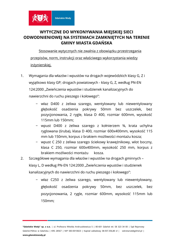WYTYCZNE DO WYKONYWANIA MIEJSKIEJ SIECI ODWODNIENIOWEJ NA SYSTEMACH ZAMKNIĘTYCH NA TERENIE GMINY MIASTA GDAŃSKA Stosowanie wytycznych nie zwalnia z obowiązku przestrzegania przepisów, norm, instrukcji oraz właściwego wykorzystania wiedzy inżynierskiej. 1. Wymagania dla włazów i wpustów na drogach wojewódzkich klasy G, Z i wyjątkowo klasy GP; drogach powiatowych - klasy G, Z, według PN-EN 124:2000 „Zwieńczenia wpustów i studzienek kanalizacyjnych do nawierzchni do ruchu pieszego i kołowego”: − właz D400 z żeliwa szarego, wentylowany lub niewentylowany głębokość osadzenia pokrywy 50mm bez uszczelek, bez pozycjonowania, 2 rygle, klasa D 400, rozmiar 600mm, wysokość 115mm lub 150mm; − wpust D400 z żeliwa szarego z kołnierzem ¾, krata uchylna ryglowana (śruba), klasa D 400, rozmiar 600x400mm, wysokość 115 mm lub 150mm, korpus z brakiem możliwości montażu kosza; − wpust C 250 z żeliwa szarego ściekowy krawężnikowy, wlot boczny, klasa C 250, rozmiar 600x400mm, wysokość 250 mm, korpus z brakiem możliwości montażu 2. kosza. Szczegółowe wymagania dla włazów i wpustów na drogach gminnych – klasy L, D według PN-EN 124:2000 „Zwieńczenia wpustów i studzienek kanalizacyjnych do nawierzchni do ruchu pieszego i kołowego”: − właz C250 z żeliwa szarego, wentylowany lub niewentylowany, głębokość osadzenia pokrywy 50mm, bez uszczelek, bez pozycjonowania, 2 rygle, rozmiar 600mm, wysokość 115mm lub 150mm; ”Gdańskie Wody” sp. z o.o. | ul. Profesora Witolda Andruszkiewicza 5 | 80-601 Gdańsk tel. 58 323 34 00 | Sąd Rejonowy Gdańsk-Północ w Gdańsku | KRS 28567 | NIP 583-0010823 | Kapitał zakładowy 38.937.356,80 zł | www.gdanskiewody.pl [email protected] | − wpust C250 z żeliwa szarego z kołnierzem ¾, krata uchylna ryglowana (śruba), rozmiar 600x400mm, wysokość 115 mm lub 150mm, korpus z brakiem możliwości montażu kosza; − wpust C 250 z żeliwa szarego krawężnikowy, wlot boczny, klasa C 250, rozmiar 600x400mm, wysokość 250 mm, korpus z brakiem możliwości montażu kosza; 3. Włazy muszą posiadać logo Gdańska zgodnie z Zarządzeniem nr 744/06 Prezydenta Miasta Gdańska z dnia 10 lipca 2006 r. 4. Stopnie w studniach powinny być mocowane przez producenta kręgów (fabrycznie) lub wykonawcę na 2 śruby (ocynkowane ogniowo). Akceptujemy także stopnie żeliwne w otulinie z tworzywa sztucznego. 5. Włazy wentylowane należy stosować w terenie zielonym i w pasach jezdni, a niewentylowane w pasach ruchu pieszego. 6. W terenie nieutwardzonym wokół włazów wykonać koperty betonowe lub zabruk (średnica 1000 mm lub kwadrat 1000 x 1000 mm). 7. Włazy kanałowe osadzić na płycie pokrywowej regulując wysokość w dostosowaniu do niwelety drogi za pomocą pierścieni dystansowych. Nie należy stosować pierścieni regulacyjnych wyższych niż 20 cm. W przypadku wysokości powyżej 20cm należy zastosować dodatkowy krąg. Dopuszczamy „kominy” max do 20 cm licząc od wierzchu płyty pokrywowej do spodu włazu żeliwnego. Wokół studni grunt zasypowy zagęścić do IS≥0,98.Pod dnem studni podłoże powinno być zagęszczone do IS≥0,98.Wskazane jest wykonanie stabilizacji gruntu cementem o Rm=5,0 MPa z zagęszczeniem do ID=0,60. 8. Korpusy włazów studni rewizyjnych zlokalizowanych w pasie drogowym nachylone pod kątem powyżej 5 stopni oraz w pasach zieleni wymagają kotwienia. ”Gdańskie Wody” sp. z o.o. | ul. Profesora Witolda Andruszkiewicza 5 | 80-601 Gdańsk tel. 58 323 34 00 | Sąd Rejonowy Gdańsk-Północ w Gdańsku | KRS 28567 | NIP 583-0010823 | Kapitał zakładowy 38.937.356,80 zł | www.gdanskiewody.pl [email protected] | 9. Studnie deszczowe muszą posiadać osadnik o głębokości min 0,5m. Dno wykonać jako szczelne oraz na podłożu wzmocnionym. Wszystkie połączenia elementów studzienek muszą zapewnić całkowitą szczelność. Zaleca się stosowanie dolnej części studzienek jako monolitycznej. 10. Odstęp pomiędzy górną krawędzią najwyższego kręgu a dolną częścią płyty nastudziennej powinien wynosić 5-15 cm (dotyczy studni deszczowych). 11. Podczas prac remontowych należy przewidzieć możliwość zmiany usytuowania włazu tak aby stał się nie najazdowy, poprzez obrócenie płyty pokrywowej oraz przełożenie stopni w studni. 12. Szczelinę między krawężnikiem a wpustem deszczowym należy wypełnić asfaltem lub masą plastyczną – zaprawa cementowa jest niedopuszczalna! 13. W przypadku znacznego odsunięcia wpustu od krawężnika (powyżej 10 cm) należy wyprofilować fragment asfaltu w kierunku wpustu. 14. Wokół wpustów grunt zasypowy zagęścić do IS≥0,98.Pod dnem wpustów podłoże powinno być zagęszczone do IS≥0,98.Wskazane jest wykonanie stabilizacji gruntu cementem o Rm=5,0 MPa z zagęszczeniem do ID=0,60. 15. Wpusty deszczowe muszą posiadać osadnik o głębokości min 0,7 m. W przypadku spadku większego niż 5% wymagany jest osadnik min. 1,0m. Dno wykonać jako szczelne oraz na podłożu wzmocnionym. Wszystkie ”Gdańskie Wody” sp. z o.o. | ul. Profesora Witolda Andruszkiewicza 5 | 80-601 Gdańsk tel. 58 323 34 00 | Sąd Rejonowy Gdańsk-Północ w Gdańsku | KRS 28567 | NIP 583-0010823 | Kapitał zakładowy 38.937.356,80 zł | www.gdanskiewody.pl [email protected] | połączenia elementów studzienek muszą zapewnić całkowitą szczelność. Zaleca się stosowanie dolnej części studzienek jako monolitycznej. 16. Odstęp pomiędzy górną krawędzią najwyższego kręgu a dolną częścią płyty nastudziennej powinien wynosić 3-5 cm (dotyczy wpustów). 17. Podczas regulacji wysokościowej studni jak i wpustów, wewnętrzną cześć komina należy pozostawić nie obmaltowaną. Materiał z jakiego wykonano regulację musi być widoczny. 18. Nie należy stosować warstw z zaprawy cementowej (betonu) lub innych materiałów budowlanych, na których została wykonana regulacja o grubości powyżej 1 cm pomiędzy poszczególnymi ele