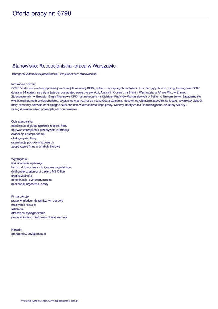 Oferta pracy nr: 6790 Stanowisko: Recepcjonistka -praca w Warszawie Kategoria: Administracja/sekretariat, Województwo: Mazowieckie Informacje o firmie: ORIX Polska jest częścią japońskiej korporacji finansowej ORIX, jednej z największych na świecie firm oferujących m.in. usługi leasingowe. ORIX działa w 24 krajach na całym świecie, posiadając swoje biura w Azji, Australii i Oceanii, na Bliskim Wschodzie, w Afryce Płn., w Stanach Zjednoczonych i w Europie. Grupa finansowa ORIX jest notowana na Giełdach Papierów Wartościowych w Tokio i w Nowym Jorku. Szczycimy się wysokim poziomem profesjonalizmu, wyjątkową elastycznością i szybkością działania. Naszym największym zasobem są ludzie. Wyjątkowy zespół, który tworzymy pozwala nam osiągać założone cele w atmosferze współpracy. Cenimy kreatywność i innowacyjność, szukamy wiedzy i zaangażowania wśród potencjalnych pracowników. Opis stanowiska: całościowa obsługa działania recepcji firmy sprawne zarządzanie przepływem informacji ewidencja korespondencji obsługa gości firmy organizacja podróży służbowych zaopatrzenie firmy w artykuły biurowe Wymagania: wykształcenia wyższego bardzo dobrej znajomości języka angielskiego doskonałej znajomości pakietu MS Office dyspozycyjności dokładności i systematyczności doskonałej organizacji pracy Firma oferuje: pracę w młodym, dynamicznym zespole możliwość rozwoju szkolenia atrakcyjne wynagrodzenie pracę w firmie o międzynarodowej renomie Kontakt: [email protected] wydruk z systemu: http://www.lepsza-praca.com.pl