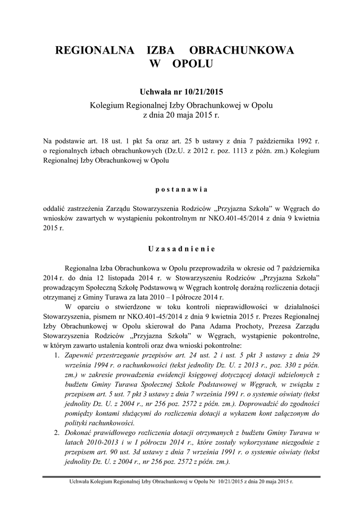 REGIONALNA IZBA OBRACHUNKOWA W OPOLU Uchwała nr 10/21/2015 Kolegium Regionalnej Izby Obrachunkowej w Opolu z dnia 20 maja 2015 r. Na podstawie art. 18 ust. 1 pkt 5a oraz art. 25 b ustawy z dnia 7 października 1992 r. o regionalnych izbach obrachunkowych (Dz.U. z 2012 r. poz. 1113 z późn. zm.) Kolegium Regionalnej Izby Obrachunkowej w Opolu postanawia oddalić zastrzeżenia Zarządu Stowarzyszenia Rodziców „Przyjazna Szkoła” w Węgrach do wniosków zawartych w wystąpieniu pokontrolnym nr NKO.401-45/2014 z dnia 9 kwietnia 2015 r. Uzasadnienie Regionalna Izba Obrachunkowa w Opolu przeprowadziła w okresie od 7 października 2014 r. do dnia 12 listopada 2014 r. w Stowarzyszeniu Rodziców „Przyjazna Szkoła” prowadzącym Społeczną Szkołę Podstawową w Węgrach kontrolę doraźną rozliczenia dotacji otrzymanej z Gminy Turawa za lata 2010 – I półrocze 2014 r. W oparciu o stwierdzone w toku kontroli nieprawidłowości w działalności Stowarzyszenia, pismem nr NKO.401-45/2014 z dnia 9 kwietnia 2015 r. Prezes Regionalnej Izby Obrachunkowej w Opolu skierował do Pana Adama Prochoty, Prezesa Zarządu Stowarzyszenia Rodziców „Przyjazna Szkoła” w Węgrach, wystąpienie pokontrolne, w którym zawarto ustalenia kontroli oraz dwa wnioski pokontrolne: 1. Zapewnić przestrzeganie przepisów art. 24 ust. 2 i ust. 5 pkt 3 ustawy z dnia 29 września 1994 r. o rachunkowości (tekst jednolity Dz. U. z 2013 r., poz. 330 z późn. zm.) w zakresie prowadzenia ewidencji księgowej dotyczącej dotacji udzielonych z budżetu Gminy Turawa Społecznej Szkole Podstawowej w Węgrach, w związku z przepisem art. 5 ust. 7 pkt 3 ustawy z dnia 7 września 1991 r. o systemie oświaty (tekst jednolity Dz. U. z 2004 r., nr 256 poz. 2572 z późn. zm.). Doprowadzić do zgodności pomiędzy kontami służącymi do rozliczenia dotacji a wykazem kont załączonym do polityki rachunkowości. 2. Dokonać prawidłowego rozliczenia dotacji otrzymanych z budżetu Gminy Turawa w latach 2010-2013 i w I półroczu 2014 r., które zostały wykorzystane niezgodnie z przepisem art. 90 ust. 3d ustawy z dnia 7 września 1991 r. o systemie oświaty (tekst jednolity Dz. U. z 2004 r., nr 256 poz. 2572 z późn. zm.). Uchwała Kolegium Regionalnej Izby Obrachunkowej w Opolu Nr 10/21/2015 z dnia 20 maja 2015 r. str. 2 W dniu 24 kwietnia 2015 r. do Regionalnej Izby Obrachunkowej w Opolu doręczono zastrzeżenia Zarządu Stowarzyszenia Rodziców „Przyjazna Szkoła” w Węgrach do wniosków zawartych w Wystąpieniu pokontrolnym Regionalnej Izby Obrachunkowej w Opolu nr NKO.401-45/2014 z dnia 9 kwietnia 2015 r. Wnoszący zastrzeżenia zarzucił Izbie: „naruszenie prawa przez błędną jego wykładnię lub niewłaściwe zastosowanie, w szczególności art. 90 ust. 3d w związku z art. 5 ust. 7 ustawy z dnia 1991 r. o systemie oświaty (tj. Dz.U. z 2004 r. nr 256 poz. 2572 ze zm.), zwanej dalej u.s.o.” Analizując złożone przez Zarząd Stowarzyszenia zastrzeżenia pod kątem sformułowania zastrzeżeń do wniosków zawartych w wystąpieniu pokontrolnym Kolegium uznało, iż dotyczą wniosku pokontrolnego zawartego w pkt. 2 wystąpienia pokontrolnego. Zdaniem Zarządu „wniosek ten oparty jest na niewłaściwie ustalonym stanie faktycznym, zastosowano wykładnię prawa materialnego w sposób dowolny i wadliwy, w szczególności art. 90 ust. 3d w związku z art. 5 ust. 7 u.s.o. oraz zastosowano nieaktualne treści norm prawnych.” Kolegium już na wstępie wskazuje, iż złożone zastrzeżenia, poza wskazaniem na błędne zastosowanie art. 90 ust. 3d u.s.o. nie odnoszą się do treści wniosków sformułowanych w wystąpieniu pokontrolnym, lecz stanowią polemikę z ustaleniami kontroli zawartymi w protokole kontroli, która nie jest i nie może być przedmiotem rozstrzygnięcia kolegium ze względu na treść art. 9 ust. 3 ustawy o regionalnych izbach obrachunkowych. Kolegium zważyło, co następuje: Zgodnie z art. 25b ustawy o regionalnych izbach obrachunkowych, zastrzeżenia do wniosków zawartych w wystąpieniach pokontrolnych rozpatrują kolegia izb. Zastrzeżenia składa właściwy organ jednostki kontrolowanej. Podstawą zgłoszenia zastrzeżenia może być tylko, stosownie do brzmienia art. 9 ust. 4 powołanej wyżej ustawy, zarzut naruszenia prawa poprzez błędną jego wykładnię lub niewłaściwe zastosowanie. Przypadek niewłaściwego zastosowania normy prawnej polegać może na wadliwym wyborze normy prawnej lub nieprawidłowej jej subsumpcji, tj. błędnym identyfikowaniem ustalonego stanu faktycznego z określonym przepisem prawnym i tym samym nieadekwatnym określeniem skutków prawnych wynikających z tego przepisu. Przedmiotem złożonych zastrzeżeń jest zdaniem Zarządu Stowarzyszenia dowolna i wadliwa interpretacja przepisów art. 90 ust. 3d w związku z art. 5 ust. 7 ustawy z dnia 7 września 1991 r. o systemie oświaty dokonana przez kontrolujących z uwagi na ich zmiany jakie następowały w okresie objętym kontrolą, a także niewłaściwie ustalony stan faktyczny przedmiotu kontroli. Odnosząc się bezpośrednio do powyższego zarzutu, stwierdzić należy, że zgodnie z art. 90 ust. 3d u.s.o. w brzmieniu obowiązującym do dnia 31.12.2013 r. dotacje mogły być przeznaczone na dofinansowanie realizacji zadań szkoły lub placówki w zakresie kształcenia, wychowania i opieki, w tym profilaktyki społecznej. Dotacje mogły być wykorzystane wyłącznie na pokrycie wydatków bieżących szkoły lub placówki. Uchwała Kolegium Regionalnej Izby Obrachunkowej w Opolu Nr 10/21/2015 z dnia 20 maja 2015 r. str. 3 Zmiana przepisów, o których mowa powyżej nastąpiła z dniem 1.01.2014 r. i obowiązywała do dnia 30.03.2015 r. Zdaniem Kolegium zarzut zastosowania nieaktualnych treści norm prawnych uznać należy za niezasadny, bowiem ustalony podczas kontroli stan faktyczny jak i sformułowane na jego podstawie wnioski zawarte w wystąpieniu pokontrolnym uwzględniają zmiany art. 90 ust. 3d 