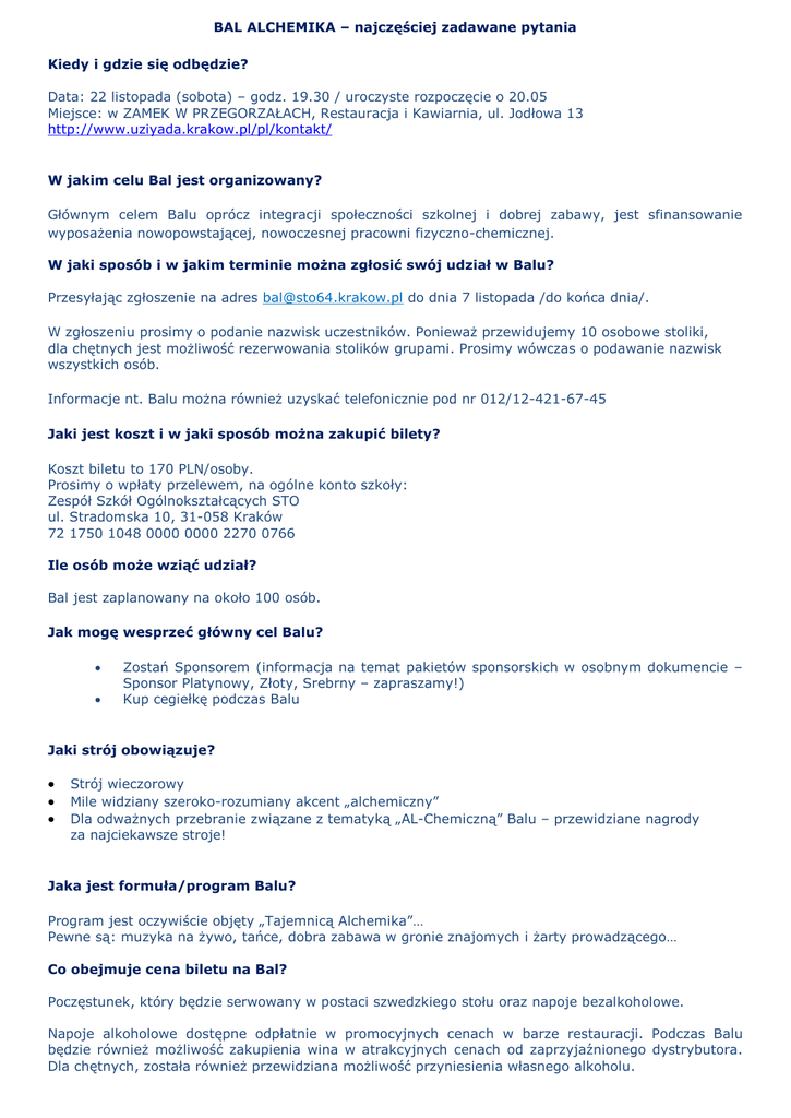 BAL ALCHEMIKA – najczęściej zadawane pytania Kiedy i gdzie się odbędzie? Data: 22 listopada (sobota) – godz. 19.30 / uroczyste rozpoczęcie o 20.05 Miejsce: w ZAMEK W PRZEGORZAŁACH, Restauracja i Kawiarnia, ul. Jodłowa 13 http://www.uziyada.krakow.pl/pl/kontakt/ W jakim celu Bal jest organizowany? Głównym celem Balu oprócz integracji społeczności szkolnej i dobrej zabawy, jest sfinansowanie wyposażenia nowopowstającej, nowoczesnej pracowni fizyczno-chemicznej. W jaki sposób i w jakim terminie można zgłosić swój udział w Balu? Przesyłając zgłoszenie na adres [email protected] do dnia 7 listopada /do końca dnia/. W zgłoszeniu prosimy o podanie nazwisk uczestników. Ponieważ przewidujemy 10 osobowe stoliki, dla chętnych jest możliwość rezerwowania stolików grupami. Prosimy wówczas o podawanie nazwisk wszystkich osób. Informacje nt. Balu można również uzyskać telefonicznie pod nr 012/12-421-67-45 Jaki jest koszt i w jaki sposób można zakupić bilety? Koszt biletu to 170 PLN/osoby. Prosimy o wpłaty przelewem, na ogólne konto szkoły: Zespół Szkół Ogólnokształcących STO ul. Stradomska 10, 31-058 Kraków 72 1750 1048 0000 0000 2270 0766 Ile osób może wziąć udział? Bal jest zaplanowany na około 100 osób. Jak mogę wesprzeć główny cel Balu? Zostań Sponsorem (informacja na temat pakietów sponsorskich w osobnym dokumencie – Sponsor Platynowy, Złoty, Srebrny – zapraszamy!) Kup cegiełkę podczas Balu Jaki strój obowiązuje? Strój wieczorowy Mile widziany szeroko-rozumiany akcent „alchemiczny” Dla odważnych przebranie związane z tematyką „AL-Chemiczną” Balu – przewidziane nagrody za najciekawsze stroje! Jaka jest formuła/program Balu? Program jest oczywiście objęty „Tajemnicą Alchemika”… Pewne są: muzyka na żywo, tańce, dobra zabawa w gronie znajomych i żarty prowadzącego… Co obejmuje cena biletu na Bal? Poczęstunek, który będzie serwowany w postaci szwedzkiego stołu oraz napoje bezalkoholowe. Napoje alkoholowe dostępne odpłatnie w promocyjnych cenach w barze restauracji. Podczas Balu będzie również możliwość zakupienia wina w atrakcyjnych cenach od zaprzyjaźnionego dystrybutora. Dla chętnych, została również przewidziana możliwość przyniesienia własnego alkoholu.