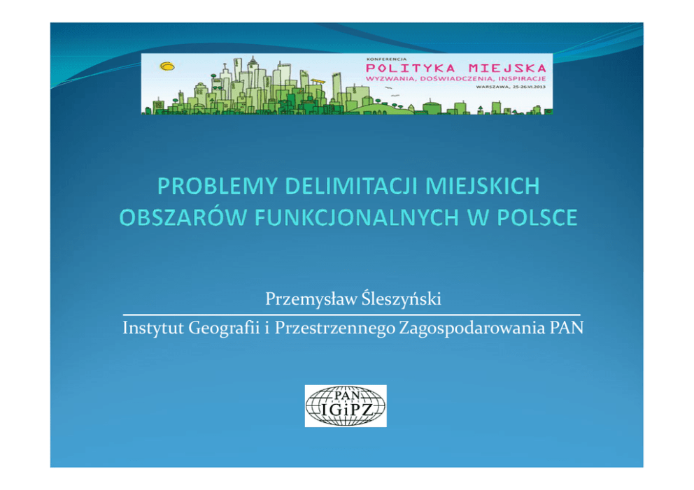 Przemysław Śleszyński Instytut Geografii i Przestrzennego Zagospodarowania PAN 1. Zagadnienia koncepcyjno-teoretyczne i terminologiczne. 2. Szczegóły metodyczne i przykłady historyczne delimitacji (1964-2008). 3. Delimitacja Miejskich Obszarów Funkcjonalnych wykonana dla MRR (2012). Polityka miejska – wyzwania, doświadczenia, inspiracje • Warszawa • 25-26 czerwca 2013 r. Slajd 2 z 20 1. Wykorzystywane delimitacje, klasyfikacje i typologie regionów nie służą dobrze objaśnianiu struktur przestrzennych, a pośrednio prawidłowości i związków przyczynowoskutkowych. 2. Stosowane podziały terytorialne w pewnych przypadkach są niewydolne w zintegrowanym planowaniu przestrzennym i regionalnym. Polityka miejska – wyzwania, doświadczenia, inspiracje • Warszawa • 25-26 czerwca 2013 r. Slajd 3 z 20 1. Region węzłowy (realny) versus region powierzchniowy (pozorny) DOJAZDY DO PRACY STRUKTURA DEMOGRAFICZNA Źródło: P. Śleszyński/KPZK 2011 Źródło: T. Komornicki 2008 2. Klasyfikacja i delimitacja poprzez łączenie lub podział. 3. Ryzyko błędnej lub nieefektywnej delimitacji i klasyfikacji. Polityka miejska – wyzwania, doświadczenia, inspiracje • Warszawa • 25-26 czerwca 2013 r. Slajd 4 z 20 gęstość zaludnienia zmiany liczby mieszkańców stosunki mieszkaniowe (wielkość izb) zatrudnienie poza rolnictwem dojazdy do pracy migracje stałe przedsięborczość struktura podmiotów gospodarczych czas dojazdu ciążenia grawitacyjne rok 1960 1970 1980 1990 Polityka miejska – wyzwania, doświadczenia, inspiracje • Warszawa • 25-26 czerwca 2013 r. 2000 2010 Slajd 5 z 20 AGLOMERACJE LUDNOŚCI Dziewoński i Kosiński 1964 AGLOM. MIEJSKO-PRZEMYSŁOWE Leszczycki, Heřman i Eberhardt 1971 OBSZARY METROPOLITALNE GUS 1968/Gontarski 1972 OBSZARY METROPOLITALNE Gontarski 1980 AGLOMERACJE WIELKOMIEJSKIE Iwanicka-Lyra 1969 FUNKCJONALNE REGIONY MIEJSKIE Potrykowska 1989 Polityka miejska – wyzwania, doświadczenia, inspiracje • Warszawa • 25-26 czerwca 2013 r. Slajd 6 z 20 OBSZARY METROPOLITALNE Unia Metropolii Polskich ≈2003 FUNKCJONALNE OBSZARY MIEJSKIE Korcelli i Śleszyński 2006 OBSZARY METROPOLITALNE Smętkowski 2007 OBSZARY METROPOLITALNE Smętkowski, Jałowiecki, Gorzelak 2009 OBSZARY METROPOLITALNE Swianiewicz i Klimska 2005 FUNKCJONALNE OBSZARY MIEJSKIE Komornicki i Śleszyński 2009 Polityka miejska – wyzwania, doświadczenia, inspiracje • Warszawa • 25-26 czerwca 2013 r. Slajd 7 z 20 3062 x 3062 gmin umownych Źródło: Kruszka 2010 Źródło: Śleszyński 2012 Możliwość dowolnej agregacji tych zbiorów przełamuje analityczny impas w badaniach zasiegów oddziaływań miast Polityka miejska – wyzwania, doświadczenia, inspiracje • Warszawa • 25-26 czerwca 2013 r. Slajd 8 z 20 Hierarchia rdzeni: A – stołeczny B – regionalny C – subregionalny D – lokalny E – wiejski Natężenie oddziaływania: 1 – silne przyjazdy z i wyjazdy do ośrodka miejskiego 2 – silne wyjazdy do ośrodka miejskiego Źródło: Śleszyński i in. 2011 Polityka miejska – wyzwania, doświadczenia, inspiracje • Warszawa • 25-26 czerwca 2013 r. Slajd 9 z 20 Śleszyński P., 2013, Delimitacja Miejskich Obszarów Funkcjonalnych stolic województw, Przegląd Geograficzny, 85, 2, s. 173-197. Polityka miejska – wyzwania, doświadczenia, inspiracje • Warszawa • 25-26 czerwca 2013 r. Slajd 10 z 20 1. Nieporównywalność delimitacji. 2. Różnorodność podejść koncepcyjnych i metodycznych. 3. Potrzeba znalezienia uniwersalnego , prostego i zrozumiałego rozwiązania. Polityka miejska – wyzwania, doświadczenia, inspiracje • Warszawa • 25-26 czerwca 2013 r. Slajd 11 z 20 PROBLEM SPOSOBY ROZWIĄZANIA EFEKT Dobór optymalnej liczby i rodzajów wskaźników Testowanie kilkudziesięciu wskaźników Wybór 7 ostatecznych wskaźników Przyjęcie bazy referencyjnej dla poszczególnych wskaźników Polska, średnia wojewódzka, rdzeń, itd.) Testowanie różnych poziomów wskaźników Wniosek, że nie jest możliwe dokonanie zadowalającej delimitacji w oparciu o średnie dla Polski Ustalenie poziomów wartości progowych Kilkadziesiąt delimitacji wariantowych (testowanie kombinacji różnych wartości wskaźników) Przyjęcie najbardziej zadowalającego wariantu, cechującego się najlepszymi cechami topologicznymi wyróżnionej strefy zewnętrznej Dostępność danych źródłowych Oparcie się na źródłach statystycznych istniejących dla całego kraju Dane dość wiarygodne, ale nie zawsze aktualne (w delimitacji nie jest to konieczne) Polityka miejska – wyzwania, doświadczenia, inspiracje • Warszawa • 25-26 czerwca 2013 r. Slajd 12 z 20 KRYTERIA FUNKCJONALNE WSKAŹNIK F1 liczba wyjeżdżających do pracy najemnej do rdzenia MOF na 1000 mieszkańców w wieku produkcyjnym, 2006 WSKAŹNIK F2 liczba zameldowań z rdzenia MOF na 1000 mieszkańców, 2009 Polityka miejska – wyzwania, doświadczenia, inspiracje • Warszawa • 25-26 czerwca 2013 r. Slajd 13 z 20 KRYTERIA SPOŁECZNOSPOŁECZNO-GOSPODARCZE WSKAŹNIK S1w udział pracujących w zawodach pozarolniczych, 2002 WSKAŹNIK S2w liczba podmiotów gospodarczych na 1000 mieszkańców, 2011 WSKAŹNIK S3r udział podmiotów gospodarczych w usługach wyższego rzędu (sekcje J-R), 2011 1. dla całego kraju 1. dla całego kraju 1. dla całego kraju 2. jako stosunek do analogicznego wskaźnika obliczonego dla całego województwa (czyli stosunek do średniej wojewódzkiej) 2. jako stosunek do analogicznego wskaźnika obliczonego dla całego województwa (czyli stosunek do średniej wojewódzkiej) 2. jako stosunek do analogicznego wskaźnika obliczonego dla całego województwa (czyli stosunek do średniej wojewódzkiej) 3. jako stosunek do analogicznego wskaźnika obliczonego dla rdzenia MOF 3. jako stosunek do analogicznego wskaźnika obliczonego dla rdzenia MOF Polityka miejska – wyzwania, doświadczenia, inspiracje • Warszawa • 25-26 czerwca 2013 r. Slajd 14 z 20 KRYTERIA MORFOLOGI