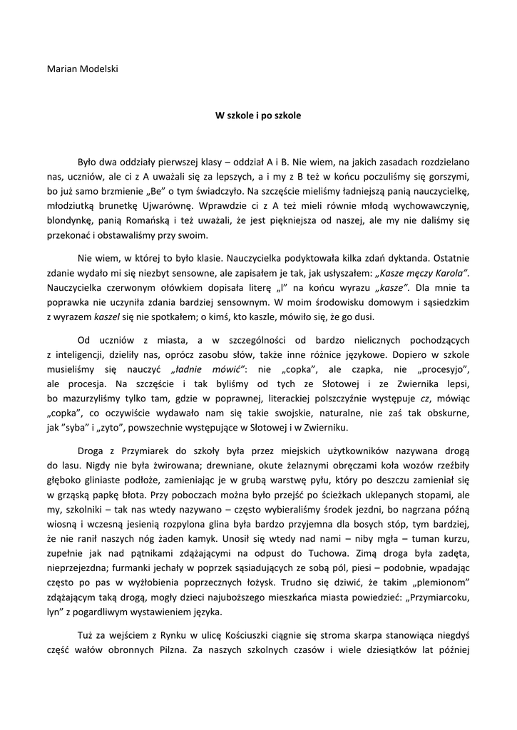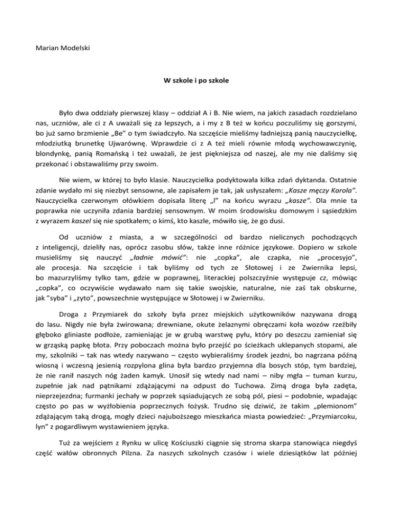 Marian Modelski W szkole i po szkole Było dwa oddziały pierwszej klasy – oddział A i B. Nie wiem, na jakich zasadach rozdzielano nas, uczniów, ale ci z A uważali się za lepszych, a i my z B też w końcu poczuliśmy się gorszymi, bo już samo brzmienie „Be” o tym świadczyło. Na szczęście mieliśmy ładniejszą panią nauczycielkę, młodziutką brunetkę Ujwarównę. Wprawdzie ci z A też mieli równie młodą wychowawczynię, blondynkę, panią Romańską i też uważali, że jest piękniejsza od naszej, ale my nie daliśmy się przekonać i obstawaliśmy przy swoim. Nie wiem, w której to było klasie. Nauczycielka podyktowała kilka zdań dyktanda. Ostatnie zdanie wydało mi się niezbyt sensowne, ale zapisałem je tak, jak usłyszałem: „Kasze męczy Karola”. Nauczycielka czerwonym ołówkiem dopisała literę „l” na końcu wyrazu „kasze”. Dla mnie ta poprawka nie uczyniła zdania bardziej sensownym. W moim środowisku domowym i sąsiedzkim z wyrazem kaszel się nie spotkałem; o kimś, kto kaszle, mówiło się, że go dusi. Od uczniów z miasta, a w szczególności od bardzo nielicznych pochodzących z inteligencji, dzieliły nas, oprócz zasobu słów, także inne różnice językowe. Dopiero w szkole musieliśmy się nauczyć „ładnie mówić”: nie „copka”, ale czapka, nie „procesyjo”, ale procesja. Na szczęście i tak byliśmy od tych ze Słotowej i ze Zwiernika lepsi, bo mazurzyliśmy tylko tam, gdzie w poprawnej, literackiej polszczyźnie występuje cz, mówiąc „copka”, co oczywiście wydawało nam się takie swojskie, naturalne, nie zaś tak obskurne, jak ”syba” i „zyto”, powszechnie występujące w Słotowej i w Zwierniku. Droga z Przymiarek do szkoły była przez miejskich użytkowników nazywana drogą do lasu. Nigdy nie była żwirowana; drewniane, okute żelaznymi obręczami koła wozów rzeźbiły głęboko gliniaste podłoże, zamieniając je w grubą warstwę pyłu, który po deszczu zamieniał się w grząską papkę błota. Przy poboczach można było przejść po ścieżkach uklepanych stopami, ale my, szkolniki – tak nas wtedy nazywano – często wybieraliśmy środek jezdni, bo nagrzana późną wiosną i wczesną jesienią rozpylona glina była bardzo przyjemna dla bosych stóp, tym bardziej, że nie ranił naszych nóg żaden kamyk. Unosił się wtedy nad nami – niby mgła – tuman kurzu, zupełnie jak nad pątnikami zdążającymi na odpust do Tuchowa. Zimą droga była zadęta, nieprzejezdna; furmanki jechały w poprzek sąsiadujących ze sobą pól, piesi – podobnie, wpadając często po pas w wyżłobienia poprzecznych łożysk. Trudno się dziwić, że takim „plemionom” zdążającym taką drogą, mogły dzieci najuboższego mieszkańca miasta powiedzieć: „Przymiarcoku, lyn” z pogardliwym wystawieniem języka. Tuż za wejściem z Rynku w ulicę Kościuszki ciągnie się stroma skarpa stanowiąca niegdyś część wałów obronnych Pilzna. Za naszych szkolnych czasów i wiele dziesiątków lat później znajdowało się tu podręczne i wygodne wysypisko śmieci. Dla nas, wracających tędy ze szkoły do domu, był to atrakcyjny teren buszowania. Można było tu znaleźć błyszczące puszki po konserwach rybnych, dziurawe miski, miednice, a nawet – po 1939 roku – naboje. Schodziliśmy ze śmietniska obłowieni w skarby mające zastosowanie w zabawach w czasie kilkukilometrowej drogi powrotnej, a i później stawały się przedmiotami wymiany w kręgach koleżeńskich. Latem chodziliśmy do szkoły boso i nawet uważaliśmy to za naszą zaletę, bo okazywało się, że obuci miejscy uczniowie przegrywali w biegach z tymi bosymi. Boso szli do miasta również dorośli, szczególnie kobiety. Niosły w rękach buty, dopiero przed murami miasta myły nogi w strumyku i zakładały buty, by godnie wkroczyć na targ i do kościoła. We wrześniu 1939 roku nasi żołnierze zaskoczeni szybkim następowaniem wojsk niemieckich, by nie popaść w niewolę, przebierali się w cywilne ubrania, pozostawiając różne elementy swego wojskowego wyposażenia. Jednym z takich elementów były solidne żołnierskie buty z nabitymi gwoźdźmi zelówkami. Jeden z przebierających się u nas żołnierzy, wątły, nieduży, miał i buty stosowne do swojego wzrostu. Nadały się – z pewnym nadmiarem – na moją uczniowską stopę. Chodziłem w nich do szkoły. Razem ze mną do tej samej klasy chodził Dolek K., miejski chłopak, niezbyt przykładający się do nauki, za to skory do figli i dokuczania mniej ruchliwym kolegom. Ja właśnie do takich należałem, bowiem dzieci wiejskie były przedwcześnie zaprzęgane do pracy, często ponad ich siły. (Pewnego razu ojciec polecił mi przynieść z lochu koszyk ziemniaków, a gdy oponowałem, mówiąc, że nie potrafię z głębokiego lochu wyciągnąć ciężkiego koszyka, odpowiedział: „Przecież możesz wynosić nawet po jednym ziemniaku”). Przychodziliśmy do szkoły już często solidnie zmęczeni gospodarskimi pracami i pragnęliśmy odpocząć, a nie figlować. Gdy Dolek zbytnio mi dokuczył, zdenerwowany, „poczęstowałem” go kopniakiem. Żołnierskie buty zostawiły wyraźne ślady gwoździ na udzie Dolka… . Dziwnym trafem już po wojnie miał miejsce inny incydent z Dolkiem. W gimnazjum na klasówce z łaciny ks. Podolecki, niezmiernie poczciwy człowiek, zbiera po dzwonku zeszyty. Ja dokonuję jeszcze ostatecznych zabiegów na wypracowaniu, a Dolek robi mi jakiegoś psikusa, więc zamaszyście mu się rewanżuję. Dolek się uchyla… , a mój cios trafia w stertę zeszytów niesionych przez księdza. Konsternacja! Dobroduszny ksiądz jednak ani słowem mnie nie skarcił. Przed wojną w naszej klasie było pięciu Żydów. Czterech z nich zajmowało jedną ławkę, piąty, Deresiewicz, był moim sąsiadem w następnej ławce. Nie przypominam sobie, by w naszej klasie powstawały jakieś konflikty na tle różnic religijnych czy rasowych