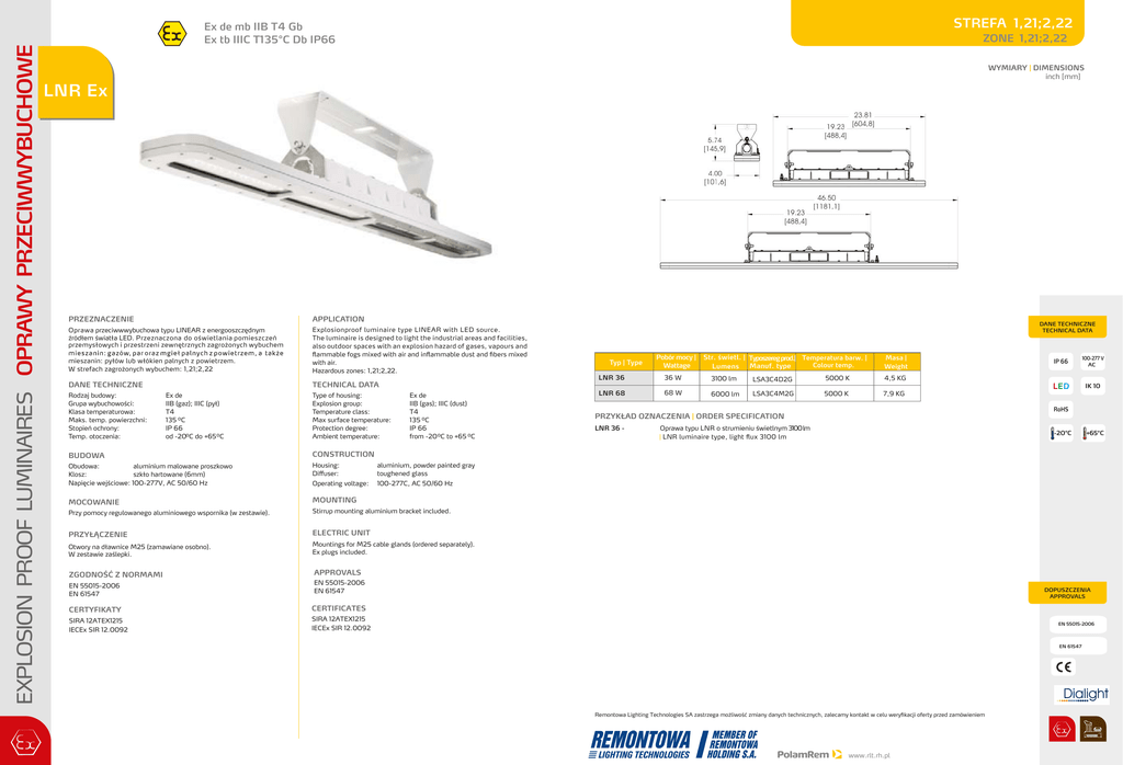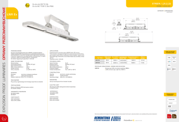 EXPLOSION PROOF LUMINAIRES OPRAWY PRZECIWWYBUCHOWE STREFA 1,21;2,22 Ex de mb IIB T4 Gb Ex tb IIIC T135°C Db IP66 ZONE 1,21;2,22 WYMIARY | DIMENSIONS inch [mm] LNR Ex PRZEZNACZENIE APPLICATION Oprawa przeciwwwybuchowa typu LINEAR z energooszczędnym źródłem światła LED. Przeznaczona do oświetlania pomieszczeń przemysłowych i przestrzeni zewnętrznych zagrożonych wybuchem mieszanin: pyłów lub włókien palnych z powietrzem. W strefach zagrożonych wybuchem: 1,21;2,22 Explosionproof luminaire type LINEAR with LED source. The luminaire is designed to light the industrial areas and facilities, also outdoor spaces with an explosion hazard of gases, vapours and flammable fogs mixed with air and inflammable dust and fibers mixed with air. Hazardous zones: 1,21;2,22. DANE TECHNICZNE TECHNICAL DATA Rodzaj budowy: Grupa wybuchowości: Klasa temperaturowa: Maks. temp. powierzchni: Stopień ochrony: Temp. otoczenia: Ex de IIB (gaz); IIIC (pył) T4 135 ⁰C IP 66 od -20⁰C do +65⁰C Type of housing: Explosion group: Temperature class: Max surface temperature: Protection degree: Ambient temperature: Ex de IIB (gas); IIIC (dust) T4 135 ⁰C IP 66 from -20⁰C to +65 ⁰C BUDOWA CONSTRUCTION Obudowa: aluminium malowane proszkowo Klosz: szkło hartowane (6mm) Napięcie wejściowe: 100-277V, AC 50/60 Hz Housing: Diffuser: aluminium, powder painted gray toughened glass Operating voltage: 100-277C, AC 50/60 Hz MOCOWANIE MOUNTING Przy pomocy regulowanego aluminiowego wspornika (w zestawie). Stirrup mounting aluminium bracket included. PRZYŁĄCZENIE ELECTRIC UNIT Otwory na dławnice M25 (zamawiane osobno). W zestawie zaślepki. Mountings for M25 cable glands (ordered separately). Ex plugs included. ZGODNOŚĆ Z NORMAMI APPROVALS EN 55015-2006 EN 61547 EN 55015-2006 EN 61547 CERTYFIKATY CERTIFICATES SIRA 12ATEX1215 IECEx SIR 12.0092 SIRA 12ATEX1215 IECEx SIR 12.0092 DANE TECHNICZNE TECHNICAL DATA Typ | Type Pobór mocy | Wattage Str. świetl. | Typoszereg prod.| Temperatura barw. | Colour temp. Manuf. type Lumens Masa | Weight LNR 36 36 W 3100 lm LSA3C4D2G 5000 K 4,5 KG LNR 68 68 W 6000 lm LSA3C4M2G 5000 K 7,9 KG 100-277 V AC IK 10 RoHS PRZYKŁAD OZNACZENIA | ORDER SPECIFICATION LNR 36 - IP 66 Oprawa typu LNR o strumieniu świetlnym 3100 lm | LNR luminaire type, light flux 3100 lm -20°C +65°C DOPUSZCZENIA APPROVALS EN 55015-2006 EN 61547 Remontowa Lighting Technologies SA zastrzega możliwość zmiany danych technicznych, zalecamy kontakt w celu weryfikacji oferty przed zamówieniem www.rlt.rh.pl