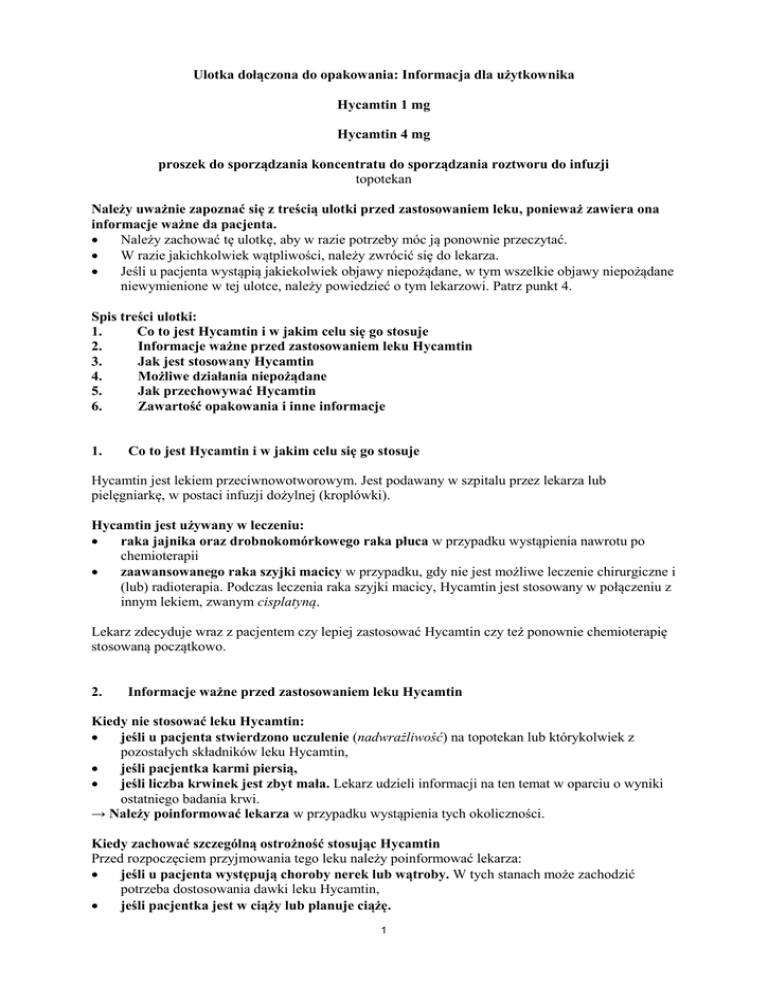 Ulotka dołączona do opakowania: Informacja dla użytkownika Hycamtin 1 mg Hycamtin 4 mg proszek do sporządzania koncentratu do sporządzania roztworu do infuzji topotekan Należy uważnie zapoznać się z treścią ulotki przed zastosowaniem leku, ponieważ zawiera ona informacje ważne da pacjenta. Należy zachować tę ulotkę, aby w razie potrzeby móc ją ponownie przeczytać. W razie jakichkolwiek wątpliwości, należy zwrócić się do lekarza. Jeśli u pacjenta wystąpią jakiekolwiek objawy niepożądane, w tym wszelkie objawy niepożądane niewymienione w tej ulotce, należy powiedzieć o tym lekarzowi. Patrz punkt 4. Spis treści ulotki: 1. Co to jest Hycamtin i w jakim celu się go stosuje 2. Informacje ważne przed zastosowaniem leku Hycamtin 3. Jak jest stosowany Hycamtin 4. Możliwe działania niepożądane 5. Jak przechowywać Hycamtin 6. Zawartość opakowania i inne informacje 1. Co to jest Hycamtin i w jakim celu się go stosuje Hycamtin jest lekiem przeciwnowotworowym. Jest podawany w szpitalu przez lekarza lub pielęgniarkę, w postaci infuzji dożylnej (kroplówki). Hycamtin jest używany w leczeniu: raka jajnika oraz drobnokomórkowego raka płuca w przypadku wystąpienia nawrotu po chemioterapii zaawansowanego raka szyjki macicy w przypadku, gdy nie jest możliwe leczenie chirurgiczne i (lub) radioterapia. Podczas leczenia raka szyjki macicy, Hycamtin jest stosowany w połączeniu z innym lekiem, zwanym cisplatyną. Lekarz zdecyduje wraz z pacjentem czy lepiej zastosować Hycamtin czy też ponownie chemioterapię stosowaną początkowo. 2. Informacje ważne przed zastosowaniem leku Hycamtin Kiedy nie stosować leku Hycamtin: jeśli u pacjenta stwierdzono uczulenie (nadwrażliwość) na topotekan lub którykolwiek z pozostałych składników leku Hycamtin, jeśli pacjentka karmi piersią, jeśli liczba krwinek jest zbyt mała. Lekarz udzieli informacji na ten temat w oparciu o wyniki ostatniego badania krwi. → Należy poinformować lekarza w przypadku wystąpienia tych okoliczności. Kiedy zachować szczególną ostrożność stosując Hycamtin Przed rozpoczęciem przyjmowania tego leku należy poinformować lekarza: jeśli u pacjenta występują choroby nerek lub wątroby. W tych stanach może zachodzić potrzeba dostosowania dawki leku Hycamtin, jeśli pacjentka jest w ciąży lub planuje ciążę. 1 jeśli pacjent planuje zostać ojcem dziecka Hycamtin może uszkodzić dziecko w przypadku poczęcia przed, w trakcie lub wkrótce po zakończeniu leczenia. Należy stosować skuteczną metodę zapobiegania ciąży. Należy zasięgnąć porady lekarza. → Należy poinformować lekarza w przypadku wystąpienia tych okoliczności. Hycamtin a inne leki: Należy poinformować lekarza o wszystkich przyjmowanych aktualnie lub ostatnio lekach, również o preparatach ziołowych lub lekach, które wydawane są bez recepty. Należy poinformować lekarza w przypadku rozpoczęcia stosowania innych leków podczas stosowania leku Hycamtin. Stosowanie leku Hycamtin z jedzeniem i piciem Nie jest znane oddziaływanie leku Hycamtin z alkoholem. Należy zasięgnąć opinii lekarza na temat możliwości picia alkoholu. Ciąża i karmienie piersią Hycamtin nie jest zalecany do stosowania u kobiet w ciąży. Może on uszkodzić dziecko w przypadku poczęcia przed, w trakcie lub wkrótce po zakończeniu leczenia. Należy stosować skuteczną metodę zapobiegania ciąży. Należy zasięgnąć porady lekarza. Nie należy próbować zajść w ciążę/zostać ojcem dziecka dopóki lekarz nie stwierdzi, że jest to bezpieczne. Jeśli mężczyzna planuje zostać ojcem dziecka, powinien zasięgnąć porady lekarza w zakresie planowania rodziny lub sposobu leczenia. Jeśli dojdzie do zajścia w ciążę należy natychmiast poinformować o tym lekarza. Nie wolno karmić piersią w czasie stosowania leku Hycamtin. Nie wolno ponownie rozpoczynać karmienia piersią, dopóki lekarz nie stwierdzi, że jest to bezpieczne. Prowadzenie pojazdów i obsługa maszyn Hycamtin może wywoływać zmęczenie. W przypadku wystąpienia zmęczenia lub osłabienia nie należy prowadzić pojazdów ani obsługiwać żadnych urządzeń mechanicznych. 3. Jak jest stosowany Hycamtin Dawka leku Hycamtin jest ustalana przez lekarza w zależności od: • wielkości ciała pacjenta (pola powierzchni mierzonego w metrach kwadratowych), • wyników badań krwi przeprowadzonych przed rozpoczęciem leczenia, • leczonej choroby. Zazwyczaj stosowana dawka • Podczas leczenia raka jajnika oraz drobnokomórkowego raka płuca: 1,5 mg na metr kwadratowy powierzchni ciała na dobę • Podczas leczenia raka szyjki macicy: 0,75 mg na metr kwadratowy powierzchni ciała na dobę. Podczas leczenia raka szyjki macicy, Hycamtin jest stosowany w połączeniu z innym lekiem, zwanym cisplatyną. Lekarz zaleci odpowiednią dawkę cisplatyny. Jak podawany jest Hycamtin Lekarz lub pielęgniarka podaje odpowiednią dawkę leku Hycamtin w postaci infuzji dożylnej (kroplówki). Kroplówka jest zazwyczaj podawana do żyły kończyny górnej w czasie około 30 minut. • Podczas leczenia raka jajnika oraz drobnokomórkowego raka płuca lek jest podawany raz na dobę, przez pięć dni. • Podczas leczenia raka szyjki macicy lek podawany jest raz na dobę, przez trzy dni. Postępowanie takie jest zwykle powtarzane co 3 tygodnie we wszystkich rodzajach raka. 2 Sposób leczenia może zostać zmieniony w zależności od wyników regularnie wykonywanych badań krwi. Przerywanie leczenia Lekarz zdecyduje kiedy należy przerwać leczenie. 4. Możliwe działania niepożądane Jak każdy lek, Hycamtin może powodować działania niepożądane, chociaż nie u każdego one wystąpią. Ciężkie działania niepożądane: należy powiadomić lekarza Poniższe bardzo częste działania niepożądane mogą wystąpić u więcej niż 1 na 10 pacjentów otrzymujących lek Hycamtin: Objawy zakażenia: Hycamtin może zmniejszać ilość białych krwinek i zm