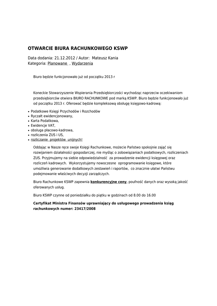 OTWARCIE BIURA RACHUNKOWEGO KSWP Data dodania: 21.12.2012 / Autor: Mateusz Kania Kategoria: Planowane , Wydarzenia Biuro będzie funkcjonowało już od początku 2013 r Koneckie Stowarzyszenie Wspierania Przedsiębiorczości wychodząc naprzeciw oczekiwaniom przedsiębiorców otwiera BIURO RACHUNKOWE pod marką KSWP. Biuro będzie funkcjonowało już od początku 2013 r. Oferować będzie kompleksową obsługę księgowo-kadrową: ● ● ● ● ● ● ● Podatkowe Księgi Przychodów i Rozchodów Ryczałt ewidencjonowany, Karta Podatkowa, Ewidencje VAT, obsługa płacowo-kadrowa, rozliczenia ZUS i US, rozliczanie projektów unijnych! Oddając w Nasze ręce swoje Księgi Rachunkowe, możecie Państwo spokojnie zająć się rozwijaniem działalności gospodarczej, nie myśląc o zobowiązaniach podatkowych, rozliczeniach ZUS. Przyjmujemy na siebie odpowiedzialność za prowadzenie ewidencji księgowej oraz rozliczeń kadrowych. Wykorzystujemy nowoczesne oprogramowanie księgowe, które umożliwia generowanie dodatkowych zestawień i raportów, co znacznie ułatwi Państwu podejmowanie właściwych decyzji zarządczych. Biuro Rachunkowe KSWP zapewnia konkurencyjne ceny, poufność danych oraz wysoką jakość oferowanych usług. Biuro KSWP czynne od poniedziałku do piątku w godzinach od 8.00 do 16.00 Certyfikat Ministra Finansów uprawniający do usługowego prowadzenia ksiąg rachunkowych numer: 23417/2008