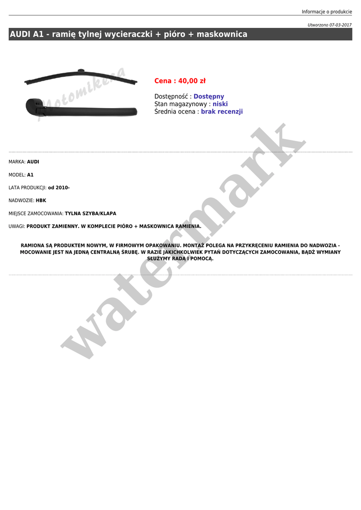Informacje o produkcie Utworzono 07-03-2017 AUDI A1 - ramię tylnej wycieraczki + pióro + maskownica Cena : 40,00 zł MARKA: AUDI MODEL: A1 LATA PRODUKCJI: od 2010NADWOZIE: HBK er m ar k Dostępność : Dostępny Stan magazynowy : niski Średnia ocena : brak recenzji MIEJSCE ZAMOCOWANIA: TYLNA SZYBA/KLAPA UWAGI: PRODUKT ZAMIENNY. W KOMPLECIE PIÓRO + MASKOWNICA RAMIENIA. w at RAMIONA SĄ PRODUKTEM NOWYM, W FIRMOWYM OPAKOWANIU. MONTAŻ POLEGA NA PRZYKRĘCENIU RAMIENIA DO NADWOZIA MOCOWANIE JEST NA JEDNĄ CENTRALNĄ ŚRUBĘ. W RAZIE JAKICHKOLWIEK PYTAŃ DOTYCZĄCYCH ZAMOCOWANIA, BĄDŻ WYMIANY SŁUŻYMY RADĄ I POMOCĄ.