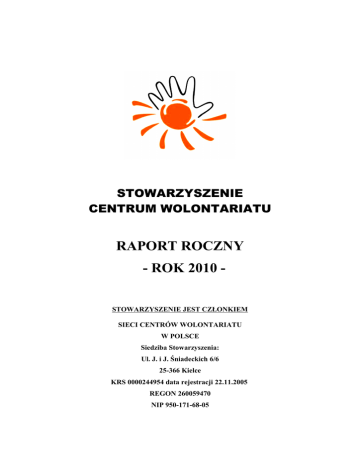 STOWARZYSZENIE CENTRUM WOLONTARIATU RAPORT ROCZNY - ROK 2010 STOWARZYSZENIE JEST CZŁONKIEM SIECI CENTRÓW WOLONTARIATU W POLSCE Siedziba Stowarzyszenia: Ul. J. i J. Śniadeckich 6/6 25-366 Kielce KRS 0000244954 data rejestracji 22.11.2005 REGON 260059470 NIP 950-171-68-05 O Stowarzyszeniu Historia Powstania Pomysł stworzenia miejsca, które skupiałoby wolontariuszy zrodził się w 1996 r. Idea działalności wolontarystycznej zainteresowała pracowników Świętokrzyskiego Centrum Fundacji Rozwoju Demokracji Lokalnej podczas wizyty studyjnej w Stanach Zjednoczonych. Dało to impuls do zweryfikowania potrzeb lokalnych organizacji pozarządowych w zakresie oczekiwanych wolontariuszy. Organizacje najczęściej potrzebowały wolontariuszy do prac w zakresie pomocy społecznej. W wyniku konsultacji z organizacjami społecznymi, władzami samorządowymi zostało powołane Centrum Wolontariatu jako jeden z programów ŚC FRDL. Pierwsze środki na działalność w 1997 r. otrzymaliśmy od Fundacji Królowej Juliany z Holandii. W tym czasie nawiązaliśmy kontakt z Centrum w Warszawie, od którego otrzymaliśmy merytoryczne informacje o tym jak wygląda struktura Centrum oraz na jakich warunkach funkcjonuje. Rozpoczęliśmy współpracę z Centrami Wolontariatu w Polsce. Początkowo działalność Centrum Wolontariatu wiązała się akcyjnością. Organizowaliśmy akcje ogólnopolskie o wymiarze lokalnym, min. uczestniczyliśmy w Orkiestrze Świątecznej Pomocy, w Akcji Nadzieja Polskiej Akcji Humanitarnej. Współorganizowaliśmy wiele akcji charytatywnych na rzecz organizacji pozarządowych: kwesty, koncerty muzyczne, festyny, Olimpiady Specjalne. Obecnie zgłoszeń jest tak dużo, że nie współorganizujemy ich ale z chęcią szukamy na nie wolontariuszy. W 2005 roku podjęliśmy decyzję o rejestracji samodzielnego stowarzyszenia. Przeszliśmy niełatwy proces rejestracyjny; dyżury w tym czasie pełniliśmy dzięki uprzejmości Stowarzyszenia Inicjatyw Społecznych Wariant w ich siedzibie. Wraz z rozwojem Centrum pojawiła się konieczność wynajęcia pomieszczeń biurowych. W dniu 18 listopada 2006 odbyło się walne zebranie Stowarzyszenia Centrum Wolontariatu. Dokonano na nim zmian w statucie, wyboru nowego wiceprezesa, nowego członka Komisji Rewizyjnej, oraz przyjęto pięciu nowych członków. Przez pięć lat działalności stowarzyszenie zrealizowało wiele projektów, między innymi pierwszy regionie projekt dotyczące ekonomii społecznej, programy wsparcia organizatorów wolontariatu czy też Inkubator Trzeciego Sektora W dniu 06.08.2010 weszły w życie postanowienia kolejnego walnego zebrania członków Stowarzyszenia Centrum Wolontariatu na którym przyjęto pięciu nowych członków, wybrano nowy zarząd oraz nowych członków Komisji Rewizyjnej. Po kilku przeprowadzkach ostatecznie Stowarzyszenie od grudnia 2010 roku ma siedzibę przy ul. Mała 4/3 położoną w samym centrum miasta niedaleko rynku i Urzędu Miasta. Nasza Misja Wspieramy i inicjujemy szeroko pojęte aktywności obywatelskie realizowane w oparciu o wolontariat oraz poprzez otwarcie na wymianę wiedzy, doświadczeń i wspólne działania na polu inicjatyw społecznych. 2 Cele Statutowe Działalność nieodpłatna 1.Zwiększanie wiedzy z zakresu wolontariatu i upowszechnianie idei pracy wolontarystycznej, 2.organizowanie i promocja wolontariatu 3.wspieranie szeroko pojętej aktywności obywatelskiej ze szczególnym uwzględnieniem działalności wolontarystycznej, 4.wspieranie organizacji pozarządowych oraz instytucji publicznych, inicjatyw społecznych i osób prywatnych zagrożonych wykluczeniem społecznym, w szczególności: niepełnosprawnych, bezrobotnych, bezdomnych, samotnych matek oraz dzieci i młodzieży w ich działalności na rzecz dobra publicznego, poprzez oferowanie im wsparcia wolontariuszy i pomocy świadczonej przez Stowarzyszenie, 5.promowanie i wspieranie inicjatyw społecznych na rzecz rozwoju dobroczynności i filantropii w Polsce i za granicą, 6.animowanie, organizowanie i promowanie współpracy organizacji pozarządowych z organami administracji rządowej i samorządowej oraz środowiskami biznesu w Kielcach i województwie świętokrzyskim oraz w Polsce i za granicą, 7.rozszerzanie wiedzy o wolontariacie i organizacjach pozarządowych w Polsce i za granicą, 8.wspieranie rozwoju organizacji pozarządowych w Kielcach, województwie świętokrzyskim i w Polsce, 9.podtrzymywanie tradycji narodowej, pielęgnowanie polskości oraz rozwój świadomości narodowej, obywatelskiej i kulturowej, 10.działania na rzecz ochrony środowiska naturalnego, 11.działalność wspomagająca technicznie, szkoleniowo, informacyjnie lub finansowo organizacje pozarządowe, instytucje publiczne oraz osoby indywidualne, 12.działania na rzecz osób pozostawionych na marginesie życia społecznego (osoby chore i niepełnosprawne, bezdomni, dzieci z rodzin rozbitych, dysfunkcyjnych, dzieci ulicy), dzieci krzywdzonych oraz młodzieży zagrożonej patologiami społecznymi) 13.działania profilaktyczne w zakresie zagrożeń społecznych (uzależnienia, przemoc, bezdomność, HIV, inne choroby przenoszone drogą płciową i inne) oraz promocja zdrowia. 14.promowanie idei tolerancji i praw człowieka oraz prowadzenie edukacji obywatelskiej. 15.działania na rzecz rozwoju społeczności lokalnych, wyrównywanie szans 16.stwarzanie młodym ludziom niepatologicznego, zdrowego środowiska rówieśniczego 17.wyżej wymienione cele będą realizowane w obszarach: edukacja, sport, kultura, sztuka, ochrona środowiska, dobroczynność, ochrona zdrowia, pomoc społeczna. Działalność odpłatna 1.Działalność wspomagająca technicznie, szkoleniowo, informacyjnie lub finansowo organizacje pozarządowe, instytucje publiczne oraz osoby indywidualne, 3 Skład Zarządu Michał Braun - prezes Emilia Michta - wiceprezes Jacek Gorzelak - wieceprezes Anna Korycińska- prezes do sierpnia 2010 Karol Krzyczkowski – wicepreze