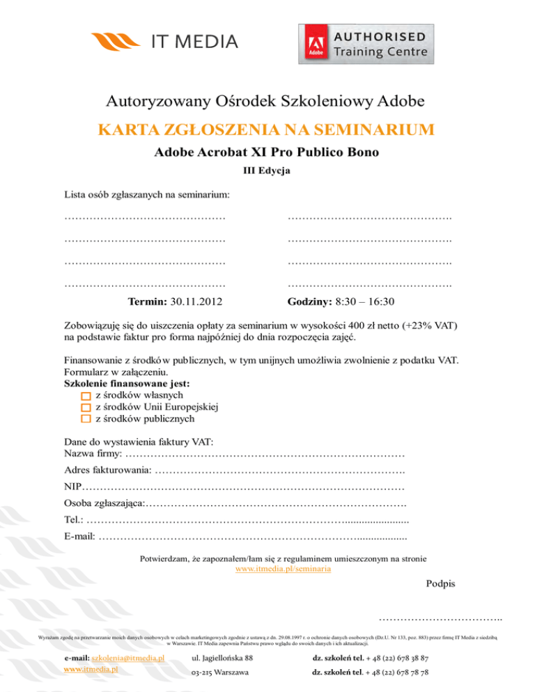 Autoryzowany Ośrodek Szkoleniowy Adobe KARTA ZGŁOSZENIA NA SEMINARIUM Adobe Acrobat XI Pro Publico Bono III Edycja Lista osób zgłaszanych na seminarium: ……………………………………… ………………………………………. ……………………………………… ………………………………………. ……………………………………… ………………………………………. ……………………………………… ………………………………………. Termin: 30.11.2012 Godziny: 8:30 – 16:30 Zobowiązuję się do uiszczenia opłaty za seminarium w wysokości 400 zł netto (+23% VAT) na podstawie faktur pro forma najpóźniej do dnia rozpoczęcia zajęć. Finansowanie z środków publicznych, w tym unijnych umożliwia zwolnienie z podatku VAT. Formularz w załączeniu. Szkolenie finansowane jest: z środków własnych z środków Unii Europejskiej z środków publicznych Dane do wystawienia faktury VAT: Nazwa firmy: …………………………………………………………………… Adres fakturowania: ……………………………………………………………. NIP……………………………………………………………………………… Osoba zgłaszająca:………………………………………………………………. Tel.: ………………………………………………………………....................... E-mail: ……………………………………………………………….................. Potwierdzam, że zapoznałem/łam się z regulaminem umieszczonym na stronie www.itmedia.pl/seminaria Podpis …………………………….. Wyrażam zgodę na przetwarzanie moich danych osobowych w celach marketingowych zgodnie z ustawą z dn. 29.08.1997 r. o ochronie danych osobowych (Dz.U. Nr 133, poz. 883) przez firmę IT Media z siedzibą w Warszawie. IT Media zapewnia Państwu prawo wglądu do swoich danych i ich aktualizacji. e-mail: [email protected] www.itmedia.pl ul. Jagiellońska 88 dz. szkoleń tel. + 48 (22) 678 38 87 03-215 Warszawa dz. szkoleń tel. + 48 (22) 678 78 78
