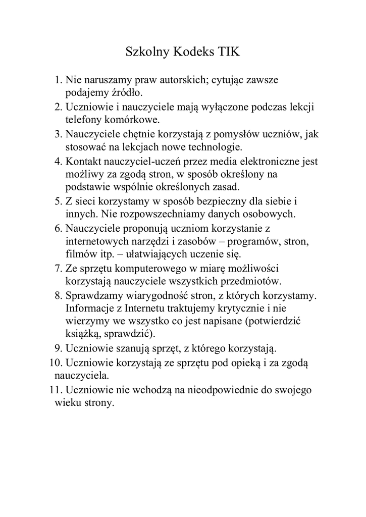 Szkolny Kodeks TIK 1. Nie naruszamy praw autorskich; cytując zawsze podajemy źródło. 2. Uczniowie i nauczyciele mają wyłączone podczas lekcji telefony komórkowe. 3. Nauczyciele chętnie korzystają z pomysłów uczniów, jak stosować na lekcjach nowe technologie. 4. Kontakt nauczyciel-uczeń przez media elektroniczne jest możliwy za zgodą stron, w sposób określony na podstawie wspólnie określonych zasad. 5. Z sieci korzystamy w sposób bezpieczny dla siebie i innych. Nie rozpowszechniamy danych osobowych. 6. Nauczyciele proponują uczniom korzystanie z internetowych narzędzi i zasobów – programów, stron, filmów itp. – ułatwiających uczenie się. 7. Ze sprzętu komputerowego w miarę możliwości korzystają nauczyciele wszystkich przedmiotów. 8. Sprawdzamy wiarygodność stron, z których korzystamy. Informacje z Internetu traktujemy krytycznie i nie wierzymy we wszystko co jest napisane (potwierdzić książką, sprawdzić). 9. Uczniowie szanują sprzęt, z którego korzystają. 10. Uczniowie korzystają ze sprzętu pod opieką i za zgodą nauczyciela. 11. Uczniowie nie wchodzą na nieodpowiednie do swojego wieku strony.