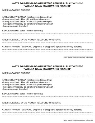 KARTA ZGŁOSZENIA DO OTWARTEGO KONKURSU PLASTYCZNEGO “WIELKA GALA MALOWANEJ PISANKI” IMIĘ I NAZWISKO AUTORA .................................................................................................................................................. KATEGORIA WIEKOWA (podkreślić odpowiednią): - kategoria dzieci z klas I-III szkół podstawowych - kategoria dzieci z klas IV-VI szkół podstawowych - kategoria młodzieży ze szkół ponadpodstawowych - kategoria osób dorosłych SZKOŁA (nazwa, adres i numer telefonu) .................................................................................................................................................. .................................................................................................................................................. IMIĘ I NAZWISKO ORAZ NUMER TELEFONU OPIEKUNA .................................................................................................................................................. ADRES I NUMER TELEFONU (wypełnić w przypadku zgłoszenia osoby dorosłej) ................................................................................................................................................... ................................................................................................................................................... ..................................................................... data i podpis osoby dokonującej zgłoszenia KARTA ZGŁOSZENIA DO OTWARTEGO KONKURSU PLASTYCZNEGO “WIELKA GALA MALOWANEJ PISANKI” IMIĘ I NAZWISKO AUTORA .................................................................................................................................................. KATEGORIA WIEKOWA (podkreślić odpowiednią): - kategoria dzieci z klas I-III szkół podstawowych - kategoria dzieci z klas IV-VI szkół podstawowych - kategoria młodzieży ze szkół ponadpodstawowych - kategoria osób dorosłych SZKOŁA (nazwa, adres i numer telefonu) .................................................................................................................................................. .................................................................................................................................................. IMIĘ I NAZWISKO ORAZ NUMER TELEFONU OPIEKUNA .................................................................................................................................................. ADRES I NUMER TELEFONU (wypełnić w przypadku zgłoszenia osoby dorosłej) ................................................................................................................................................... ................................................................................................................................................... ..................................................................... data i podpis osoby dokonującej zgłoszenia