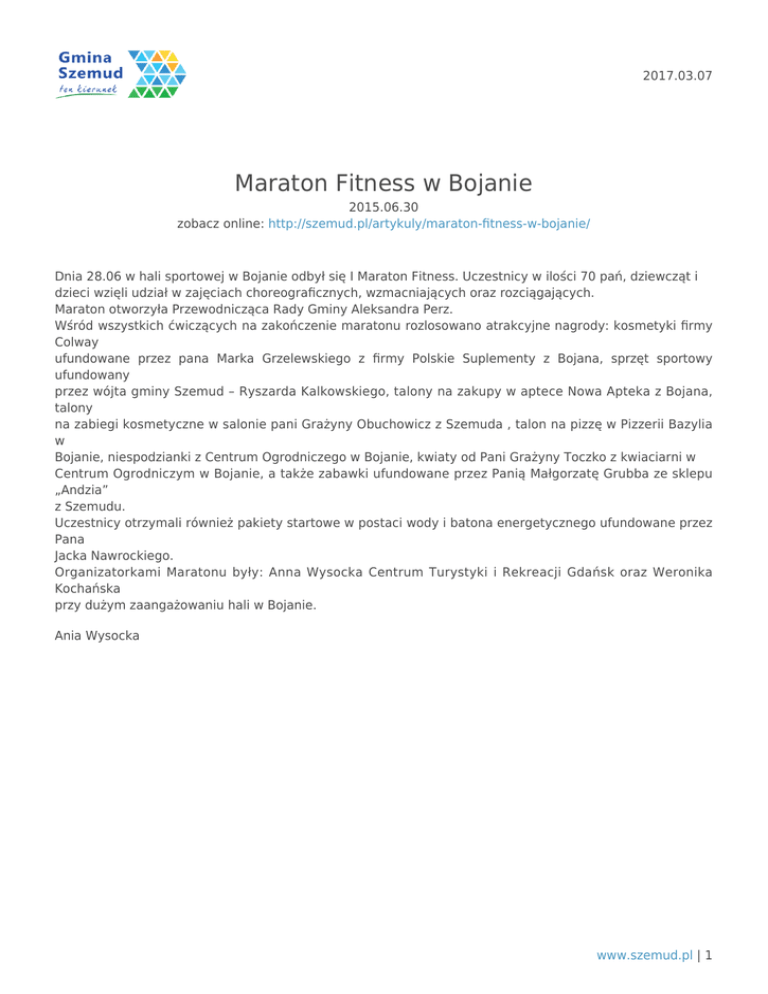 2017.03.07 Maraton Fitness w Bojanie 2015.06.30 zobacz online: http://szemud.pl/artykuly/maraton-fitness-w-bojanie/ Dnia 28.06 w hali sportowej w Bojanie odbył się I Maraton Fitness. Uczestnicy w ilości 70 pań, dziewcząt i dzieci wzięli udział w zajęciach choreograficznych, wzmacniających oraz rozciągających. Maraton otworzyła Przewodnicząca Rady Gminy Aleksandra Perz. Wśród wszystkich ćwiczących na zakończenie maratonu rozlosowano atrakcyjne nagrody: kosmetyki firmy Colway ufundowane przez pana Marka Grzelewskiego z firmy Polskie Suplementy z Bojana, sprzęt sportowy ufundowany przez wójta gminy Szemud – Ryszarda Kalkowskiego, talony na zakupy w aptece Nowa Apteka z Bojana, talony na zabiegi kosmetyczne w salonie pani Grażyny Obuchowicz z Szemuda , talon na pizzę w Pizzerii Bazylia w Bojanie, niespodzianki z Centrum Ogrodniczego w Bojanie, kwiaty od Pani Grażyny Toczko z kwiaciarni w Centrum Ogrodniczym w Bojanie, a także zabawki ufundowane przez Panią Małgorzatę Grubba ze sklepu „Andzia” z Szemudu. Uczestnicy otrzymali również pakiety startowe w postaci wody i batona energetycznego ufundowane przez Pana Jacka Nawrockiego. Organizatorkami Maratonu były: Anna Wysocka Centrum Turystyki i Rekreacji Gdańsk oraz Weronika Kochańska przy dużym zaangażowaniu hali w Bojanie. Ania Wysocka www.szemud.pl | 1