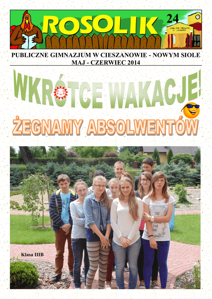 24 PUBLICZNE GIMNAZJUM W CIESZANOWIE - NOWYM SIOLE MAJ - CZERWIEC 2014 Klasa IIIB OD MAJA DO CZERWCA WITAJ, MAJOWA JUTRZENKO STR. 2 POWIATOWE DRUŻYNOWE MISTRZOSTWA W LIDZE LEKKOATLETYCZNEJ DZIEWCZĄT I CHŁOPCÓW W 223. rocznicę uchwalenia Konstytucji 3 maja w Cieszanowie odbyły się obchody upamiętniające to wydarzenie. Uczestniczyły w nich władze miasta i gminy Cieszanów, na czele z p. burmistrzem Zdzisławem Zadwornym, poczty sztandarowe, dzieci, młodzież oraz licznie przybyli mieszkańcy. Uroczystość rozpoczęła się w kościele parafialnym akademią przygotowaną przez uczniów Publicznego Gimnazjum w Cieszanowie pod kierunkiem p. Leokadii Zaborniak i p. Pawła Młodowca. Młodzi artyści przypomnieli najważniejsze wydarzenia, które doprowadziły do uchwalenia konstytucji, dramat rozbiorów, obalenie konstytucji oraz zwrócili uwagę na jej znaczenie dla nas, Polaków. Następnie została odprawiona Msza św. w intencji Ojczyzny. Po Eucharystii uczestnicy przeszli pod pomnik Tysiąclecia Państwa Polskiego, gdzie nastąpiło złożenie kwiatów. Po tej części wszyscy procesyjnie udali się na cmentarz, gdzie dokonano poświęcenia i wmurowania kamienia węgielnego pod budowę pomnika upamiętniającego mieszkańców Cieszanowa, którzy zginęli 70 lat temu, podczas spalenia 17.05.2014r. na obiektach lekkoatletycznych gimnazjum odbyły się powiatowe zawody drużynowe w lekkoatletyce. miasta. www.cieszanow.pl Oto kolejność uzyskanych miejsc i liczba punktów startują******************************************************* cych szkół DZIEWCZĘTA I miejsce - Gimnazjum Cieszanów - 1146 pkt. WARSZTATY POETYCKIE II miejsce - Gimnazjum Narol - 900 pkt. 7 maja kilkunastu uczniów naszej szkoły w ramach Tygodnia Biblio- III miejsce - Gimnazjum nr 2 Lubaczów - 786 pkt. tek uczestniczyło w warsztatach poetyckich dla gimnazjalistów. Od- IV miejsce- Gimnazjum Lisie Jamy- 694 pkt. były się one w Miejskiej Bibliotece Publicznej w Cieszanowie. Pro- V miejsce- Gimnazjum Łukawiec- 568 pkt. wadziła je pani Dorota Ryst - wielokrotna laureatka konkursów po- CHŁOPCY etyckich, autorka 4 tomików, wiceprezes Stowarzyszenia Salon Lite- I miejsce- Gimnazjum nr 1Lubaczów - 1280 pkt. II miejsce- Gimnazjum Narol- 1211 pkt. racki i redaktor naczelny portalu Salon Literacki. Warsztaty trwały ponad 3 godziny. Rozpoczęły się od opisywania III miejsce- Gimnazjum Lisie Jamy - 1142 pkt. puszki stojącej na krześle, a skończyły na napisaniu haiku. Ucznio- IV miejsce- Gimnazjum Łukawiec - 1078 pkt. wie wytrwale pracowali, a ich wysiłek przyniósł pozytywne skutki. V miejsce- Gimnazjum Cieszanów - 1027 pkt. Uczniowie gimnazjów rywalizowali w następujących konkurencjach: -bieg na 100m, -bieg na 300m, -bieg na 600m, -bieg na 1000m, -skok w dal, -pchnięcie kulą, -rzut oszczepem, -sztafeta 4x100m. Na sumę punktów zdobytych przez jedną drużynę składało się 12 najlepszych wyników dodanych do siebie, które były przeliczone według tabel punktowych. Najwartościowszy wynik wśród dziewcząt uzyskała Wiktoria Makuch w pchnięciu kulą. Pchnęła 10,11m, zdobywając tym samym 137 pkt. Następny etap zawodów lekkoatletycznych odbył się 27.05. 2014 r. w Rzeszowie. Uczennice naszego gimnazjum zajęły XI miejsce na 23 zespoły. Najlepszy wynik spośród naszych dziewcząt zanotowała także Wiktoria Makuch (10,44m), zajmując II miejsce w konkurencji, w której brało udział ok. 70 zawodniczek. Wszyscy nauczyli się, że nie trzeba być kimś ważnym, żeby pisać Gratulujemy dziewczętom dobrych wyników sportowych, a chłopcom życzymy lepszych osiągnięć. wiersze. Zajęcia bardzo podobały się uczestnikom. Karolina Weiss i Aleksandra Zapalska Karolina Skiba i Paulina Ważna STR. 3 DZIĘKI COMENIUSOWI PODRÓŻUJĄ PO EUROPIE W dniach 06.05 - 11.05. br. odbył się kolejny wyjazd w ramach projektu Magic Bricks For European Citizenship –Magiczne cegiełki dla obywatelstwa europejskiego 2013/2015. Uczennice: Paulina Witko, Agata Kołodziej, Katarzyna Mazurek, Magdalena Skiba i Aleksandra Skiba oraz nauczycielki: pani Anna Kołodziej i pani Maria Zubrzycka odbyły podróż do Bułgarii. Postanowiłyśmy przeprowadzić wywiad z Agatą Kołodziej i Pauliną Witko, aby dowiedzieć się czegoś więcej na temat ich wycieczki. Gabriela: Co spowodowało, że Wasza piątka miała pojechać do Bułgarii? Agata: To, że dobrze się uczyłyśmy i po prostu panie z angielskiego nas wybrały. Paulina: Stwierdziły, że jesteśmy chyba najbardziej komunikatywne. Ewelina: Jak minęła Wam podróż? Agata: Jechałyśmy busem około 23 godzin. Paulina: Na początku byłyśmy trochę zdenerwowane, ale później stwierdziłyśmy, że nie ma czym się denerwować. Chciałyśmy śpiewać, ale się wstydziłyśmy. Nasze głosy nie brzmiały najlepiej. (śmiech) Karolina: Jak były zaplanowane poszczególne dni? Paulina: Pierwszego dnia, po przyjeździe do hotelu poszłyśmy do dziewczyn, z którymi mieszkałyśmy. Bałyśmy się, ale zaczęłyśmy z nimi rozmawiać. Nawet ta, z którą mieszkałam, pożyczyła mi suszarkę. Miała taką fajną. (śmiech) Agata: A ja mieszkałam u gwiazdy Sandanskiego – najbardziej znanej dziewczyny w tym mieście. Paulina: Ogólnie to pierwszy dzień polegał na prezentacjach. Agata: Poszłyśmy do szkoły i tam uczniowie ze wszystkich państw przedstawiali swoje prezentacje na temat przemocy w szkole. My również, chociaż miałyśmy małe problemy techniczne. Mimo tego poszło nam bardzo dobrze. Paulina: Następnie razem z innymi zwiedzałyśmy 2 miasta: Melnik i Błagojewgrad. W Melniku byliśmy w muzeum wina. Aleksandra: A co robiliście drugiego dnia? Agata: Cały dzień zwiedzaliśmy stolicę regionu, w którym byliśmy. Aleksandra: A trzeciego? Agata: Uzupełnialiśmy prace na temat zaawansowania poszczególnych etapów w polskim i europejskim społeczeństwie. Paulina: Wszyscy graliśmy też w grę podobną do „Monopoly”, a gdy skończyli