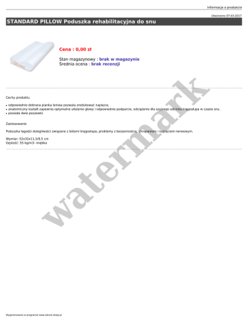 Informacje o produkcie Utworzono 07-03-2017 STANDARD PILLOW Poduszka rehabilitacyjna do snu Cena : 0,00 zł Cechy produktu ● ● ● er m ar k Stan magazynowy : brak w magazynie Średnia ocena : brak recenzji odpowiednio dobrana pianka leniwa pozwala zredukować napięcie, anatomiczny kształt zapewnia optymalne ułożenie głowy i odpowiednie podparcie, odciążenie dla szyjnego odcinka kręgosłupa w czasie snu. posiada dwie poszewki. Zastosowanie Poduszka łagodzi dolegliwości związane z bólami kręgosłupa, problemy z bezsennością, chrapaniem i napięciem nerwowym. w at Wymiar: 52x32x11,5/9,5 cm Gęstość: 55 kg/m3- miękka Wygenerowano w programie www.estore.sklep.pl