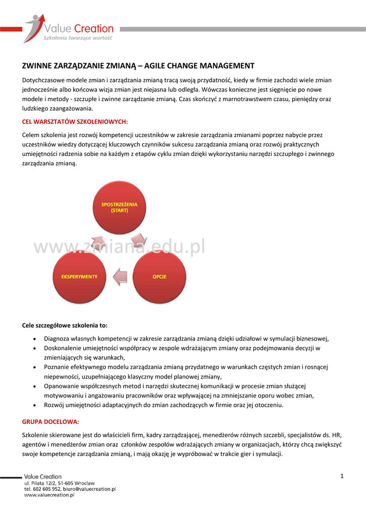 ZWINNE ZARZĄDZANIE ZMIANĄ – AGILE CHANGE MANAGEMENT Dotychczasowe modele zmian i zarządzania zmianą tracą swoją przydatność, kiedy w firmie zachodzi wiele zmian jednocześnie albo końcowa wizja zmian jest niejasna lub odległa. Wówczas konieczne jest sięgnięcie po nowe modele i metody - szczupłe i zwinne zarządzanie zmianą. Czas skończyć z marnotrawstwem czasu, pieniędzy oraz ludzkiego zaangażowania. CEL WARSZTATÓW SZKOLENIOWYCH: Celem szkolenia jest rozwój kompetencji uczestników w zakresie zarządzania zmianami poprzez nabycie przez uczestników wiedzy dotyczącej kluczowych czynników sukcesu zarządzania zmianą oraz rozwój praktycznych umiejętności radzenia sobie na każdym z etapów cyklu zmian dzięki wykorzystaniu narzędzi szczupłego i zwinnego zarządzania zmianą. Cele szczegółowe szkolenia to:      Diagnoza własnych kompetencji w zakresie zarządzania zmianą dzięki udziałowi w symulacji biznesowej, Doskonalenie umiejętności współpracy w zespole wdrażającym zmiany oraz podejmowania decyzji w zmieniających się warunkach, Poznanie efektywnego modelu zarządzania zmianą przydatnego w warunkach częstych zmian i rosnącej niepewności, uzupełniającego klasyczny model planowej zmiany, Opanowanie współczesnych metod i narzędzi skutecznej komunikacji w procesie zmian służącej motywowaniu i angażowaniu pracowników oraz wpływającej na zmniejszanie oporu wobec zmian, Rozwój umiejętności adaptacyjnych do zmian zachodzących w firmie oraz jej otoczeniu. GRUPA DOCELOWA: Szkolenie skierowane jest do właścicieli firm, kadry zarządzającej, menedżerów różnych szczebli, specjalistów ds. HR, agentów i menedżerów zmian oraz członków zespołów wdrażających zmiany w organizacjach, którzy chcą zwiększyć swoje kompetencje zarządzania zmianą, i mają okazję je wypróbować w trakcie gier i symulacji. 1 KORZYŚCI ZE SZKOLENIA: Odnoszące się do obszaru wiedzy przekazywanej na szkoleniu: • • • Rozszerzenie wiedzy uczestników dotyczącej istotnych czynników powodzenia zarządzania zmianą, Zdobycie wiedzy o strategii i taktykach wdrażania zmian w firmie w oparciu o cykl szczupłego zarządzania zmianą, Rozszerzenie wiedzy o metodach diagnozy sytuacji w firmie, wyboru opcji działań, radzenia sobie z reakcjami wobec zmian oraz komunikacji zmian. Odnoszące się do obszaru praktycznych umiejętności: • • • • Zwiększenie umiejętności pozwalających na unikanie istotnych błędów na każdym z etapów cyklu zarządzania zmianą, Udoskonalenie umiejętność wykorzystywania szczupłych i zwinnych taktyk i narzędzi zarządzania zmianą oraz rewizji taktyki w odpowiedzi na zmiany zachodzące w organizacji (instytucji) i reakcje pracowników, Rozwinięcie umiejętności współpracy w zespole kierującym zmianami i wymiany doświadczeń pomiędzy osobami zaangażowanymi w zmiany (sprawdzane w ramach prowadzonej w trakcie szkolenia symulacji menedżerskiej), Rozwinięcie umiejętności komunikowania zmian pracownikom w oparciu o praktyki zwinne (kanwy i wzorce, radiator informacji, spotkania Lean Coffee itp.) Odnoszące się do rozwoju świadomości i budowanych postaw: • • Uświadomienie sobie przez uczestników roli działań podejmowanych przez menedżerów (przełożonych) i agentów zmian na każdym z etapów procesu zmian, Zbudowanie pozytywnego nastawienia do strategii zarządzania zmianą uwzględniającej skuteczne przywództwo, efektywną komunikację zmian oraz partycypację pracowników. METODYKA:       analiza przypadków, ćwiczenia, praca indywidualna i grupowa, gry i symulacje, dyskusja moderowana, krótki wykład. PROGRAM: 1. Współczesne trendy w zmianach organizacyjnych • • • • • Model Lewina to za mało w „burzliwych czasach” - od modelu trzyfazowego do pięciofazowego, Jakie są zachowania pracowników oraz wydajność organizacji na każdym z pięciu etapów procesu zmian, Zmiana paradygmatu zarządzania zmianą w firmie, Model zarządzania zmianą Kottera z 1996 a model Kottera z 2015 roku, Najnowsze trendy w zmianach organizacyjnych – Zwinne zarządzanie zmianą (Agile Change Management) 2 2. Praktyka zarządzania zmianą – symulacja biznesowa Agile Change Masters© v. 2015 • • • Wprowadzenie do symulacji Agile Change Masters©, Postawy pracowników wobec zmian - opór czy odpowiedź na zmiany? Radzenie sobie z różnymi odmianami reakcji na zmiany – przegląd i dobór taktyk, 3. Cykl szczupłego zarządzania zmianą – krok po kroku • • • • Koncepcja zmiany: o wykorzystanie kanwy zmian, o budowanie zaangażowania pracowników w zmiany, Narzędzia i metody używane w fazie diagnozy: o model ADKAR, o nieformalne spotkania Lean Coffee, o retrospektywy, o wywiady z pracownikami i klientami, o badania (np. kultury organizacyjnej, dysfunkcji pracy zespołowej itp.) Wybór właściwych opcji – taktyka wdrożenia: o trzy kluczowe kryteria oceny opcji działania, o klasyfikacja opcji z użyciem listy kontrolnej lub tablicy Kanban, o weryfikacja planu zmiany, Eksperymenty – istota zwinnego i szczupłego zarządzania zmianą: o stawianie hipotez dla eksperymentów (szablon hipotezy), o weryfikacja eksperymentu – poszukiwanie informacji zwrotnych, pomiary, 4. Podsumowanie warsztatów TRENERZY: dr Jarosław Rubin Trener biznesu i konsultant zarządzania. Doktor nauk ekonomicznych w dyscyplinie zarządzanie. Ukończył Politechnikę Wrocławską oraz studia Executive MBA na Akademii Ekonomicznej we Wrocławiu. Zajmował stanowiska związane z zarządzaniem oraz marketingiem i sprzedażą w firmach polskich i międzynarodowych od reprezentanta handlowego i doradcy technicznego, poprzez dyrektora ds. marketingu, do dyrektora-prokurenta spółki. Specjalizuje się w problematyce zarządzania, w szczególności zarządzania zmianą i zarządzania ludźmi oraz sprzedaży i negocjacji. Autor symulacji biznesowej z zakresu zarządzania zmianą "Change Masters