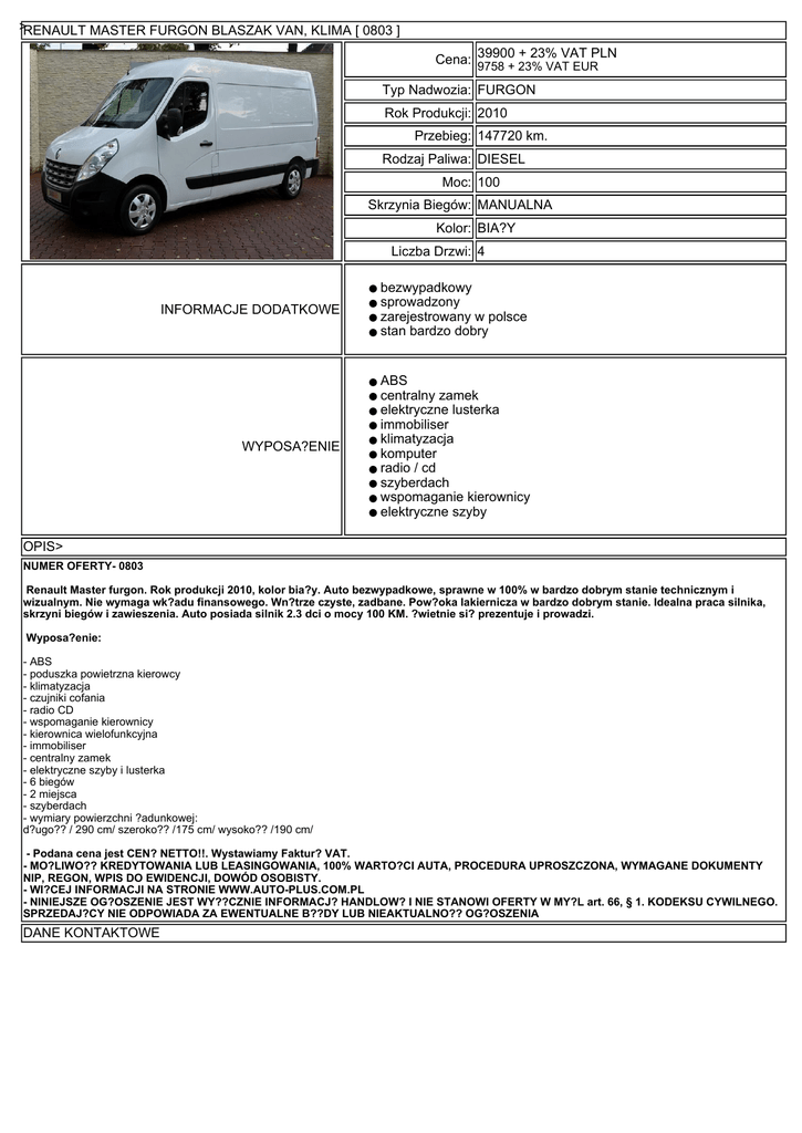 >RENAULT MASTER FURGON BLASZAK VAN, KLIMA [ 0803 ] Cena: 39900 + 23% VAT PLN 9758 + 23% VAT EUR Typ Nadwozia: FURGON Rok Produkcji: 2010 Przebieg: 147720 km. Rodzaj Paliwa: DIESEL Moc: 100 Skrzynia Biegów: MANUALNA Kolor: BIA?Y Liczba Drzwi: 4 INFORMACJE DODATKOWE ● ● ● ● bezwypadkowy sprowadzony zarejestrowany w polsce stan bardzo dobry WYPOSA?ENIE ● ● ● ● ● ● ● ● ● ● ABS centralny zamek elektryczne lusterka immobiliser klimatyzacja komputer radio / cd szyberdach wspomaganie kierownicy elektryczne szyby OPIS> NUMER OFERTY- 0803 Renault Master furgon. Rok produkcji 2010, kolor bia?y. Auto bezwypadkowe, sprawne w 100% w bardzo dobrym stanie technicznym i wizualnym. Nie wymaga wk?adu finansowego. Wn?trze czyste, zadbane. Pow?oka lakiernicza w bardzo dobrym stanie. Idealna praca silnika, skrzyni biegów i zawieszenia. Auto posiada silnik 2.3 dci o mocy 100 KM. ?wietnie si? prezentuje i prowadzi. Wyposa?enie: - ABS - poduszka powietrzna kierowcy - klimatyzacja - czujniki cofania - radio CD - wspomaganie kierownicy - kierownica wielofunkcyjna - immobiliser - centralny zamek - elektryczne szyby i lusterka - 6 biegów - 2 miejsca - szyberdach - wymiary powierzchni ?adunkowej: d?ugo?? / 290 cm/ szeroko?? /175 cm/ wysoko?? /190 cm/ - Podana cena jest CEN? NETTO!!. Wystawiamy Faktur? VAT. - MO?LIWO?? KREDYTOWANIA LUB LEASINGOWANIA, 100% WARTO?CI AUTA, PROCEDURA UPROSZCZONA, WYMAGANE DOKUMENTY NIP, REGON, WPIS DO EWIDENCJI, DOWÓD OSOBISTY. - WI?CEJ INFORMACJI NA STRONIE WWW.AUTO-PLUS.COM.PL - NINIEJSZE OG?OSZENIE JEST WY??CZNIE INFORMACJ? HANDLOW? I NIE STANOWI OFERTY W MY?L art. 66, § 1. KODEKSU CYWILNEGO. SPRZEDAJ?CY NIE ODPOWIADA ZA EWENTUALNE B??DY LUB NIEAKTUALNO?? OG?OSZENIA DANE KONTAKTOWE AUTO-PLUS DEALER SAMOCHODÓW U?YWANYCH ul. Wroclawska 23, 58-309 Walbrzych tel. (+48 74) 66 66 050, tel./fax (+48 74) 66 66 710 tel. kom. (+48) 601 566 226