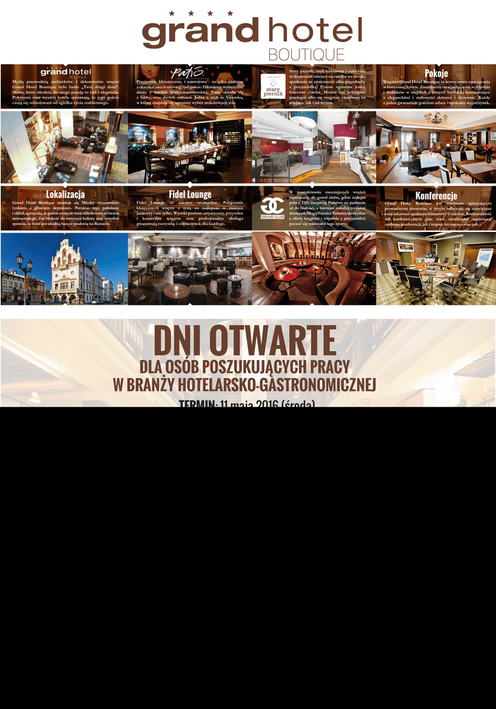 Myślą przewodnią architektów i dekoratorów wnętrz Grand Hotel Boutique było hasło „Twój drugi dom”. Słowa, które idealnie do niego pasują to styl i elegancja. Położenie oraz wystrój hotelu sprawiają, że jego goście czują się odizolowani od zgiełku życia codziennego. Przyjemna, klimatyczna, i nastrojowa - to tylko niektóre z określeń jakich używają nasi goście. Oferujemy wyśmienite dania z kuchni śródziemnomorskiej. Patio składa się z lobby, oraz dwóch antresol. Jedna z nich to Vinoteka, w której znajduje się ogromny wybór unikatowych win. Lokalizacja Fidel Lounge Grand Hotel Boutique znajduje się Miedzy rzeszowskim rynkiem a głównym deptakiem. Pomimo tego położenie i układ, sprawiają, że goście czują sie tutaj odizolowani od świata zewnętrznego. Zaś bliskość do instytucji kultury oraz urzędów sprawia, że hotel jest idealną bazą wypadową na Rzeszów. Fidel Lounge to miejsce szczególne. Połączenie klasycznych wnętrz z tym, co najlepsze w muzyce jazzowej i nie tylko. Wysoki poziom artystyczny, przytulne i kameralne wnętrze oraz profesjonalna obsługa gwarantują rozrywkę i odpoczynek dla każdego. Stary piernik, czyli kawiarnia i cukiernia to doskonałe miejsce na randkę we dwoje, spotkanie ze znajomymi albo pogaduchy z przyjaciółką! Pyszne ogromne kawy, bajeczne ciacha. Można coś schrupać, przekąsić albo się rozgrzać - zarówno na miejscu, jak i na wynos. W poszukiwaniu mocniejszych wrażeń zapraszamy do grand clubu, gdzie najlepsi polscy DJ’e rozgrzeją Państwa na parkiecie aż do białości, a barmani ostudzą rześkimi drinkami. Mogą również Państwo skorzystać z oferty kręgielni i wspólnie z przyjaciółmi poczuć się mistrzami tego sportu. Pokoje Wnętrza Grand Hotel Boutique to nowoczesne rozwiązania w klasycznej formie. Znajdziemy tutaj połączenie wykładzin i dodatków w ciepłych i jasnych barwach, kontrastujące z eleganckimi i stylowymi skórami i drewnem. Każdy z pokoi gwarantuje gościom udany i spokojny wypoczynek. Grand Hotel Boutique jest miejscem sprzyjającym prowadzeniu interesów, w ktrym odbywaję się największe i najciekawsze spotkania biznesowe w mieście. Różnorodność sal konferencyjnych daje wiele możliwości organizacji zarówno konferencji, jak i imprez im towarzyszących. DNI OTWARTE DLA OSÓB POSZUKUJĄCYCH PRACY W BRANŻY HOTELARSKO-GASTRONOMICZNEJ TERMIN: 11 maja 2016 (środa) GODZINY: 13.00 do 17.00 MIEJSCE: Grand Hotel Boutique**** w Rzeszowie, ul. Kościuszki 9, PROGRAM: Godz. 13.00 do 15.00 Spotkanie z Dyrektorem Hotelu, Działem Personalnym i Kadrą Zarządzającą. Zapoznanie ze specyfiką pracy w obiekcie hotelarsko-gastronomicznym. Przedstawienie ofert pracy. Rozmowy kwalifikacyjne z Kierownikami Działów. Godz. 14.00 do 16.00 Zwiedzanie hotelu (pokoje hotelowe, sale konferencyjne, restauracje: STARY PIERNIK, PATIO) Godz.16.00 do 17.00 Dla osób, które nie mają możliwości odwiedzenia hotelu we wcześniejszych godzinach: Drugie Spotkanie z Działem Personalnym i Dyrektorem Hotelu. Zapoznanie ze specyfiką pracy w obiekcie hotelarsko-gastronomicznym. Przedstawienie ofert pracy. Rozmowy kwalifikacyjne z Kierownikami Działów. Grand Hotel Boutique**** Kościuszki 9, Rzeszów 35-030 tel. 533 482 660, e-mail: [email protected] Konferencje