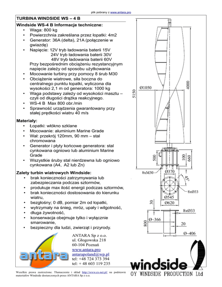 plik pobrany z www.antara.pro TURBINA WINDSIDE WS – 4 B Windside WS-4 B Informacje techniczne: • Waga: 800 kg • Powierzchnia zakreślana przez łopatki: 4m2 • Generator: 36A (delta), 21A (połączenie w gwiazdę) • Napięcie: 12V tryb ładowania baterii 15V 24V tryb ładowania baterii 30V 48V tryb ładowania baterii 60V Przy bezpośrednim obciążeniu rezystancyjnym napięcie zależy od sposobu użytkowania • Mocowanie turbiny przy pomocy 8 śrub M30 • Obciążenie wiatrowe, siła boczna do centralnego punktu łopatki, wyliczona dla wysokości 2,1 m od generatora: 1000 kg • Waga podstawy zależy od wysokości masztu – czyli od długości drążka reakcyjnego. • WS-4 B Max 800 obr./min • Sprawność urządzenia gwarantowany przy stałej prędkości wiatru 40 m/s Materiały: • Łopatki: włókno szklane • Mocowanie: aluminium Marine Grade • Wał: przekrój 120mm, 90 mm – stal chromowana • Generator i płyty końcowe generatora: stal cynkowana ogniowo lub aluminium Marine Grade • Wszystkie śruby stal nierdzewna lub ogniowo cynkowana (A4, A2 lub Zn) Zalety turbin wiatrowych Windside: • brak konieczności zatrzymywania lub zabezpieczania podczas sztormów, • produkuje max ilość energii podczas sztormów, • brak konieczności dostosowania do kierunku wiatru, • bezgłośny; 0 dB, pomiar 2m od łopatki, • wytrzymały na śnieg, mróz, upały i wilgotność, • długa żywotność, • konserwacja obejmuje tylko i wyłącznie smarowanie, • bezpieczny dla ludzi, zwierząt i przyrody. ANTARA Sp z o.o. ul. Głogowska 218 60-104 Poznań www.antara.pro [email protected] tel: +48 724 373 394 tel: + 48 603 119 235 Wszelkie prawa zastrzeżone. Tłumaczenie i skład http://www.ex-net.pl/ na podstawie materiałów Windside dostarczonych przez ANTARA Sp z o.o.