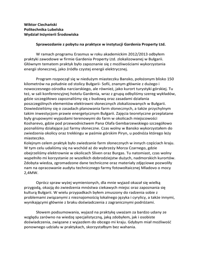 Wiktor Ciechański Politechnika Lubelska Wydział Inżynierii Środowiska Sprawozdanie z pobytu na praktyce w instytucji Gardenia Property Ltd. W ramach programu Erasmus w roku akademickim 2012/2013 odbyłem praktyki zawodowe w firmie Gardenia Property Ltd. zlokalizowanej w Bułgarii. Głównym tematem praktyk było zapoznanie się z możliwościami wykorzystania energii słonecznej, jako źródła czystej energii elektrycznej. Program rozpoczął się w niedużym miasteczku Bansko, położonym blisko 150 kilometrów na południe od stolicy Bułgarii- Sofii, znanym głównie z dużego i nowoczesnego ośrodka narciarskiego, ale również, jako kurort turystyki górskiej. Tu też, w sali konferencyjnej hotelu Gardenia, wraz z grupą odbyliśmy szereg wykładów, gdzie szczegółowo zapoznaliśmy się z budową oraz zasadami działania poszczególnych elementów elektrowni słonecznych zlokalizowanych w Bułgarii. Dowiedzieliśmy się o zasadach planowania farm słonecznych, a także przychylnym takim inwestycjom prawie energetycznym Bułgarii. Zajęcia teoretyczne przeplatane były grupowymi wyjazdami terenowymi do farm w okolicach miejscowości Kosharevo, gdzie pod przewodnictwem Pana Olafa Gembarzewskiego szczegółowo poznaliśmy działające już farmy słoneczne. Czas wolny w Bansko wykorzystałem do zwiedzenia okolicy oraz trekkingu w paśmie górskim Piryn, u podnóża którego leży miasteczko. Kolejnym celem praktyk było zwiedzanie farm słonecznych w innych częściach kraju. W tym celu udaliśmy się na wschód aż do wybrzeży Morza Czarnego, gdzie obejrzeliśmy elektrownie w okolicach Sliven oraz Burgas. Tu natomiast, czas wolny wypełniło mi korzystanie ze wszelkich dobrodziejstw dużych, nadmorskich kurortów. Zdobyta wiedza, zgromadzone dane techniczne oraz materiały zdjęciowe pozwoliły nam na opracowanie audytu technicznego farmy fotowoltaicznej Mladovo o mocy 2,4MW. Oprócz spraw wyżej wymienionych, dla mnie wyjazd okazał się wielką przygodą, okazją do zwiedzenia mnóstwa ciekawych miejsc oraz zapoznania się kulturą Bułgarii. W wielu przypadkach byłem zmuszony do radzenia sobie z problemami związanymi z nieznajomością lokalnego języka i cyrylicy, a także innymi, wynikającymi głównie z braku doświadczenia z zagranicznymi podróżami. Słowem podsumowania, wyjazd na praktykę uważam za bardzo udany ze względu zarówno na wiedzę specjalistyczną, jaką zdobyłem, jak i osobiste doświadczenia, związane z wyjazdem do obcego mi kraju. Gdybym miał możliwość ponownego udziału w praktykach, skorzystałbym bez wahania.