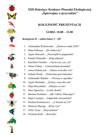 XIII Dziecięcy Konkurs Piosenki Ekologicznej „Śpiewajmy o przyrodzie” KOLEJNOŚĆ PREZENTACJI GODZ. 10.00 – 11.00 Kategoria II – soliści klasy I – III 1. Aleksandra Wiśniewska – „Domowe małe ZOO” 2. Maja Sobieraj – „Do słońca leć” 3. Agata Morzuch - „Niecierpliwe pragnienia” 4. Natalia Matusiak - „Moja planeta” 5. Karolina Chomka – „Tęcza cza, cza, cza” 6. Olena Trabuć - „Uśmiechnięta piosenka” 7. Anna Grabarczyk – „Mama wszystko wie” 8. Izabela Wnuk – „Podwórko pod chmurką” 9. Aleksander Burdon – „Wiosna w ogródku” 10. Agata Michałek – „Kolory wszystko ma” 11. Maja Brzezińska – „Miejsce ze snu” 12. Sara Jagusztyn – „Leśne duszki” 13. Barbara Stoltman – „Jak? Gdzie, Dlaczego?” 14. Maja Czurejno - „Naparstek zrozumienia” 15. Paulina Kononowicz – „Z liściem na 3/4” 16. Martyna Maciąg – „Róża i jeż” 17. Zofia Tyma - „Moja planeta” 18. Zuzanna Kruk – „Rzeczka” GODZ. 11.15 – 12.45 Kategoria III – soliści klasy IV – VI 1. 2. 3. 4. 5. 6. 7. 8. 9. 10. 11. 12. 13. 14. 15. 16. 17. 18. 19. 20. 21. 22. 23. 24. 25. 26. 27. 28. Tomasz Kaliszczak – „Niecierpliwe pragnienia” Wiktoria Pietras – „Burza” Martyna Burak – „Otwórz oczy” Diana Wilczyńska-Fiuk – „?” Cezary Białas – „Chodź pomaluj mój świat” Martyna Wilk – „Niebo” Wiktoria Nowak – „Taka jesień” Heidi Josefsson – „W czasie deszczu dzieci się nudzą” Maria Iwaszkiewicz – „Piosenka ekologiczna” Katarzyna Zajączkowska – „Historia pewnego kota” Aleksandra Kośla – „To chyba maj” Monika Stefaniak – „Wiosenne przebudzenie” Aniela Dąbrowska – „Do słońca” Natalia Ślęzak - „My chcemy grać w zielone” Liwia Cichecka - „Dlaczego?” Oliwia Sobieraj - „Ale jestem” Magdalena Redmerska – „Piosenka na zły czas” Wiktoria Pałasz – „Wietrzyk wieje” Martyna Sławińska – „Na raz, na dwa” Wiktoria Wojciechowska – „Odcienie” Klaudia Urban – „Jesteś jak cień” Kinga Stanke – „Ballada o nocy” Martyna Różycka – „Irracjonalnie” Paulina Wróblewska – „Jak pięknie by mogło być” Martyna Muszyńska – „Rzeka marzeń” Amelia Ekert – „Sen bez twarzy” Marianna Ekert – „Wiosna i deszcz” Monika Jasiak – „A w parkach jesień już” GODZ. 13.15 – 14.15 Kategoria IV – zespoły 1. 2. 3. 4. 5. 6. 7. 8. 9. 10. 11. Eko-Sisters – „Każdy kwiat, to mały świat” Zielone Żabki – „Idzie do nas wiosna” Chichotki – „Do słońca leć” Przedszkole Muzyczne – „Kwiatowa wróżka” Śpiewające Nutki – „Gdzieś tam” Wiolinki 1 – „Zanim zbudzi się” Muszelki - „Kataklizmy” Wiolinki 2 –„Zakręcone nastolatki” Netiro – „Zielona Pani Ziemio” Chórek -„Świat bez wody” Zespół wokalno-taneczny „Takt”- „Bardzo smutna piosenka retro” GODZ. 14.30 – 14.45 Kategoria I – soliści przedszkola 1. Barbara Osada-Sobczyńska – (?) 2. Szymon Puława – Kolorowy Świat 3. Amelia Zielińska – Pszczoła UWAGA! Około godziny 15.00 wręczenie nagród. Po wręczeniu nagród zapraszamy uczestników i opiekunów do pamiątkowego zdjęcia.