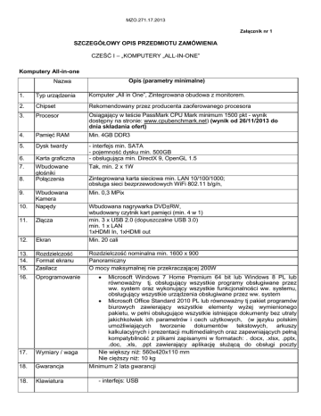 MZO.271.17.2013 Załącznik nr 1 SZCZEGÓŁOWY OPIS PRZEDMIOTU ZAMÓWIENIA CZEŚĆ I – „KOMPUTERY „ALL-IN-ONE” Komputery All-in-one Opis (parametry minimalne) 2. L Nazwa p . urządzenia Typ L Chipset . 3. Procesor Osiągający w teście PassMark CPU Mark minimum 1500 pkt - wynik dostępny na stronie: www.cpubenchmark.net) (wynik od 26/11/2013 do dnia składania ofert) 4. Pamięć RAM Min. 4GB DDR3 5. Dysk twardy 6. Karta graficzna - interfejs min. SATA - pojemność dysku min. 500GB - obsługująca min. DirectX 9, OpenGL 1.5 7. Wbudowane głośniki Połączenia 1. 8. 9. Komputer „All in One”, Zintegrowana obudowa z monitorem. Rekomendowany przez producenta zaoferowanego procesora Tak, min. 2 x 1W Zintegrowana karta sieciowa min. LAN 10/100/1000; obsługa sieci bezprzewodowych WiFi 802.11 b/g/n, 10. Wbudowana Kamera internetowa Napędy Min. 0,3 MPix 11. Złącza 12. Ekran Wbudowana nagrywarka DVD±RW, wbudowany czytnik kart pamięci (min. 4 w 1) min. 3 x USB 2.0 (dopuszczalne USB 3.0) min. 1 x LAN 1xHDMI In, 1xHDMI out Min. 20 cali 13. 14. 15. Rozdzielczość Format ekranu Zasilacz Rozdzielczość nominalna min. 1600 x 900 Panoramiczny O mocy maksymalnej nie przekraczającej 200W 16. Oprogramowanie 17. Wymiary / waga 18. Gwarancja 18. Klawiatura Microsoft Windows 7 Home Premium 64 bit lub Windows 8 PL lub równoważny tj. obsługujący wszystkie programy obsługiwane przez ww. system oraz wykonujący wszystkie funkcjonalności ww. systemu, obsługujący wszystkie urządzenia obsługiwane przez ww. system Microsoft Office Standard 2010 PL lub równoważny tj pakiet programów biurowych zawierający wszystkie elementy wyżej wymienionego pakietu, w pełni obsługujące wszystkie istniejące dokumenty bez utraty jakichkolwiek ich parametrów i cech użytkowych, (w języku polskim umożliwiających tworzenie dokumentów tekstowych, arkuszy kalkulacyjnych i prezentacji multimedialnych oraz zapewniających pełną kompatybilność z plikami zapisanymi w formatach: . docx, .xlsx, .pptx, .doc, .xls, .ppt zawierający aplikację służącą do obsługi poczty oraz umożliwiającą współpracę z serwerem przy pomocy Nie elektronicznej większy niż: 560x420x110 mm protokołu dostępu MAPI/RPC), realizujących wszystkie funkcje przy Nie cięższy niż: 10 kg pomocy tych samych klawiszy na klawiaturze oraz skrótów Minimum 2 lata gwarancji klawiszowych w trakcie jego obsługi – pakiet do celów edukacyjnych (licencja dla szkół). - interfejs: USB MZO.271.17.2013 19. Mysz - interfejs: USB, 20. Dodatkowe - Sterowniki - Słuchawki z mikrofonem 21. Ilość 50 sztuk MZO.271.17.2013 CZEŚĆ II – „KOMPUTERY TYPU „NOTEBOOK” Komputery Notebook Opis (parametry minimalne) 2. L Nazwa p . urządzenia Typ L Chipset . 3. Procesor Osiągający w teście PassMark CPU Mark minimum 1800 pkt - wynik dostępny na stronie: www.cpubenchmark.net) (wynik od 26/11/2013 do dnia składania ofert) 4. Pamięć RAM Min. 4GB DDR3 5. Dysk twardy 6. Karta graficzna - interfejs min. SATA - pojemność dysku min. 500GB - obsługująca min. DirectX 9, OpenGL 1.5 7. Wbudowane głośniki Wbudowany mikrofon Połączenia 1. 8. 9. 10. Przenośny komputer typu notebook. Rekomendowany przez producenta zaoferowanego procesora Tak Tak Zintegrowana karta sieciowa min. LAN 10/100/1000; obsługa sieci bezprzewodowych WiFi 802.11 b/g/n, 11. Wbudowana Kamera internetowa Napędy Min. 0,3 MPix 12. Złącza 13. Ekran Przekątna 17,3’’ 14. 15. 16. Rozdzielczość Format ekranu Oprogramowanie Rozdzielczość nominalna min. 1600 x 900 Panoramiczny Microsoft Windows 7 Home Premium 64 bit lub Windows 8 PL lub równoważny tj. obsługujący wszystkie programy obsługiwane przez ww. system oraz wykonujący wszystkie funkcjonalności ww. systemu, obsługujący wszystkie urządzenia obsługiwane przez ww. system Microsoft Office Standard 2010 PL lub równoważny tj pakiet programów biurowych zawierający wszystkie elementy wyżej wymienionego pakietu, w pełni obsługujące wszystkie istniejące dokumenty bez utraty jakichkolwiek ich parametrów i cech użytkowych, (w języku polskim umożliwiających tworzenie dokumentów tekstowych, arkuszy kalkulacyjnych i prezentacji multimedialnych oraz zapewniających pełną kompatybilność z plikami zapisanymi w formatach: . docx, .xlsx, .pptx, .doc, .xls, .ppt zawierający aplikację służącą do obsługi poczty elektronicznej oraz umożliwiającą współpracę z serwerem przy pomocy protokołu dostępu MAPI/RPC), realizujących wszystkie funkcje przy pomocy tych samych klawiszy na klawiaturze oraz skrótów klawiszowych w trakcie jego obsługi – pakiet do celów edukacyjnych (licencja dla szkół). Wbudowana nagrywarka DVD±RW, wbudowany czytnik kart pamięci min. 3 x USB 2.0 (dopuszczalne USB 3.0) 1 x LAN, 1x HDMI, 1xVGA MZO.271.17.2013 17. Gwarancja Minimum 2 lata gwarancji 20. Dodatkowe - Sterowniki - Mysz optyczna lub laserowa (USB lub bezprzewodowa) 21. Ilość 25 sztuk