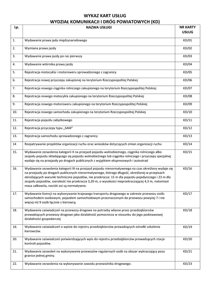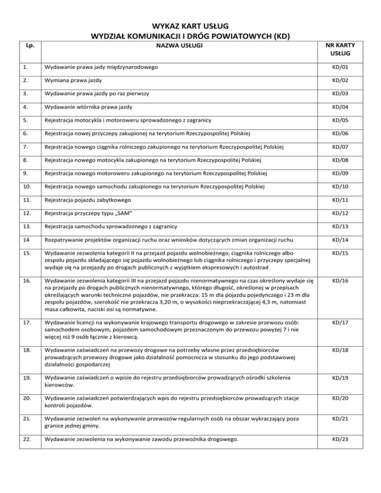 WYKAZ KART USŁUG WYDZIAŁ KOMUNIKACJI I DRÓG POWIATOWYCH (KD) Lp. NAZWA USŁUGI NR KARTY USŁUG 1. Wydawanie prawa jady międzynarodowego KD/01 2. Wymiana prawa jazdy KD/02 3. Wydawanie prawa jazdy po raz pierwszy KD/03 4. Wydawanie wtórnika prawa jazdy KD/04 5. Rejestracja motocykla i motoroweru sprowadzonego z zagranicy KD/05 6. Rejestracja nowej przyczepy zakupionej na terytorium Rzeczypospolitej Polskiej KD/06 7. Rejestracja nowego ciągnika rolniczego zakupionego na terytorium Rzeczypospolitej Polskiej KD/07 8. Rejestracja nowego motocykla zakupionego na terytorium Rzeczypospolitej Polskiej KD/08 9. Rejestracja nowego motoroweru zakupionego na terytorium Rzeczypospolitej Polskiej KD/09 10. Rejestracja nowego samochodu zakupionego na terytorium Rzeczypospolitej Polskiej KD/10 11. Rejestracja pojazdu zabytkowego KD/11 12. Rejestracja przyczepy typu „SAM” KD/12 13. Rejestracja samochodu sprowadzonego z zagranicy KD/13 14 Rozpatrywanie projektów organizacji ruchu oraz wniosków dotyczących zmian organizacji ruchu KD/14 15. Wydawanie zezwolenia kategorii II na przejazd pojazdu wolnobieżnego, ciągnika rolniczego albo zespołu pojazdu składającego się pojazdu wolnobieżnego lub ciągnika rolniczego i przyczepy specjalnej wydaje się na przejazdy po drogach publicznych z wyjątkiem ekspresowych i autostrad KD/15 16. Wydawanie zezwolenia kategorii III na przejazd pojazdu nienormatywnego na czas określony wydaje się na przejazdy po drogach publicznych nienormatywnego, którego długość, określonej w przepisach określających warunki techniczne pojazdów, nie przekracza: 15 m dla pojazdu pojedynczego i 23 m dla zespołu pojazdów, szerokość nie przekracza 3,20 m, o wysokości nieprzekraczającej 4,3 m, natomiast masa całkowita, naciski osi są normatywne. KD/16 17. Wydawanie licencji na wykonywanie krajowego transportu drogowego w zakresie przewozu osób: samochodem osobowym, pojazdem samochodowym przeznaczonym do przewozu powyżej 7 i nie więcej niż 9 osób łącznie z kierowcą. KD/17 18. Wydawanie zaświadczeń na przewozy drogowe na potrzeby własne przez przedsiębiorców prowadzących przewozy drogowe jako działalność pomocnicza w stosunku do jego podstawowej działalności gospodarczej KD/18 19. Wydawanie zaświadczeń o wpisie do rejestru przedsiębiorców prowadzących ośrodki szkolenia kierowców. KD/19 20. Wydawanie zaświadczeń potwierdzających wpis do rejestru przedsiębiorców prowadzących stacje kontroli pojazdów. KD/20 21. Wydawanie zezwoleń na wykonywanie przewozów regularnych osób na obszar wykraczający poza granice jednej gminy. KD/21 22. Wydawanie zezwolenia na wykonywanie zawodu przewoźnika drogowego. KD/23