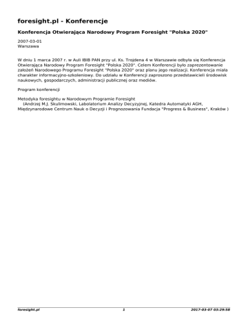 foresight.pl - Konferencje Konferencja Otwierająca Narodowy Program Foresight "Polska 2020" 2007-03-01 Warszawa W dniu 1 marca 2007 r. w Auli IBIB PAN przy ul. Ks. Trojdena 4 w Warszawie odbyła się Konferencja Otwierająca Narodowy Program Foresight "Polska 2020". Celem Konferencji było zaprezentowanie założeń Narodowego Programu Foresight "Polska 2020" oraz planu jego realizacji. Konferencja miała charakter informacyjno-szkoleniowy. Do udziału w Konferencji zaproszono przedstawicieli środowisk naukowych, gospodarczych, administracji publicznej oraz mediów. Program konferencji Metodyka foresightu w Narodowym Programie Foresight (Andrzej M.J. Skulimowski, Labolatorium Analizy Decyzyjnej, Katedra Automatyki AGH, Międzynarodowe Centrum Nauk o Decyzji i Prognozowania Fundacja "Progress & Business", Kraków ) foresight.pl 1 2017-03-07 03:29:58